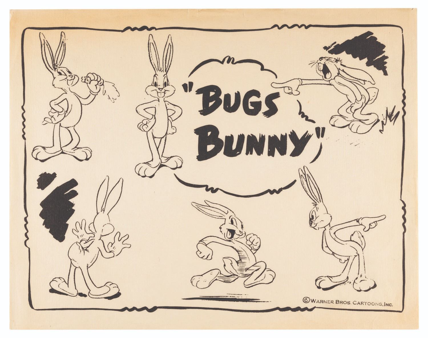 (Warner Bros., 1940s) An original photostat model sheet of Bugs Bunny as he appeared from 1942 to 1948. Model sheets such as this were distributed to animators and crew working on the film to ensure character design continuity. Measuring 11” x 14”, the model sheet is in good condition, with pinholes from production use, light creasing and edge wear, and tears measuring between 0.25” and 0.5” along the top edge which do not affect the image area.