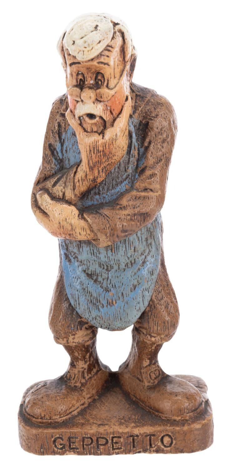 (Multi Products, 1940s) A Geppetto from “Pinocchio” faux wood resin figurine, manufactured by Multi Products of Chicago. Measuring 2.5” x 1.5” x 5.5” tall, the figurine is in good condition with typical paint loss, scuffs, wear, and discoloration from age.