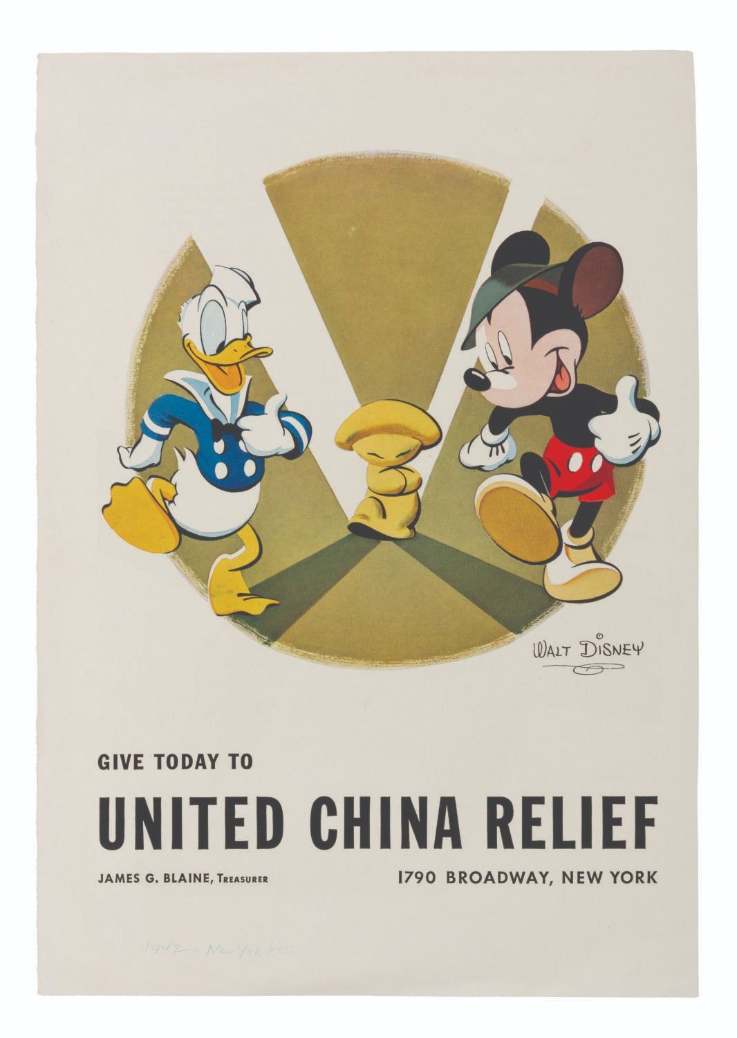 (New Yorker, 1942) A New Yorker magazine ad featuring Mickey Mouse, Donald Duck, and a dancing mushroom from "Fantasia," encouraging Americans to donate to United China Relief. Measuring 8.5" x 12", the ad displays in very good condition with edge wear, light creases, and "1942 - New Yorker" written in blue ink near the bottom.