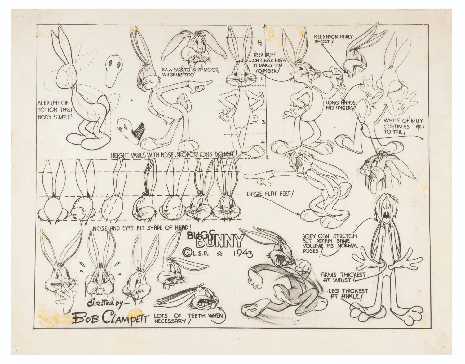 (Schlesinger, 1943) A production-used photostat model sheet of Bugs Bunny, dated 1943 and used by Bob Clampett’s unit at the Studio. Measuring 11” x 14”, the sheet is in very good condition with edge wear, creasing, pinholes, adhesive residue, and light discoloration from age.
