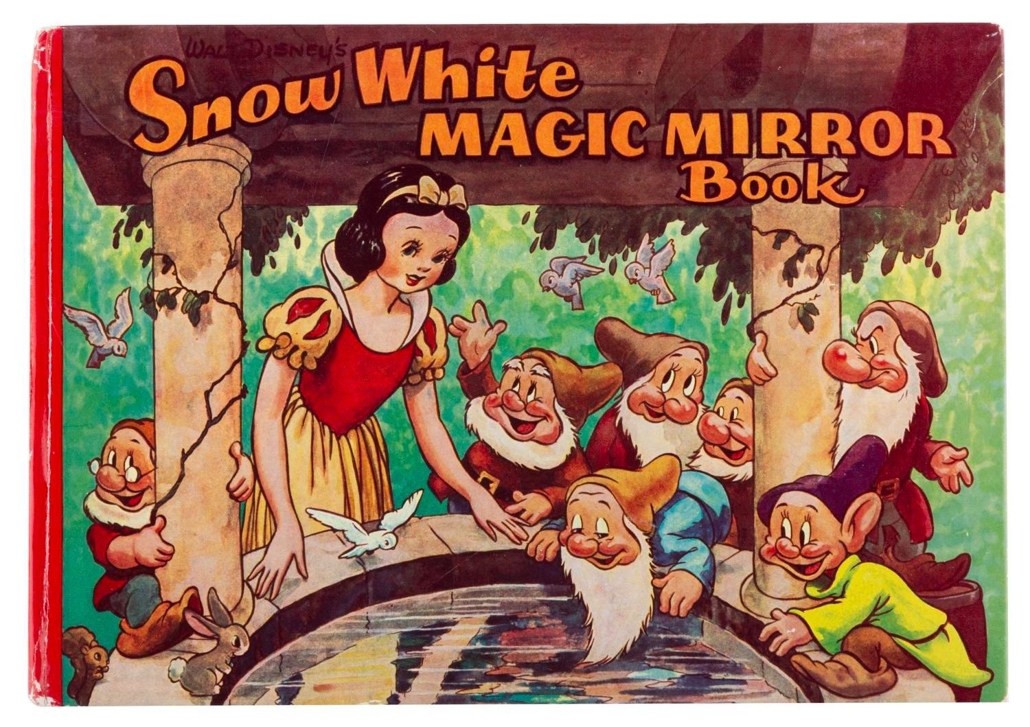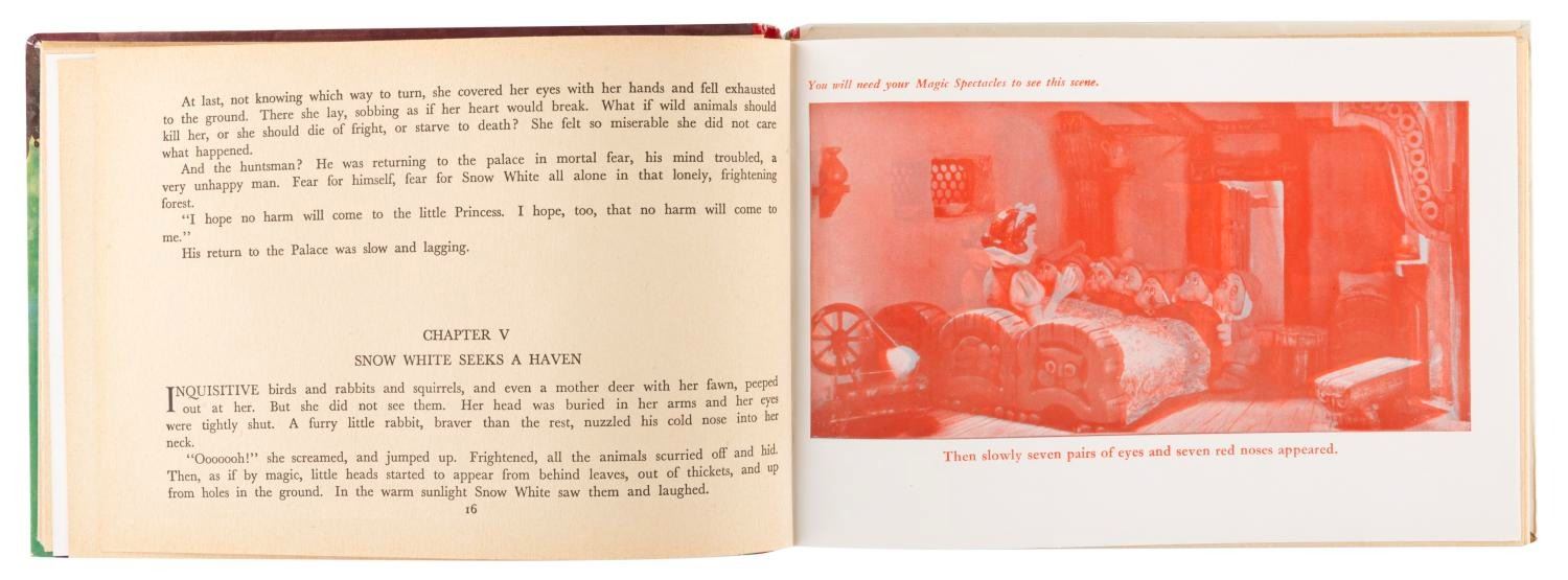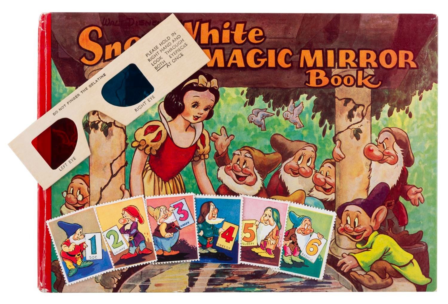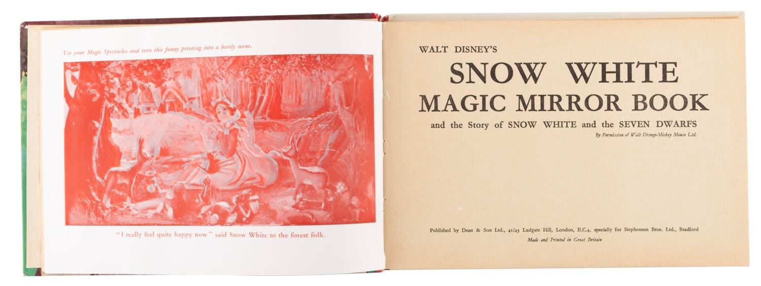 (Dean & Son, 1943) A Snow White Magic Mirror Book, offered as a giveaway by Stephenson Floor Polish and Furniture Cream. The book includes 3-D glasses to view six special images inside, and seven of the stamps one would collect to send away for the book. Measuring 6.75" x 10" the book is in very good condition with light wear from handling and age.