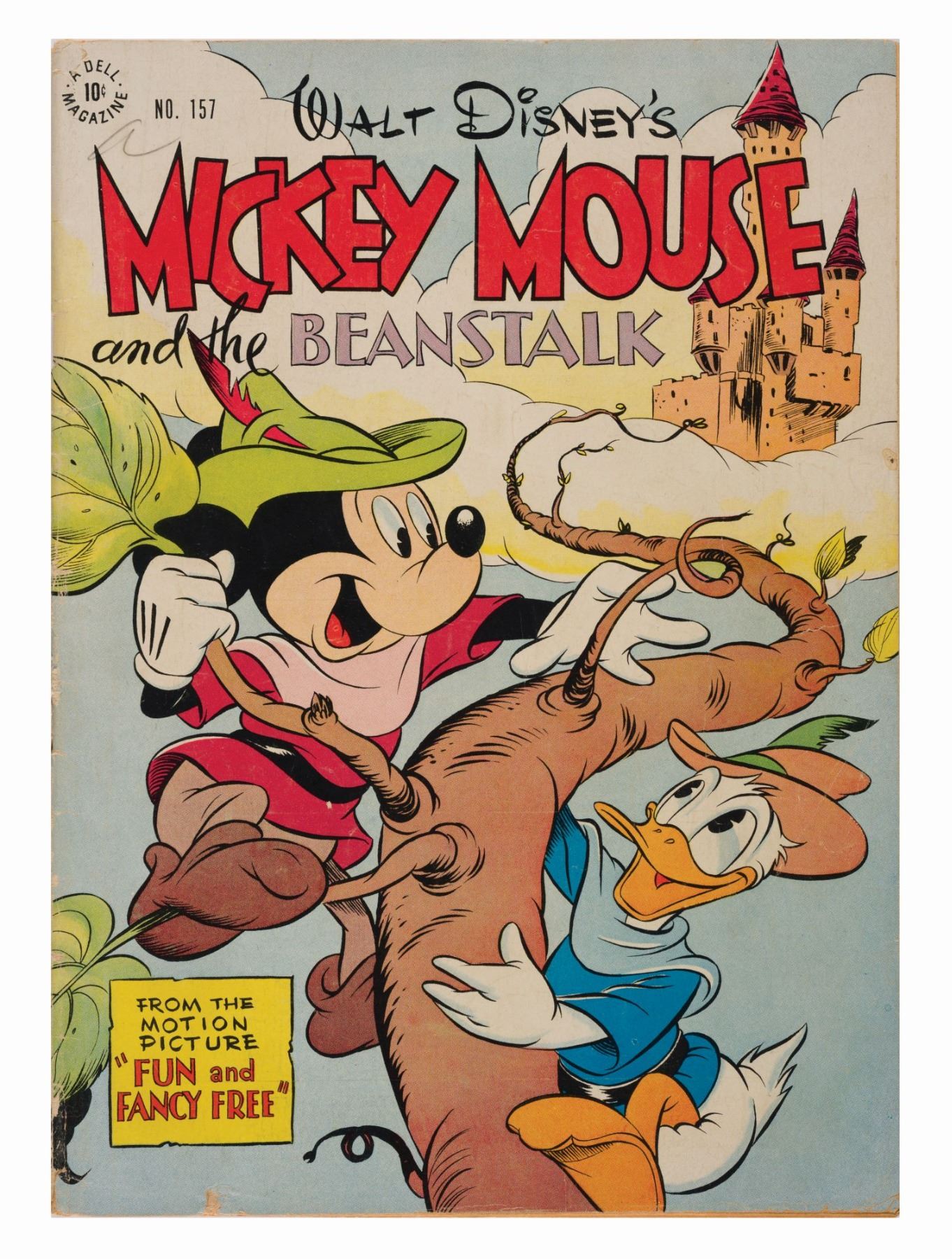 (Dell, 1947) A copy of "Walt Disney's Mickey Mouse and the Beanstalk" comic book no. 157. Measuring 7.25" x 10.25", the comic is in good condition, with edge wear including chipping at the bottom and spine, a pencil mark to the cover, and discoloration to the pages from age.
