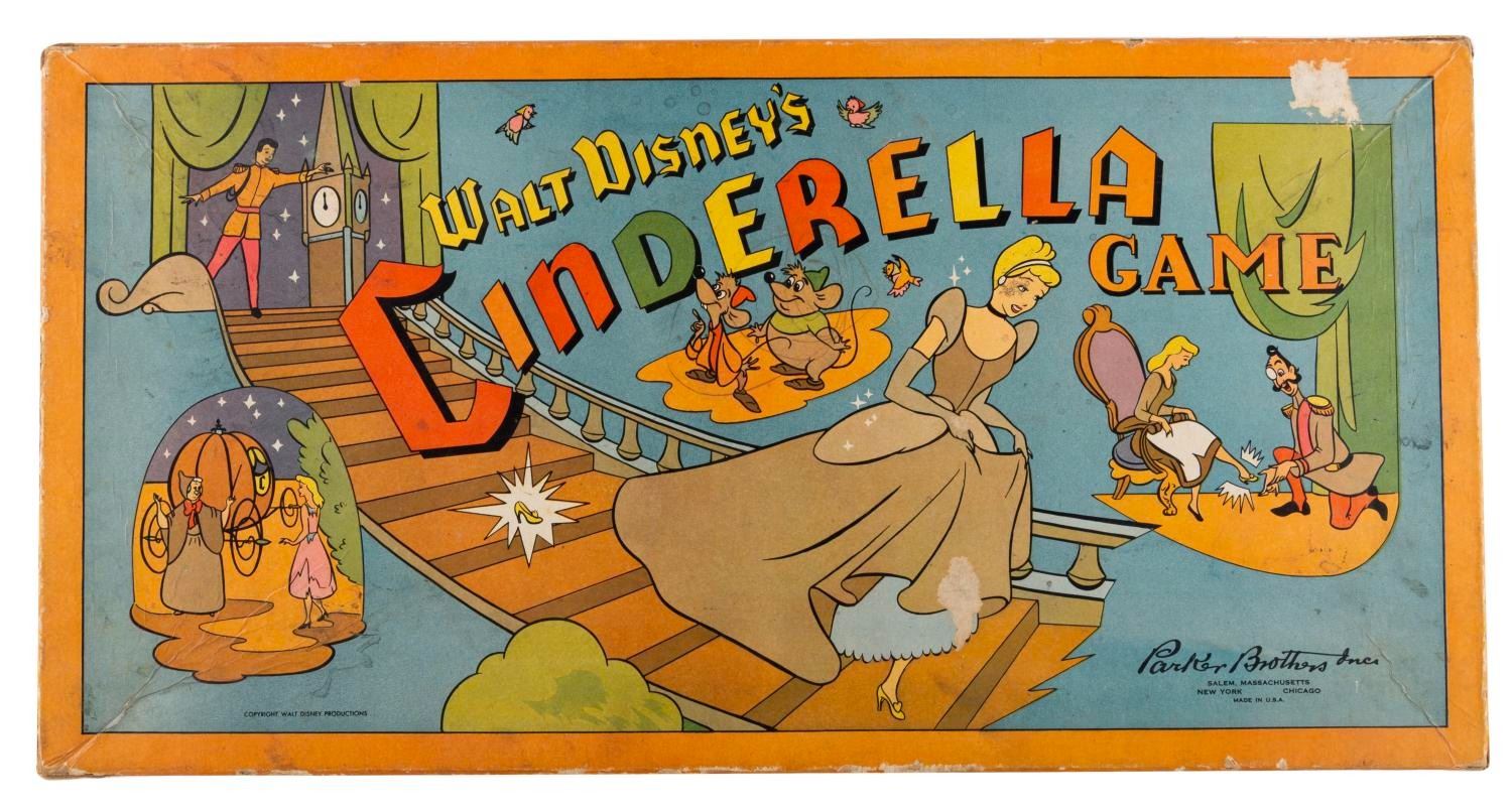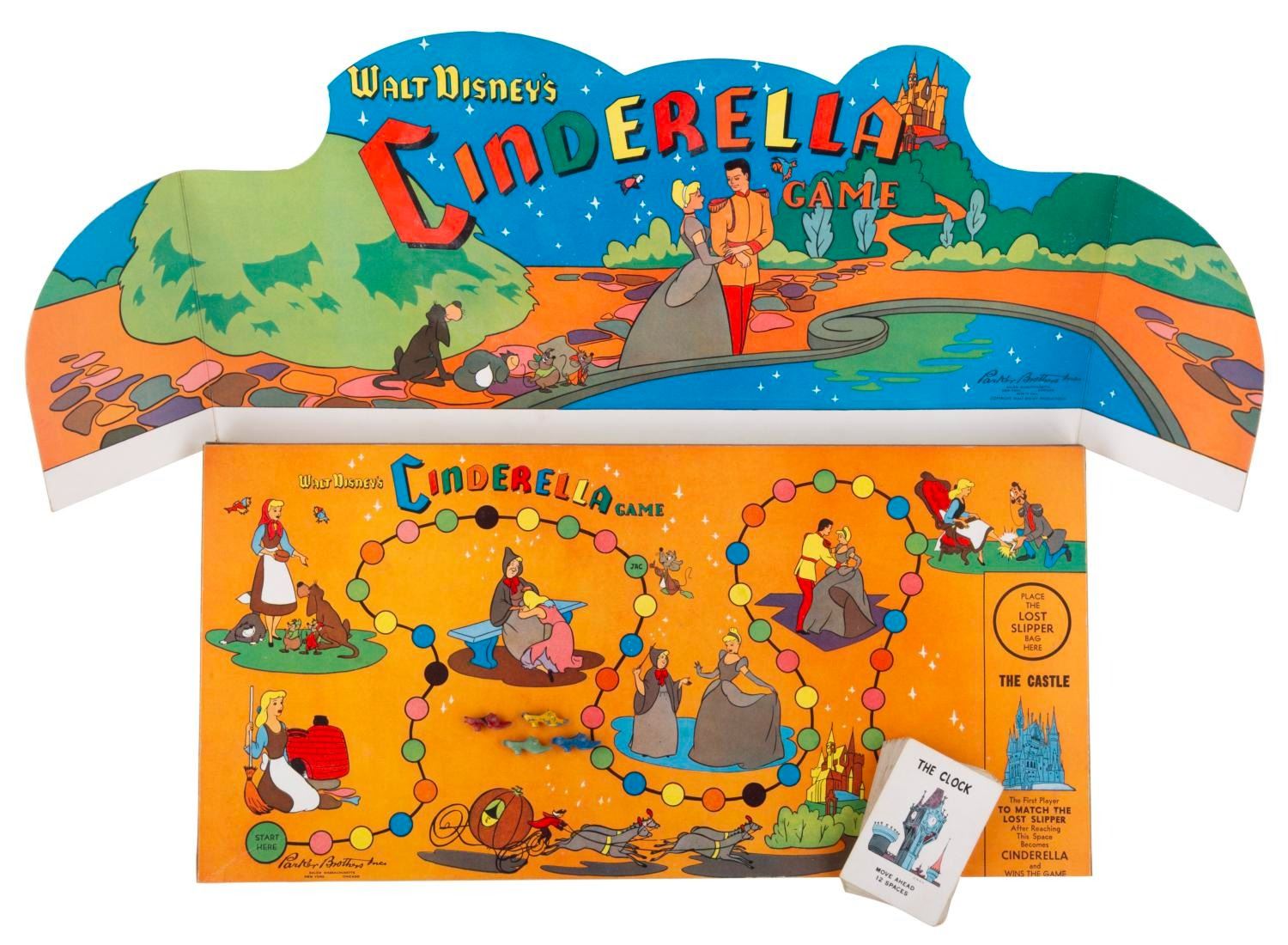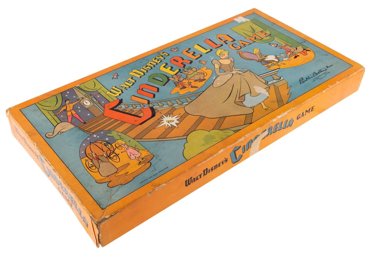 (Parker Brothers, 1950) A Walt Disney's "Cinderella" board game, produced at the time of the film’s first release. The set includes the original box, backdrop, complete deck of 18 cards, and four metal slipper tokens, in the original box. Missing from the game are a second set of slipper tokens, a lost slipper bag, and a wand. Measuring 19.25" x 9.75" x 1.75" overall, the game is in good condition, with wear to the box including two split corners to the lid, pencil scribbles, spots of paper loss, edge wear, and soiling. The board and backdrop are in very good to fine condition, and the slipper tokens and cards are in good condition with wear from use.