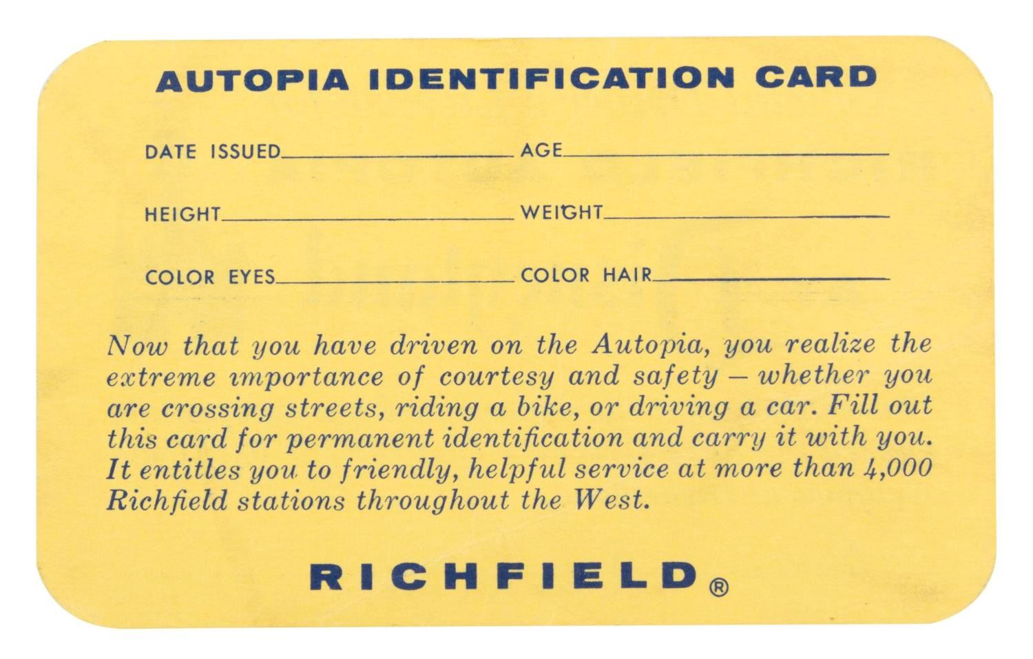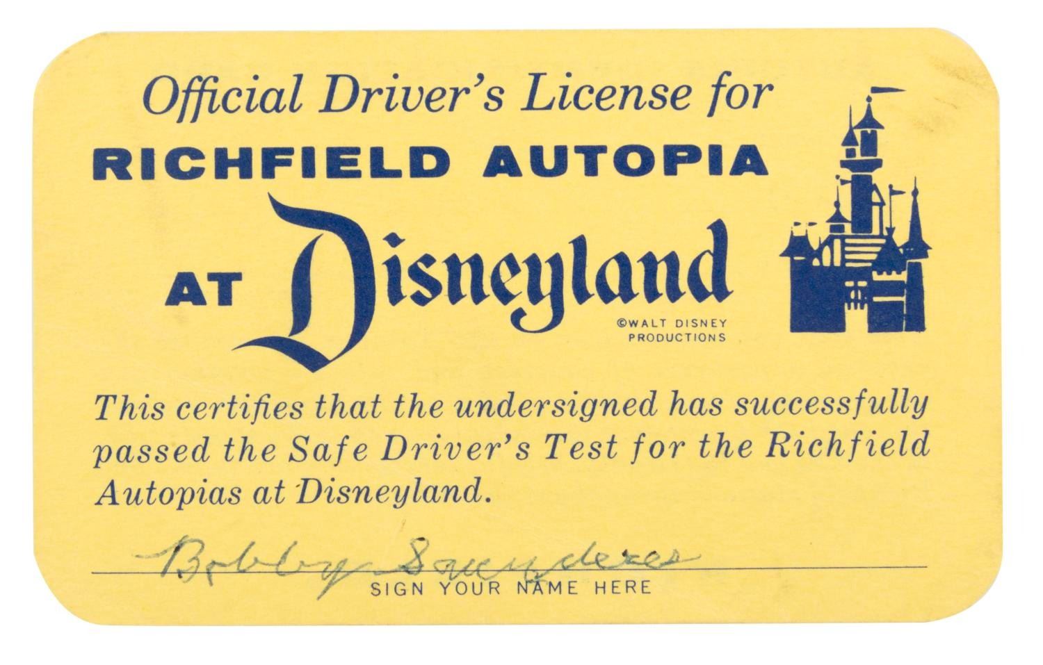 (Disneyland, 1950s) An Official Driver's License for the Richfield Autopia at Disneyland. Measuring 2.25” x 3.75”, the license displays in good condition with a name written on the bottom in pen and light edge wear and smudging.