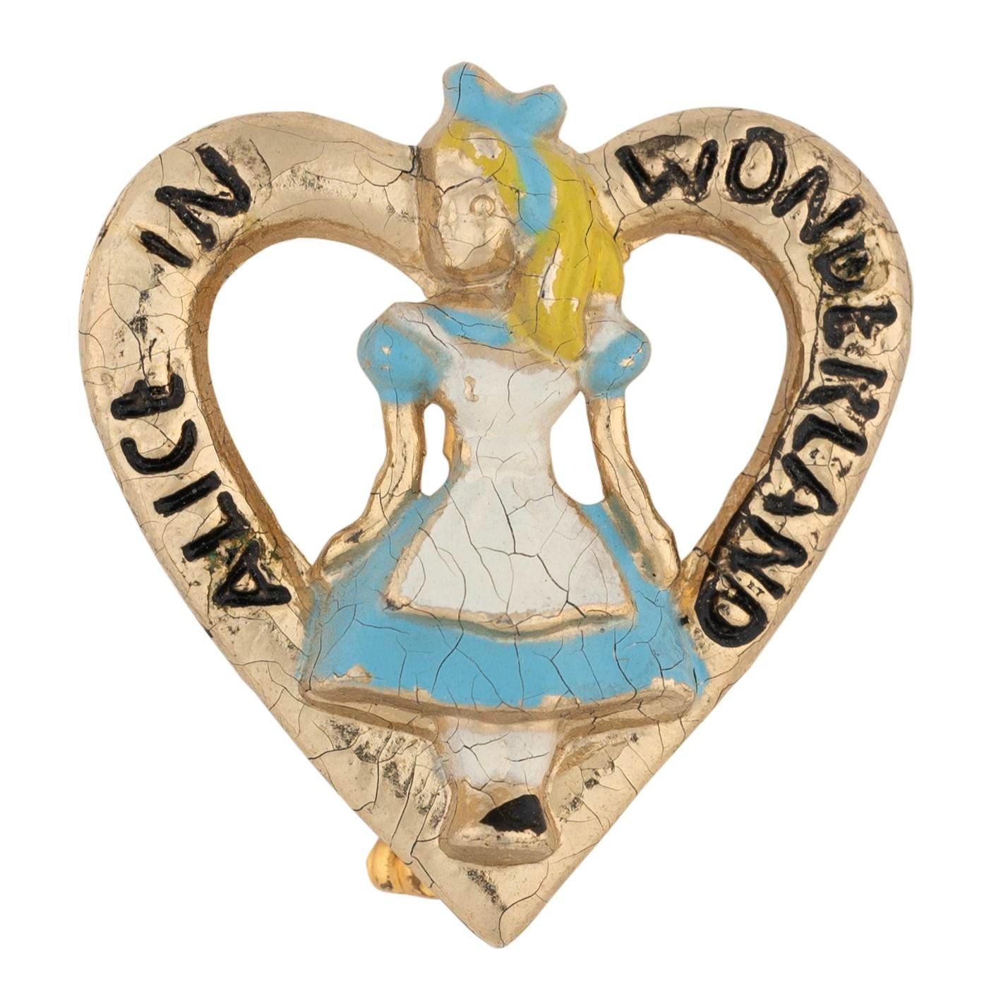 (Eastern Jewelry Mfg. Co., 1951) A heart-shaped pin of Alice from Walt Disney's "Alice in Wonderland" produced by Eastern Jewelry Mfg. Co. alongside the film's theatrical release. Measuring 1" x 1", the pin is in good condition with crazing, paint loss, scuffs, and wear.
