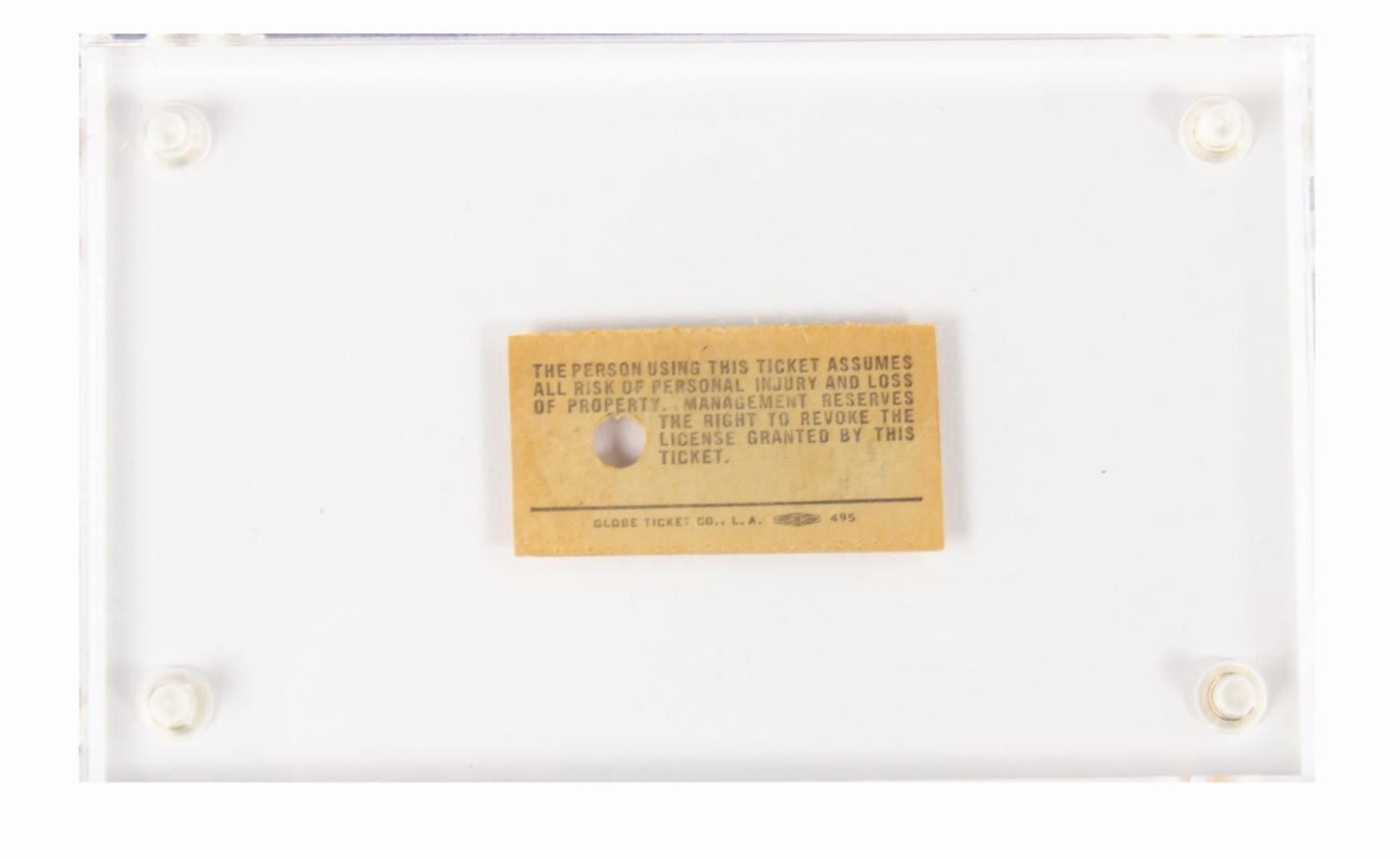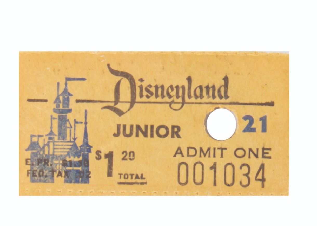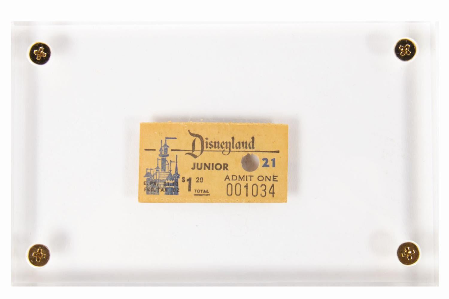 (Disneyland, 1950s) An early junior admission ticket sold at the original Disneyland ticket booths. The ticket is numbered 001034 and lists the price at the time of purchase as $1.20. This ticket was strictly for Park admission and not for “A” through “E” ticket attractions. Measuring 1" x 2" in a 3.5” x 5.75” acrylic display, the ticket is in very good condition with light wear, while the display is in fair condition with heavy surface scratches.