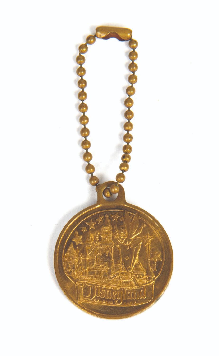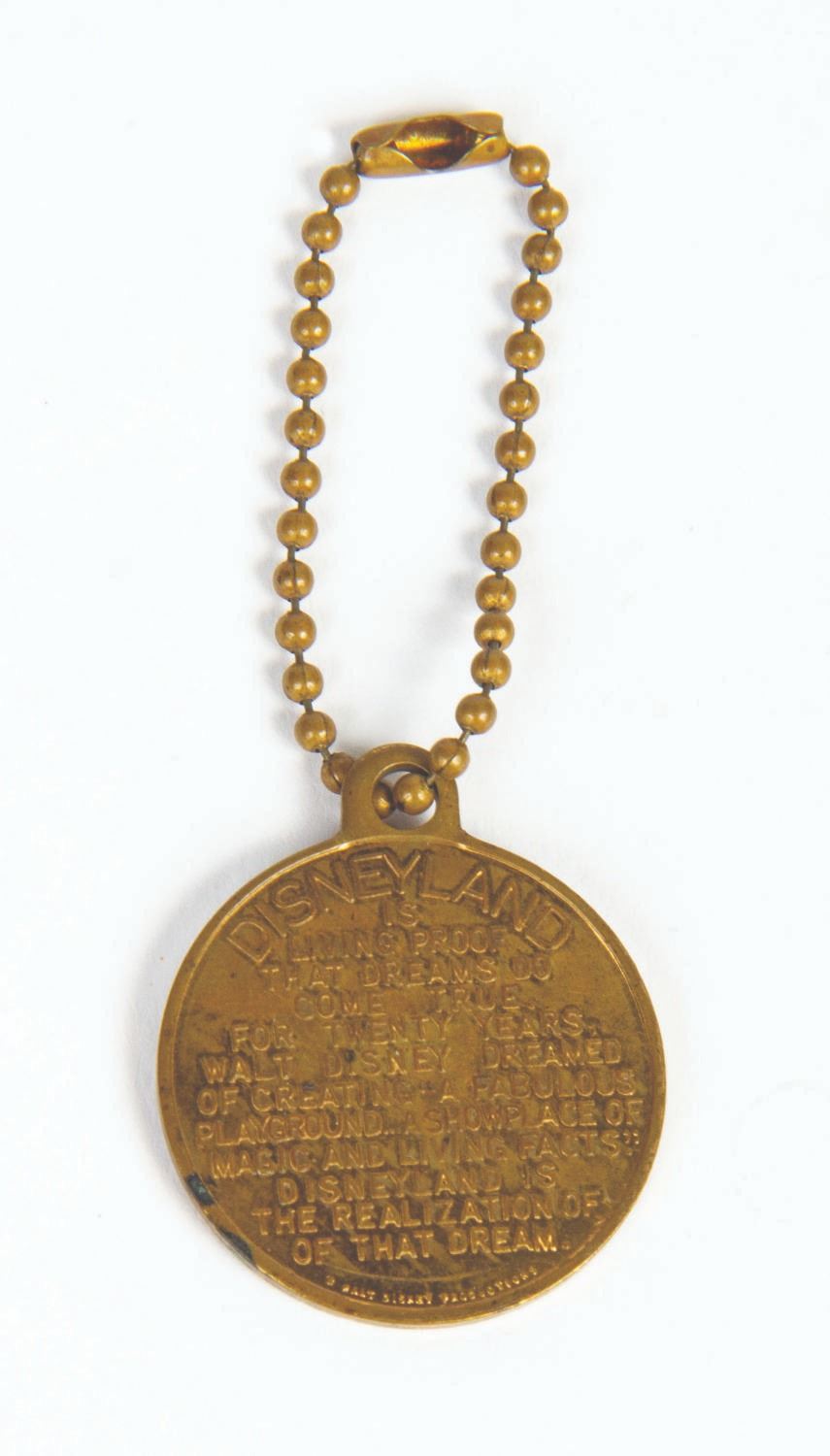 (Disneyland, 1950s) An early souvenir keychain featuring Tinker Bell sprinkling pixie dust above Sleeping Beauty Castle, with a passage about Walt creating Disneyland on the reverse. Measuring 1.25" in diameter, the keychain is in good condition with wear from handling.