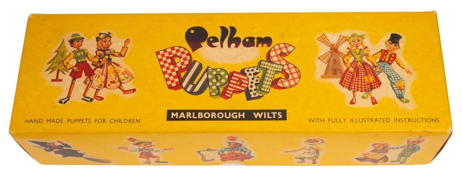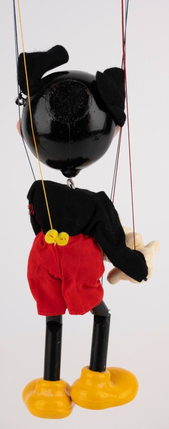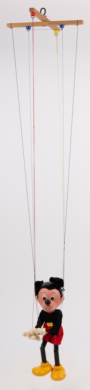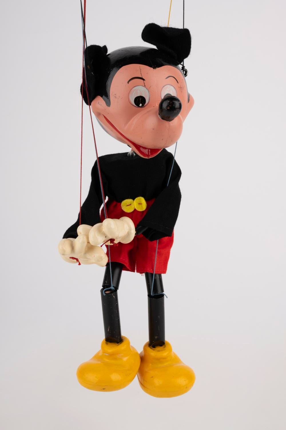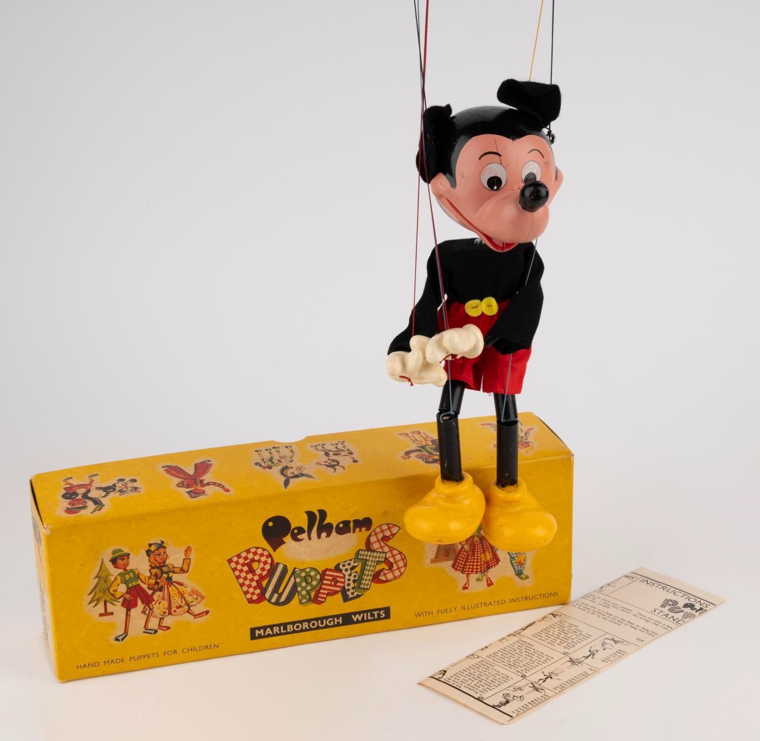 (Pelham Puppets, 1950s) A rare early Mickey Mouse Marionette by Pelham Puppets of England, with the original box and instructions. The puppet standing 10" tall (not counting strings) is in very good condition, with slight scuffs to the face. The 2.75" x 3.75" x 13" box is in very good condition with wear from age. The instruction sheet is complete, with broken perforations along one side of the still-attached form.