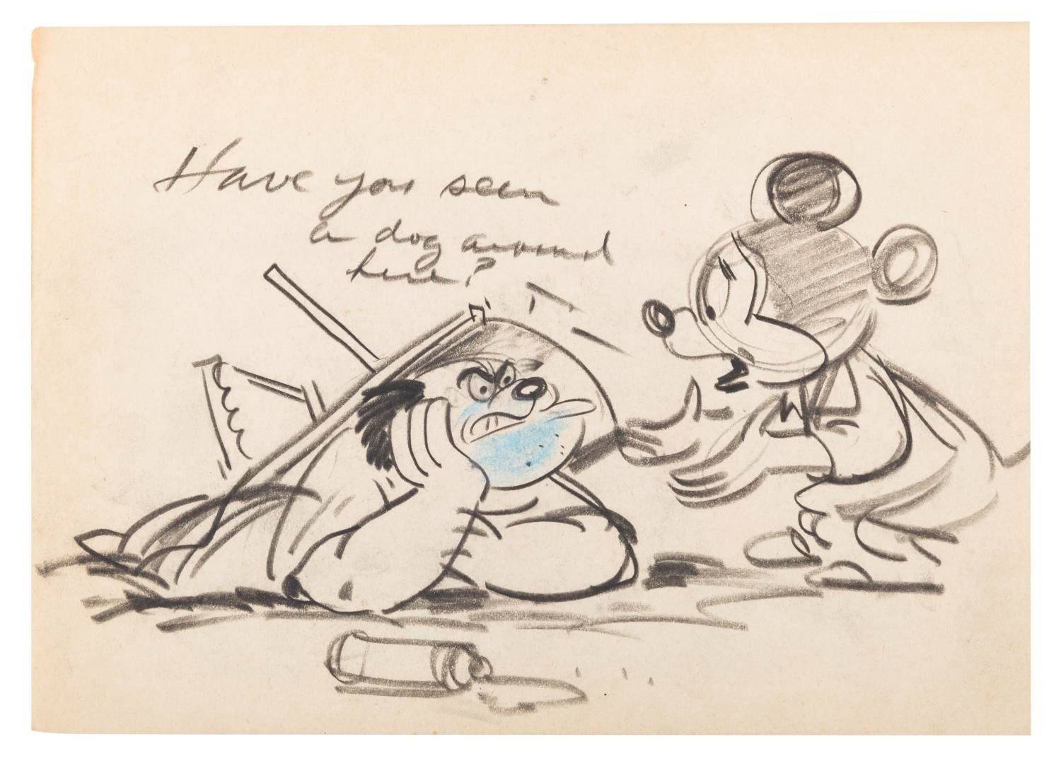 (Disney, 1950s) A storyboard panel of Mickey Mouse from an unknown production. Measuring 6" x 8.25", the drawing accomplished in grease pencils and pastels is in very good production-used condition.