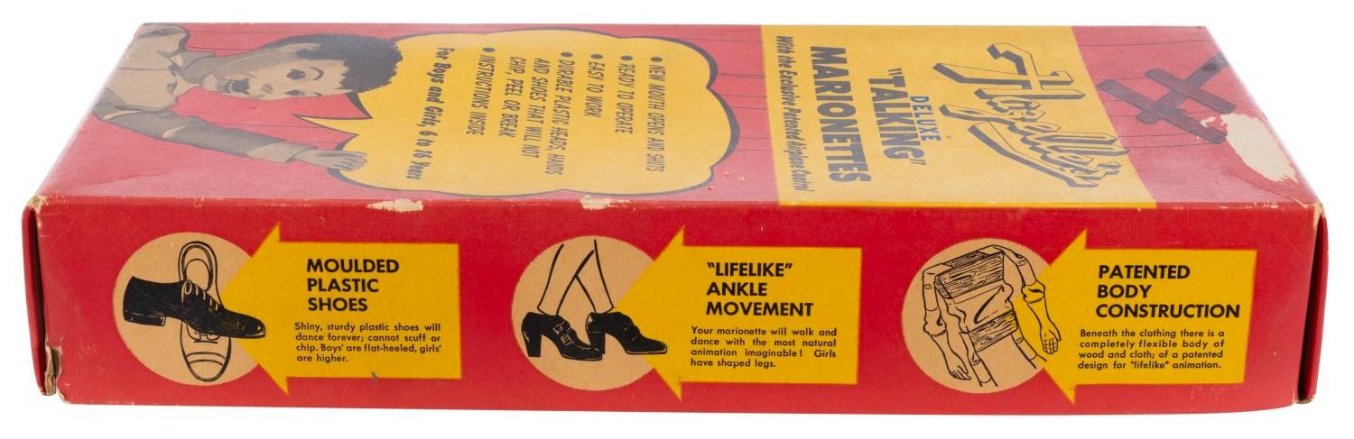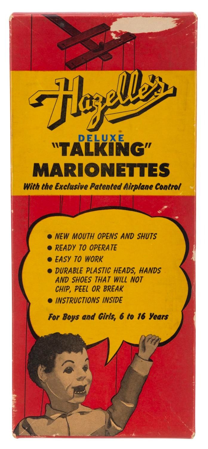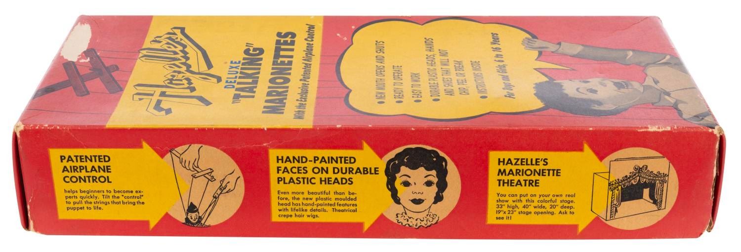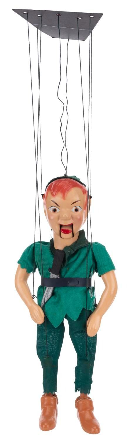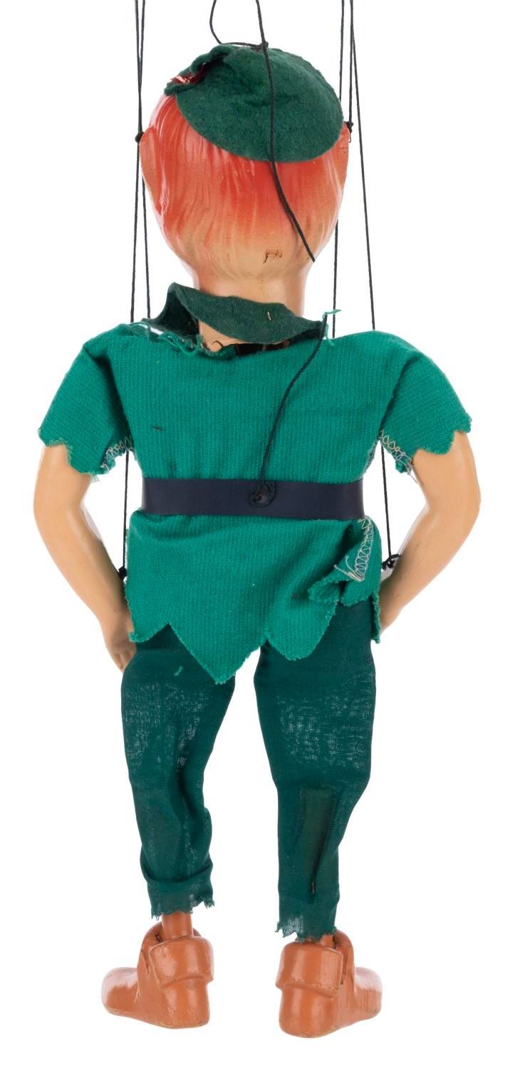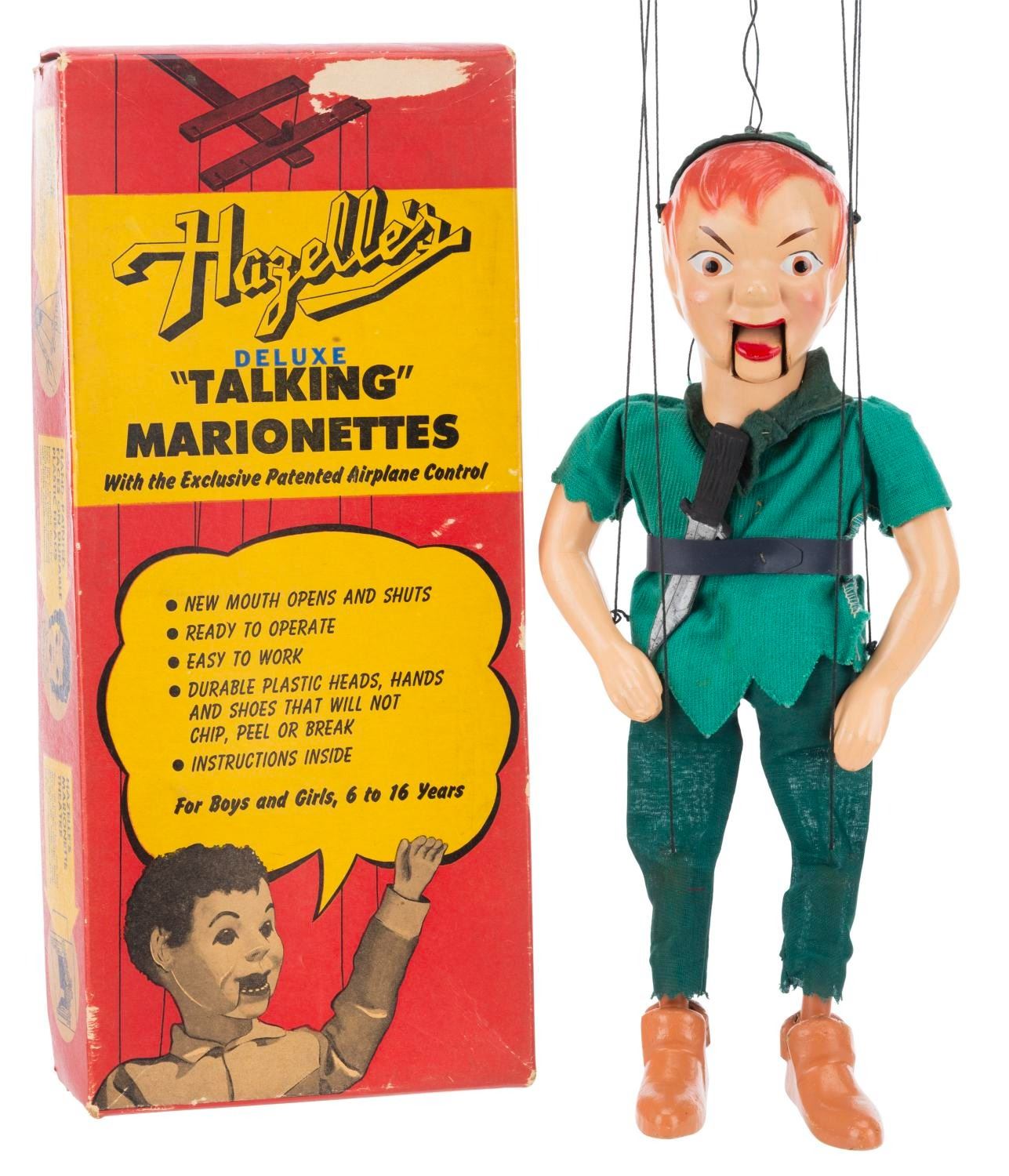 (Disney, 1950s) A composition Peter Pan marionette with talking feature. Although stored in a Hazelle Indian Chief marionette box, the manufacturer of this Disney-style Pan is unknown. Standing 13.75" tall, the marionette is in very good condition with wear from use and age, and the string for the talking feature is included but unconnected. The box is in good condition with typical wear, one split corner, and a 3" strip of paper loss at the top.