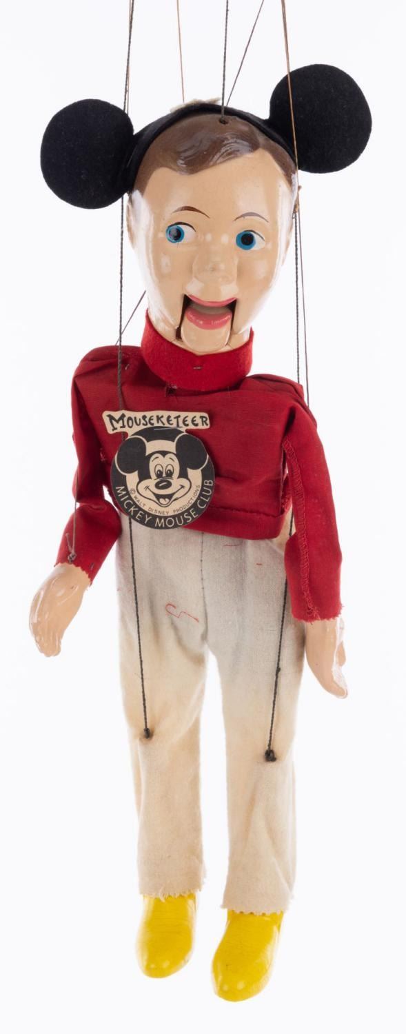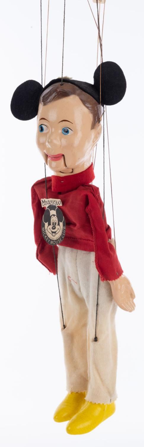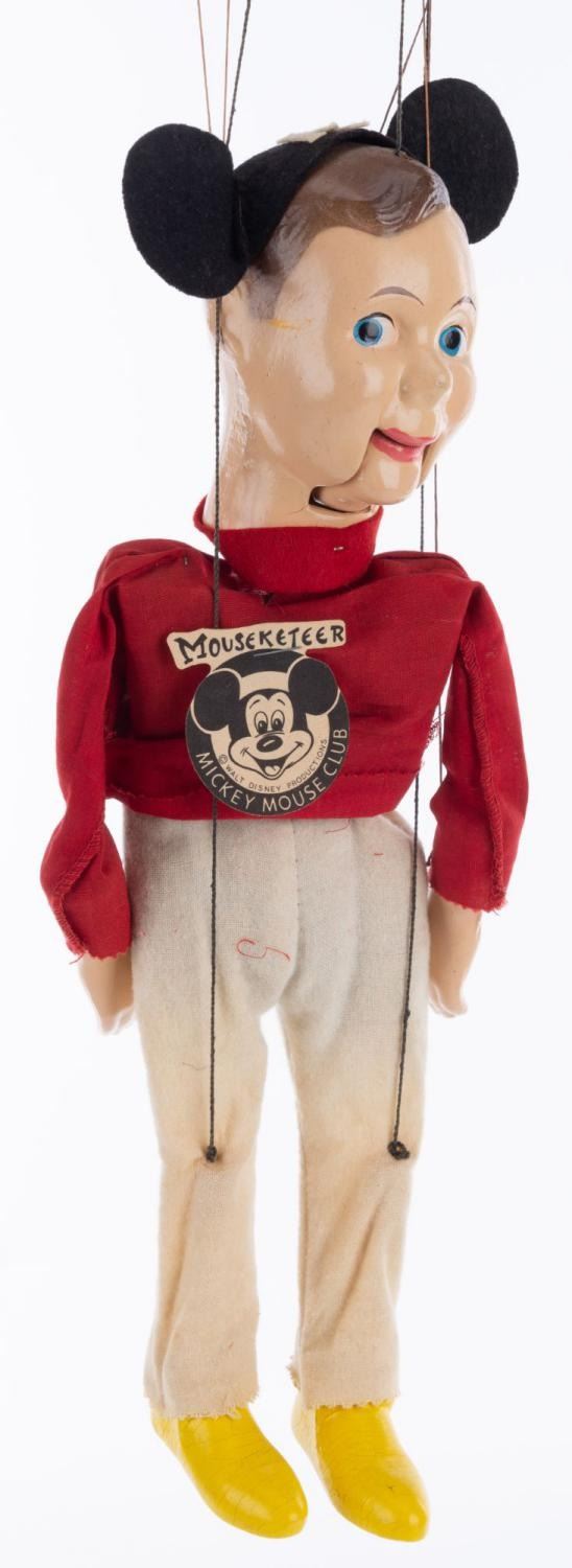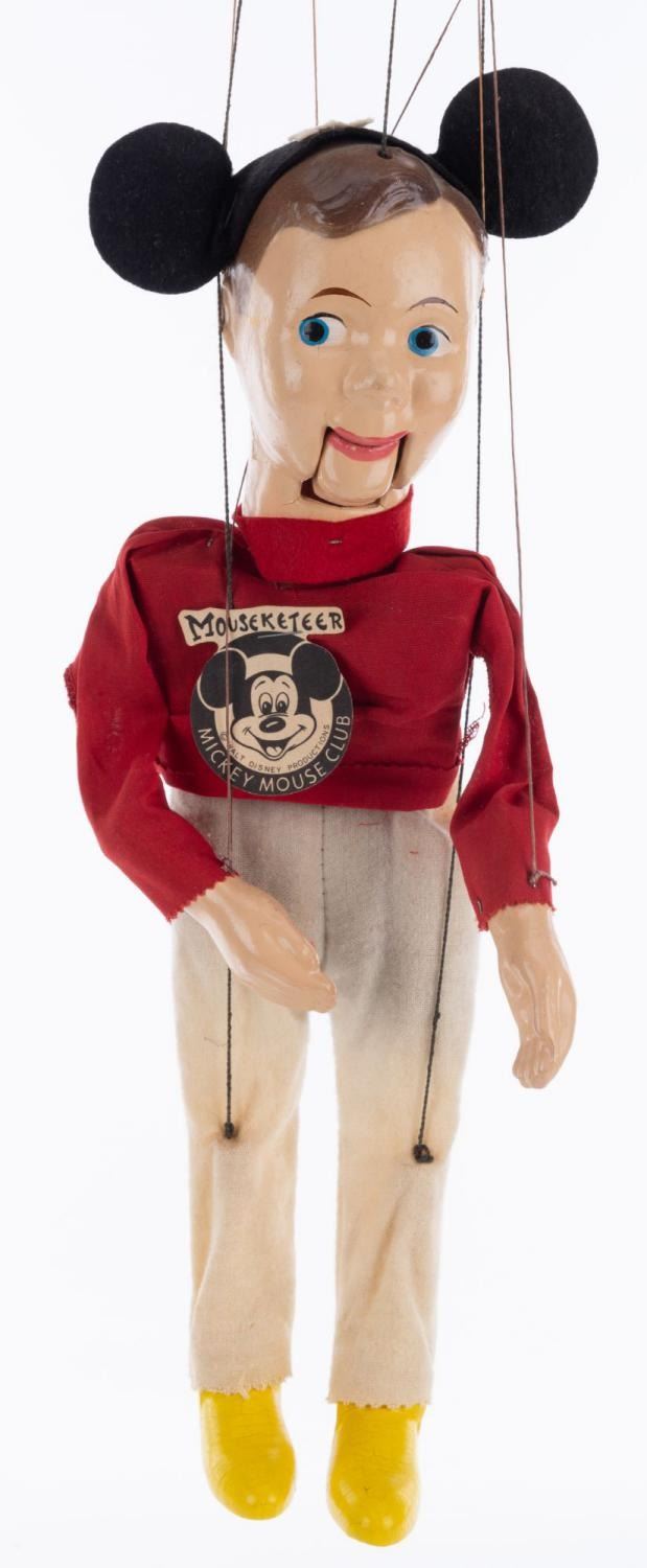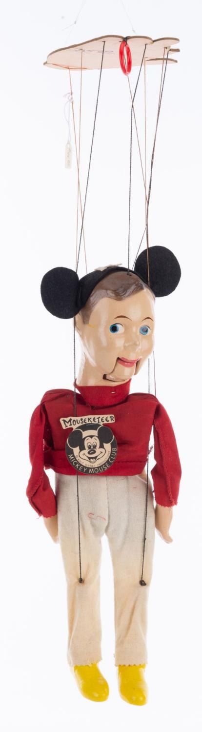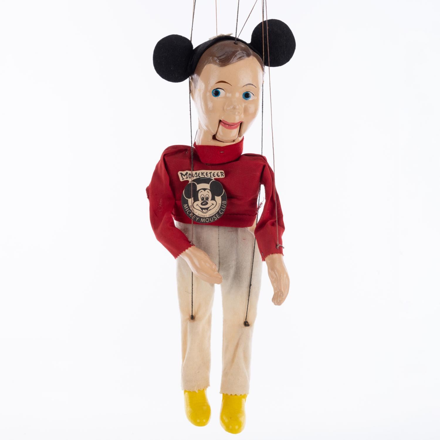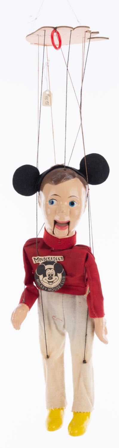 (Peter Puppet Playthings, 1950s) An original "The Mickey Mouse Club" marionette of a young boy Mouseketeer. With a composition head, arms, and legs, and fabric clothing, the puppet has a movable mouth. Measuring 5" x 3.5" and 14" in length, the puppet is in good condition with general fading and discoloration, paint wear and scuffing around the hand, feet, and chin, soiling throughout, and chipping to the paint on the back of the neck. The strings are intact but show fraying and weakening, and the hand control is cracking, brittle from age, and is missing the index finger.