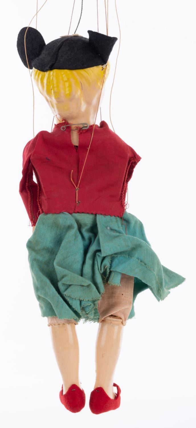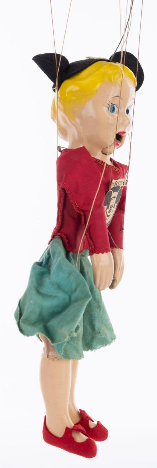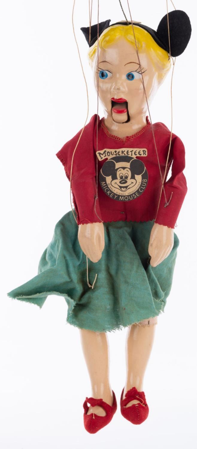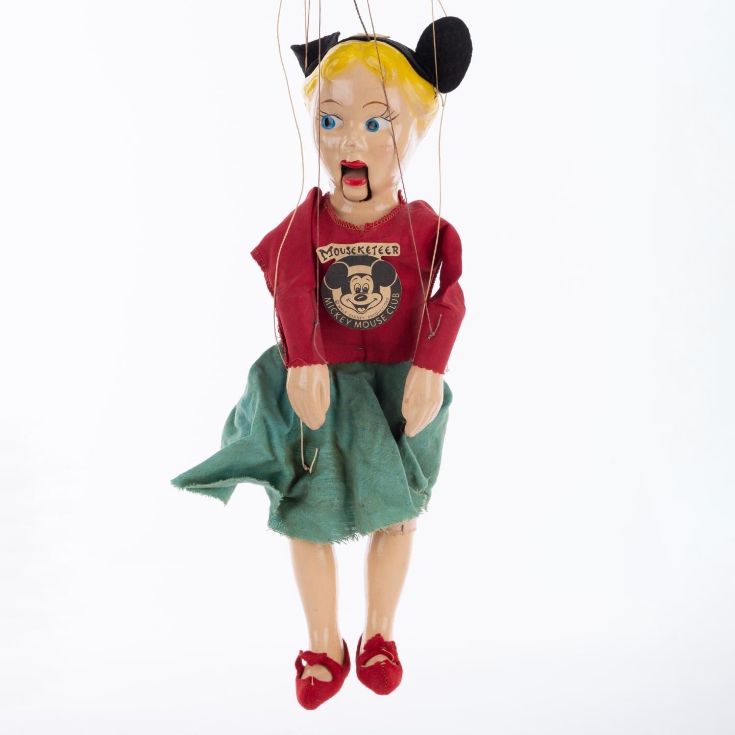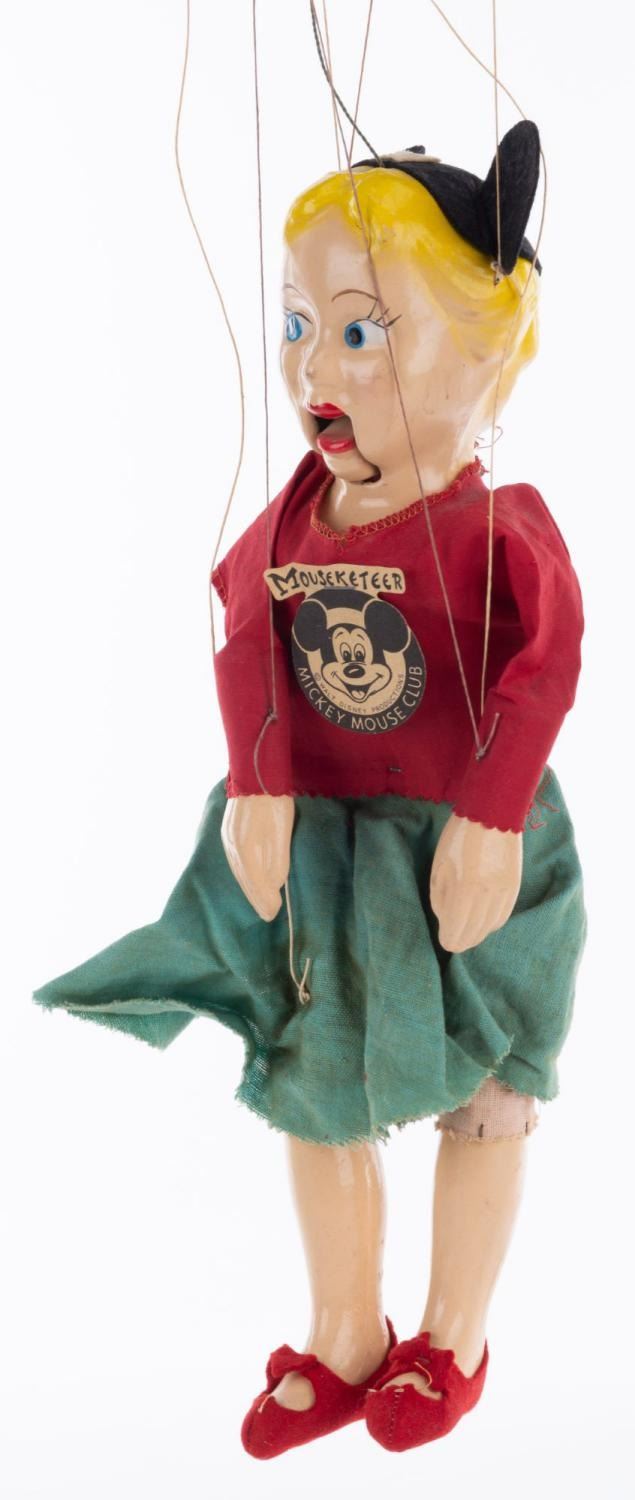 (Peter Puppet Playthings, 1950s) An original "The Mickey Mouse Club" marionette of a young girl Mouseketeer. With a composition head, arms, and legs, and fabric clothing, the puppet has a movable mouth. Measuring 5" x 3.5" and 14" in length, the puppet displays in good condition with fading and discoloration, paint wear and scuffing around the hand, feet, and chin, soiling mainly to the skirt, hairline surface cracks in the front and back of the head, and a split to the felt top of one shoe. The strings are intact but show fraying and weakening. The hand control is cracked, brittle with age, and missing the index finger.