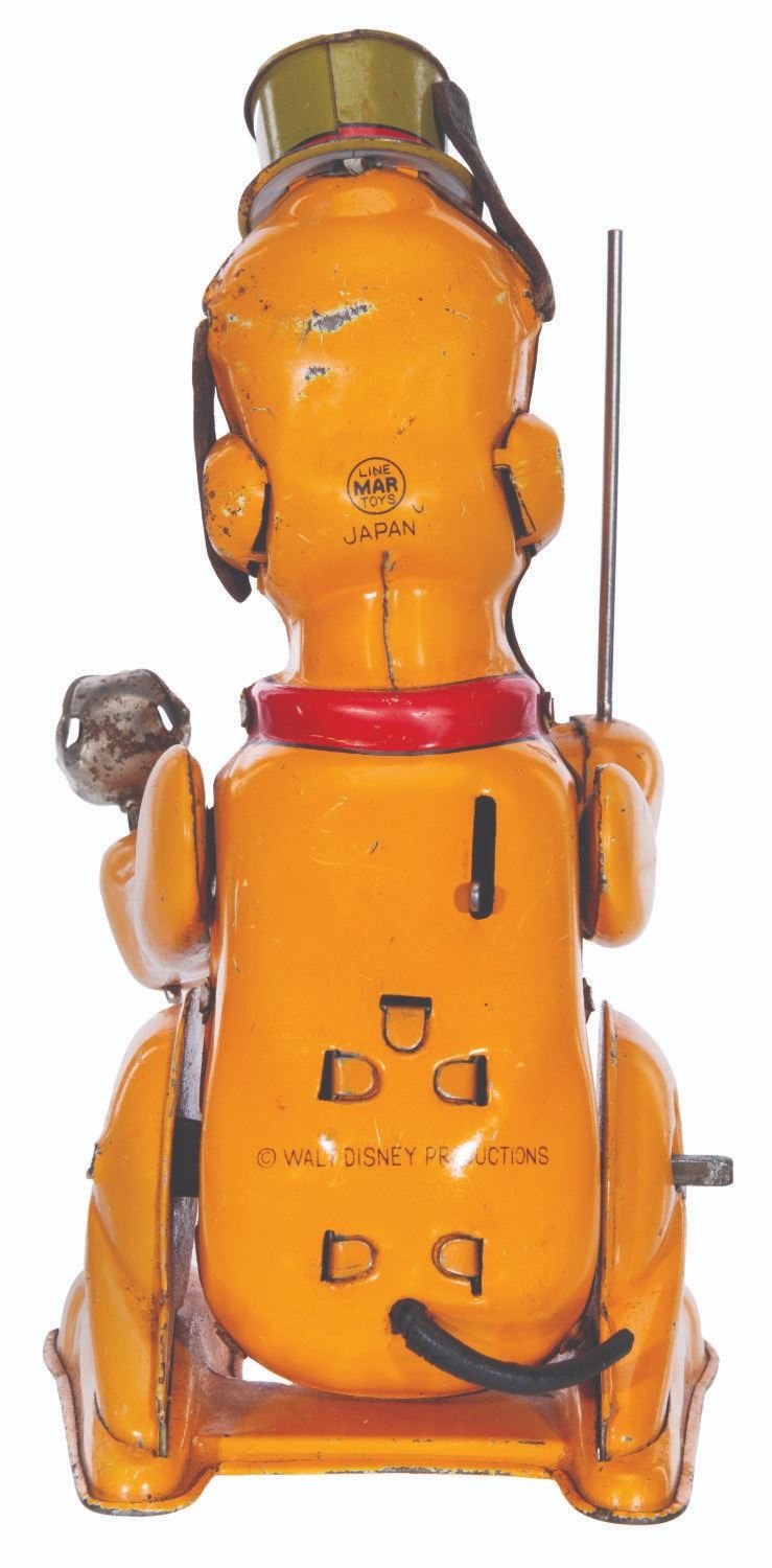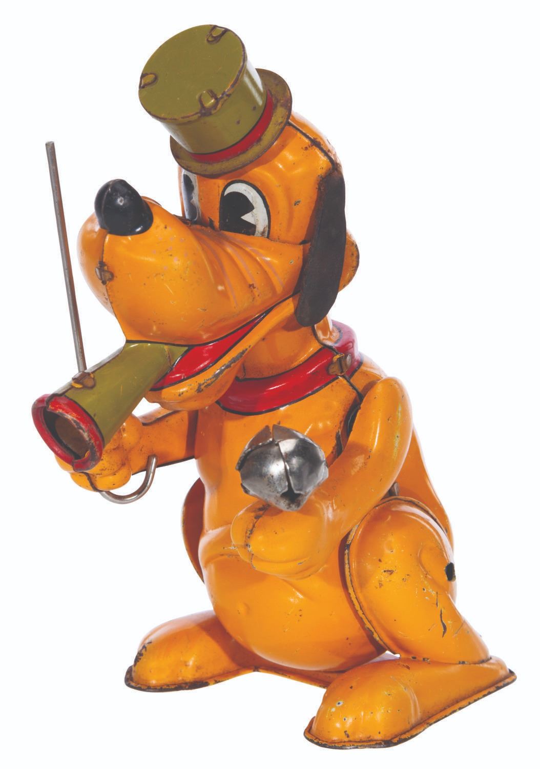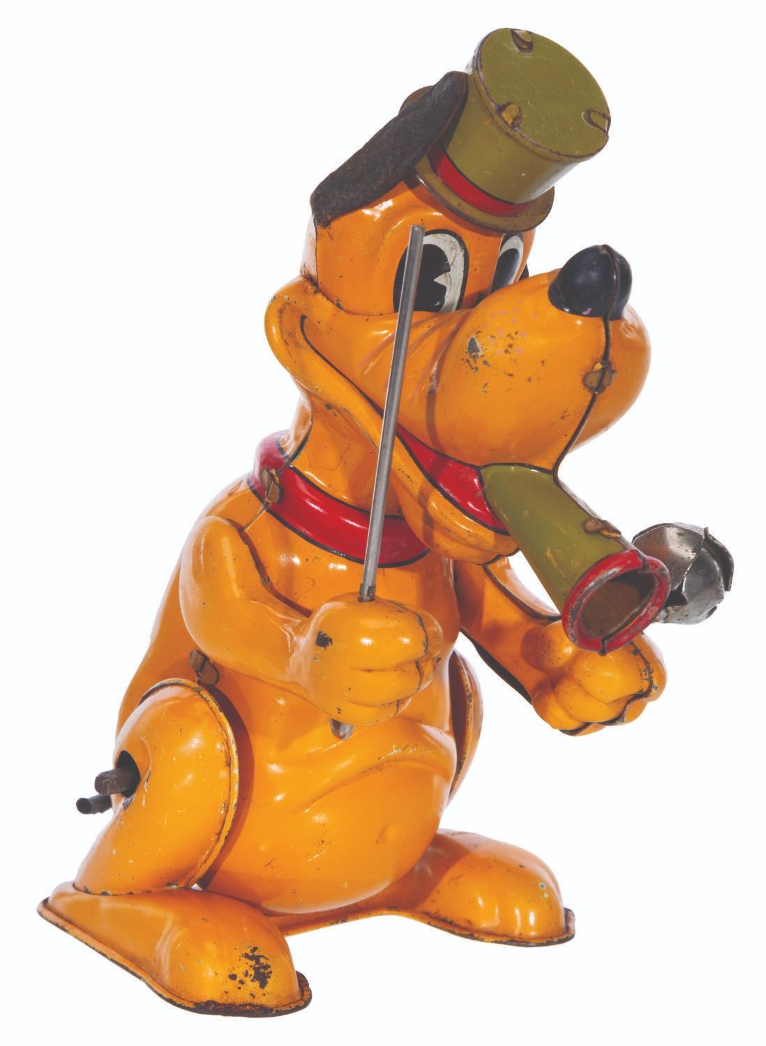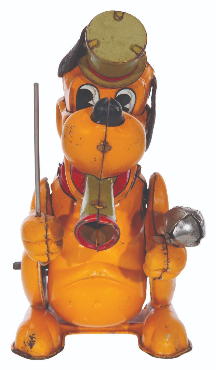 (Linemar, 1950s) A tin-litho wind-up Pluto the Drum Major toy. When wound with a key (not included), Pluto rocks on his feet and moves his paws up and down, jingling the bell. The toy has been tested and works intermittently. Measuring 4.5” x 3.5” x 6.25” high, the tin toy displays in good condition with original rubber ears and tail, and small scratches and scuffs.