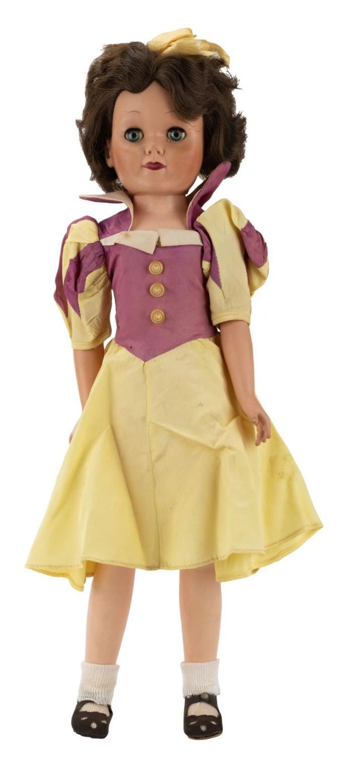 (DeLUXE Toy Creations of N.Y., 1950s) A Snow White doll made of "Soft Miracle Vinyl." Measuring 22" tall, the doll is in good condition, with typical fading to the blue dress, and wear from age and display.