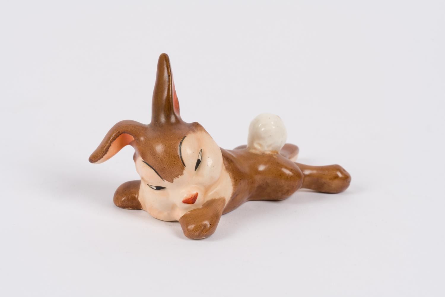 (Goebel, 1950s) A ceramic figurine of Thumper from "Bambi" sprawled out after falling on the ice. Due to the success of Goebel's prolific Hummel line, Walt Disney granted the company a license in 1952 to produce ceramics based on Disney's beloved characters. Measuring 5" x 2.5" x 2.75" tall, Thumper is in very good condition.