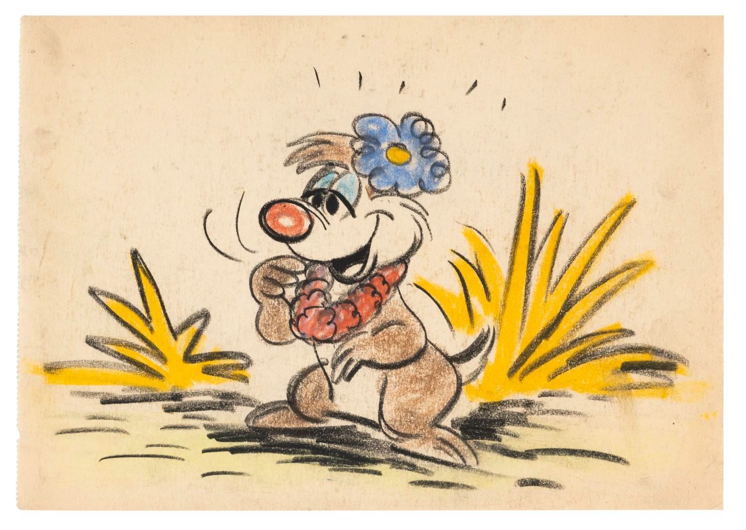 (Disney, 1950s) A storyboard from the 1950s of Dale wearing a lei. This piece was accomplished in graphite and colored pencils. Measuring 6” x 8.5”, the storyboard is in very good condition with light edge wear, scuffs, and discoloration from age.