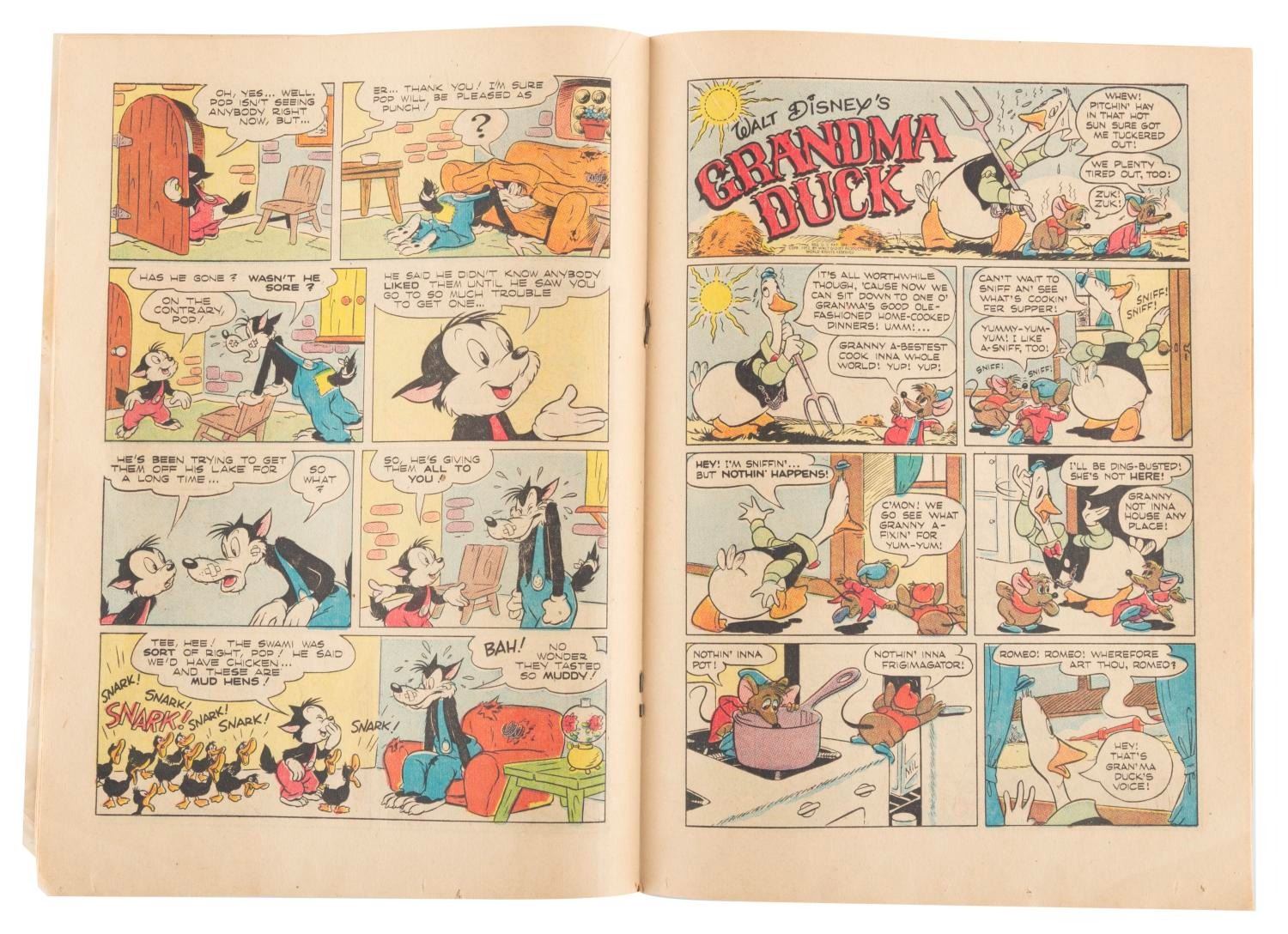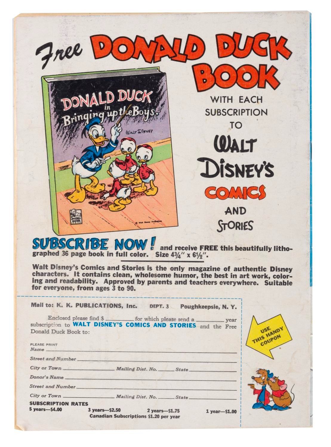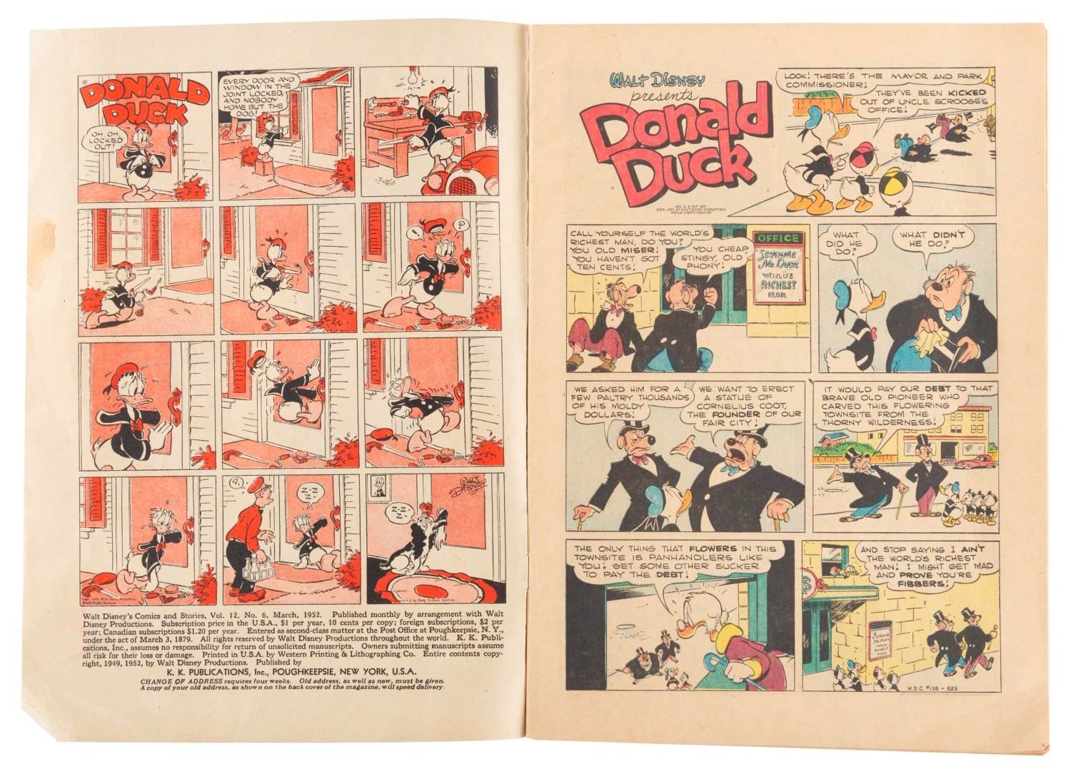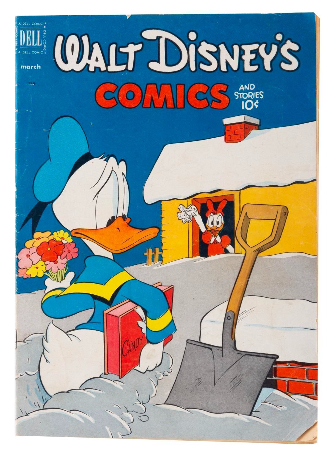 (Dell, 1952) A March 1952 issue of Dell’s Walt Disney Comics and Stories. This issue features the first printing of Carl Barks’ classic Uncle Scrooge story “Statuesque Spendthrifts," in which Scrooge and the Maharajah of Howduyustan compete to literally overshadow Duckburg with the largest statues of the town’s founder, Cornelius Coot. The comic book is in good condition with edge wear, especially seen along the spine, slight discoloration from age, and a 0.5" torn corner to the bottom left of the cover.