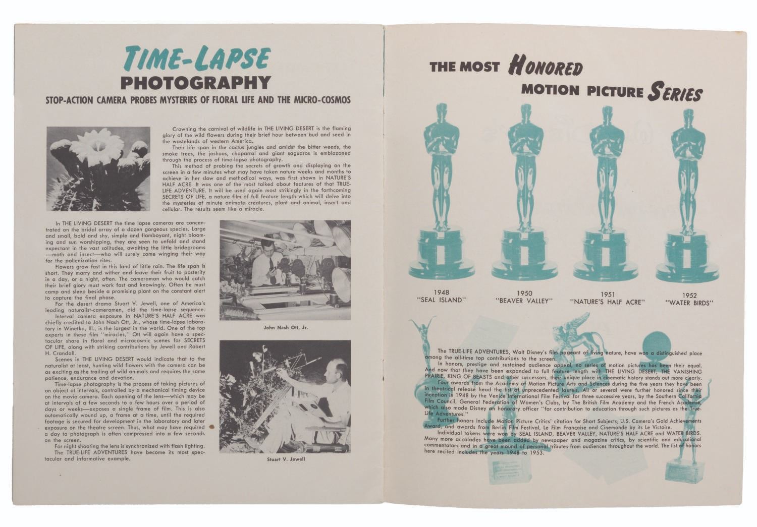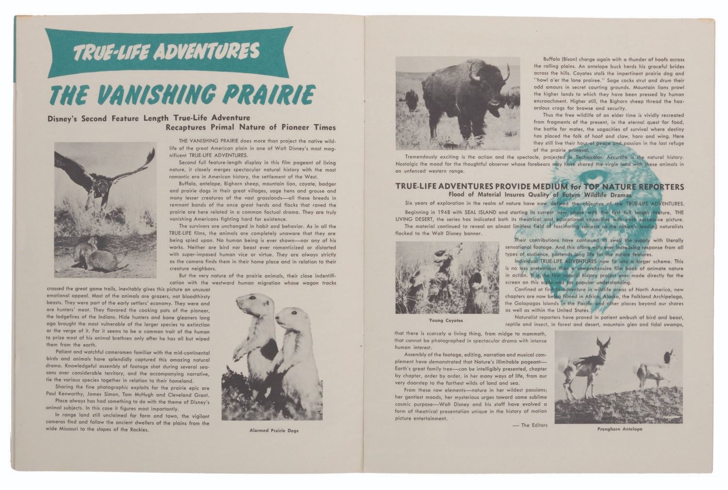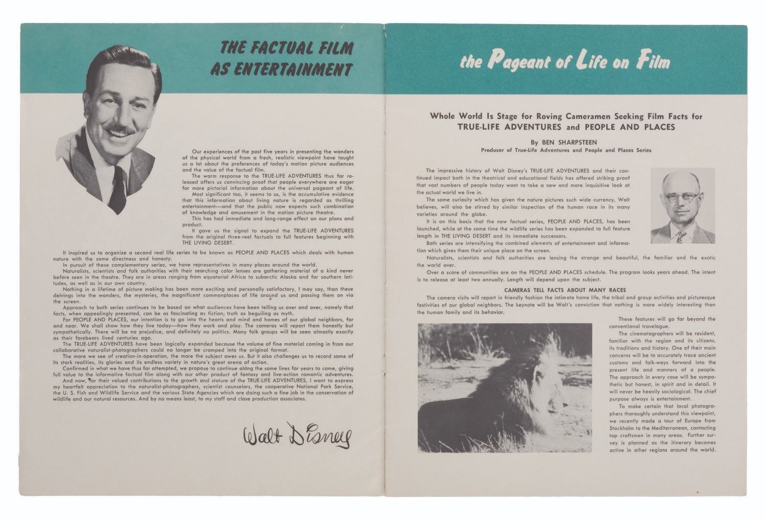 (Disney, 1953) A 1953 brochure outlining upcoming True-Life Adventure films, "The Living Desert" and "The Vanishing Prairie," and People and Places movies on Siam, Morocco, and Switzerland. The 8.5" x 11" booklet is in very good condition with light wear to the cover from handling and age, including a few small spots of paper loss, scuffs to the back, and a notation in red pencil at the bottom of the front.