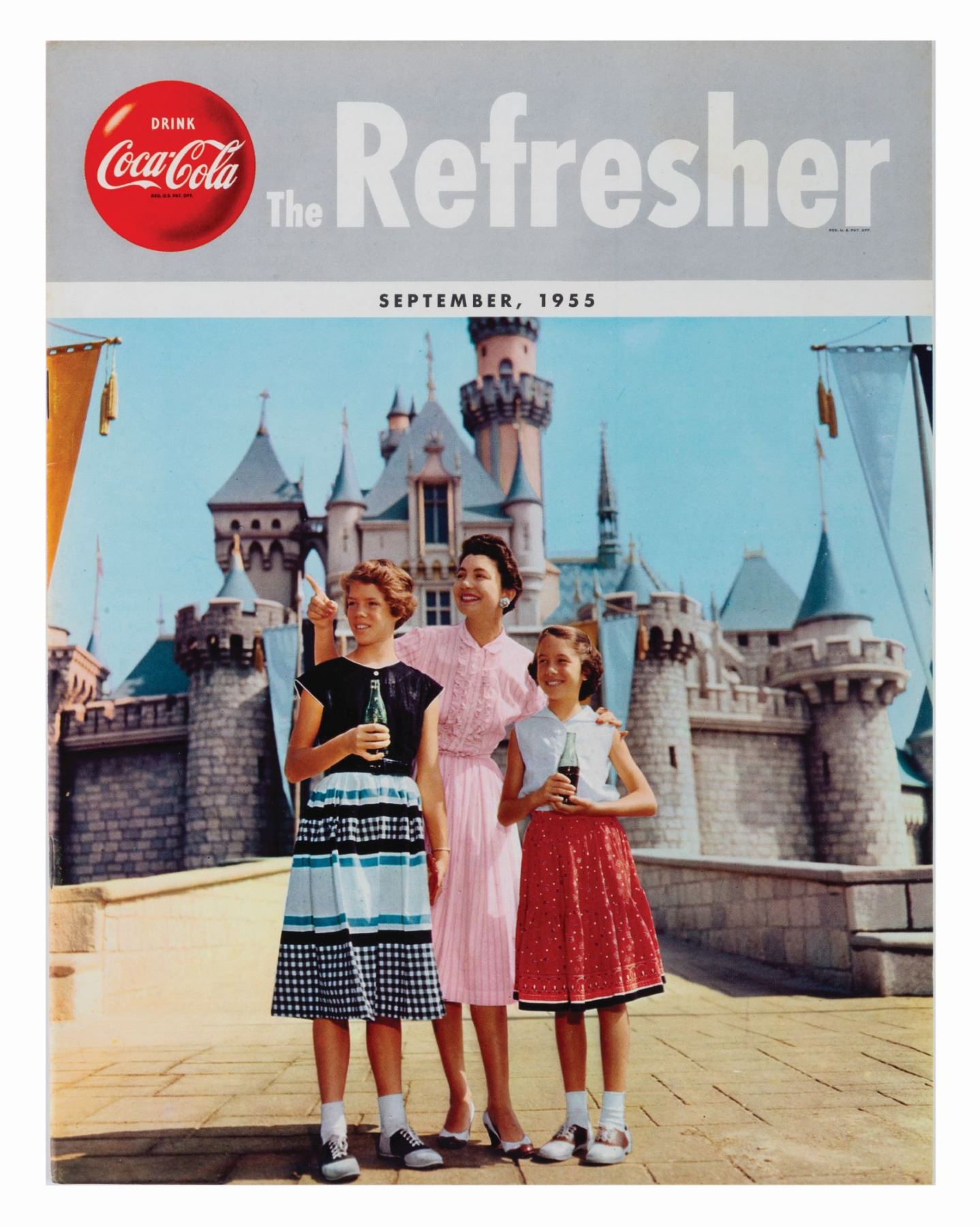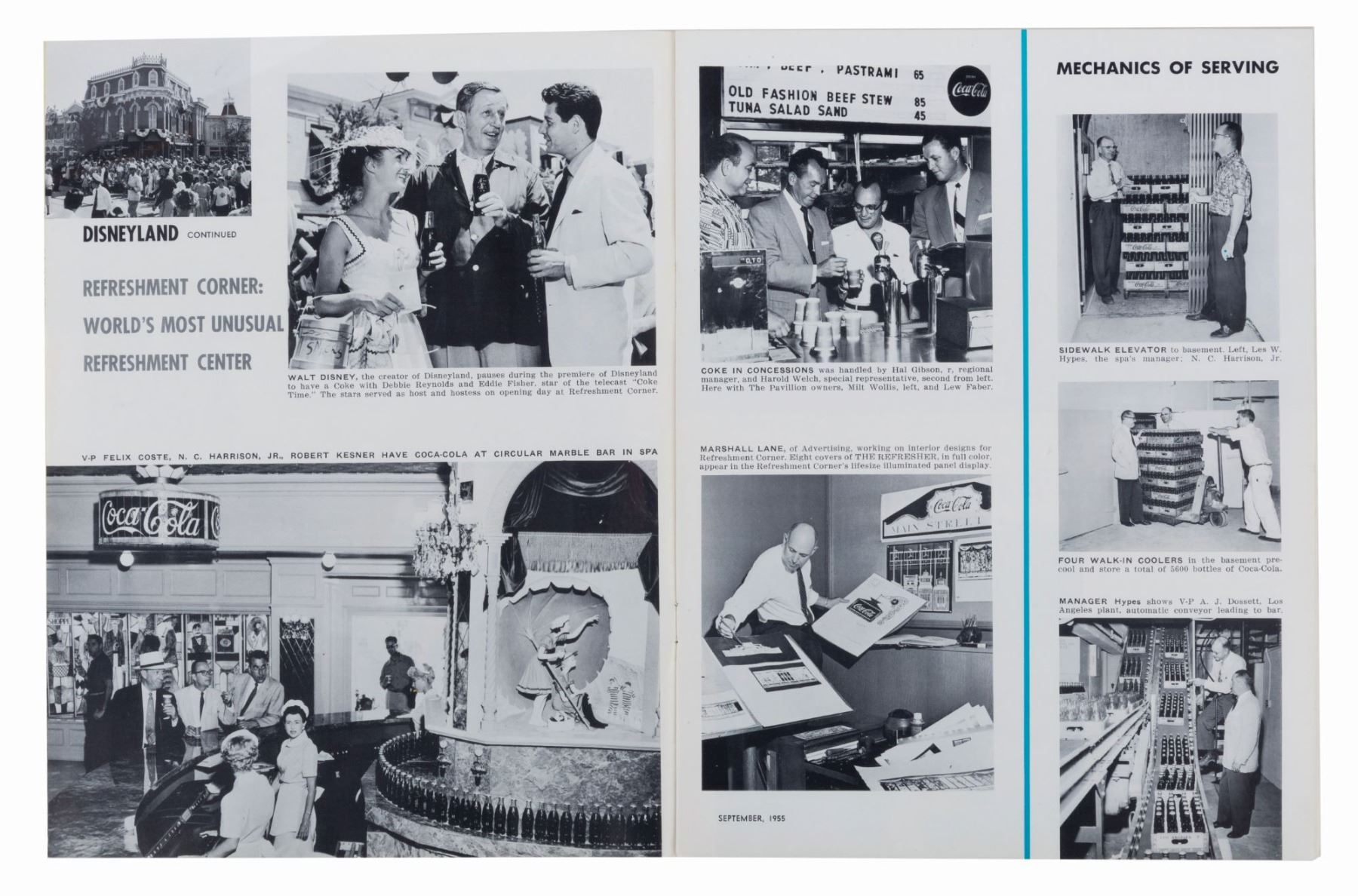 (Coca-Cola, 1955) A September 1955 issue of Coca-Cola's "The Refresher" magazine with a cover story on Coca-Cola at Disneyland. Five pages with photographs follow a Coke executive's family visiting Disneyland, profile Refreshment Corner, and give a behind-the-scenes look at Coke in the Park. Measuring 8.5"x 11", the magazine is in fine condition.