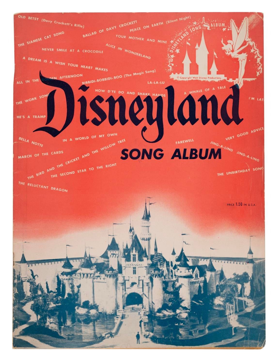 (Disneyland, 1955) A very rare song album from Disneyland's opening year. The album features a great image of Sleeping Beauty Castle on the cover, and contains music for songs from "Davy Crockett", "Lady and the Tramp", "Cinderella", "Alice in Wonderland", "Peter Pan", "The Reluctant Dragon", "20,000 Leagues Under the Sea", and more. Measuring 12"x 9", the song album is in very good condition with light edge-wear, small scuffs, and browning to the pages.