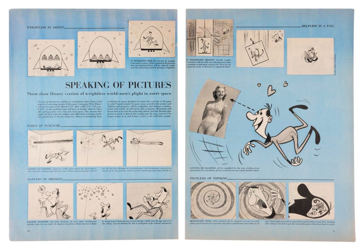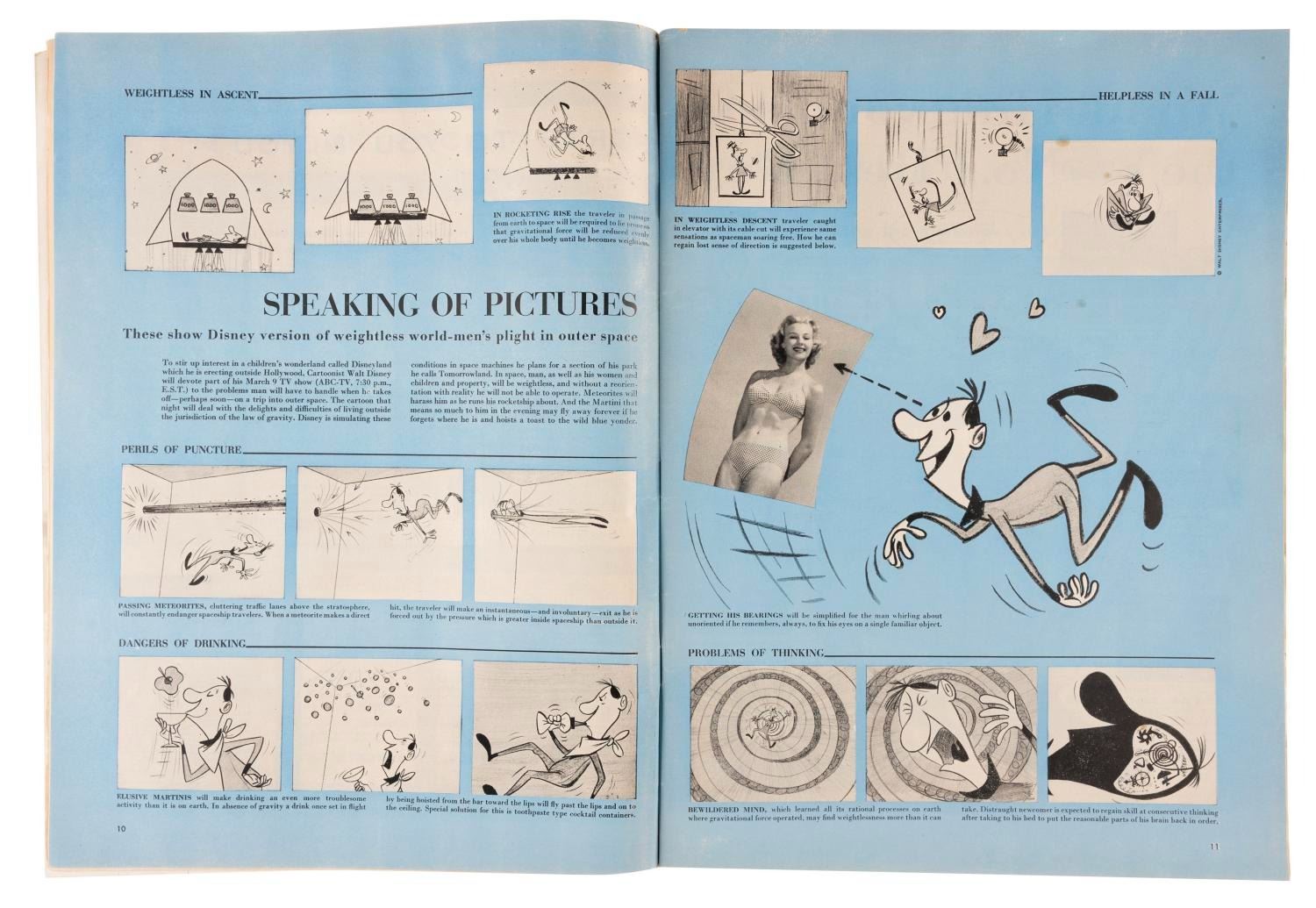 (LIFE, 1955) A March 7, 1955 issue of LIFE Magazine with a two-page article on Walt Disney's "Man in Space" television shows. Measuring 10.5" x 14", the magazine is in fair condition with much wear to the cover and spine, with the interior article in good condition. The lot includes a second copy of the article clipped from another magazine, in fair condition.