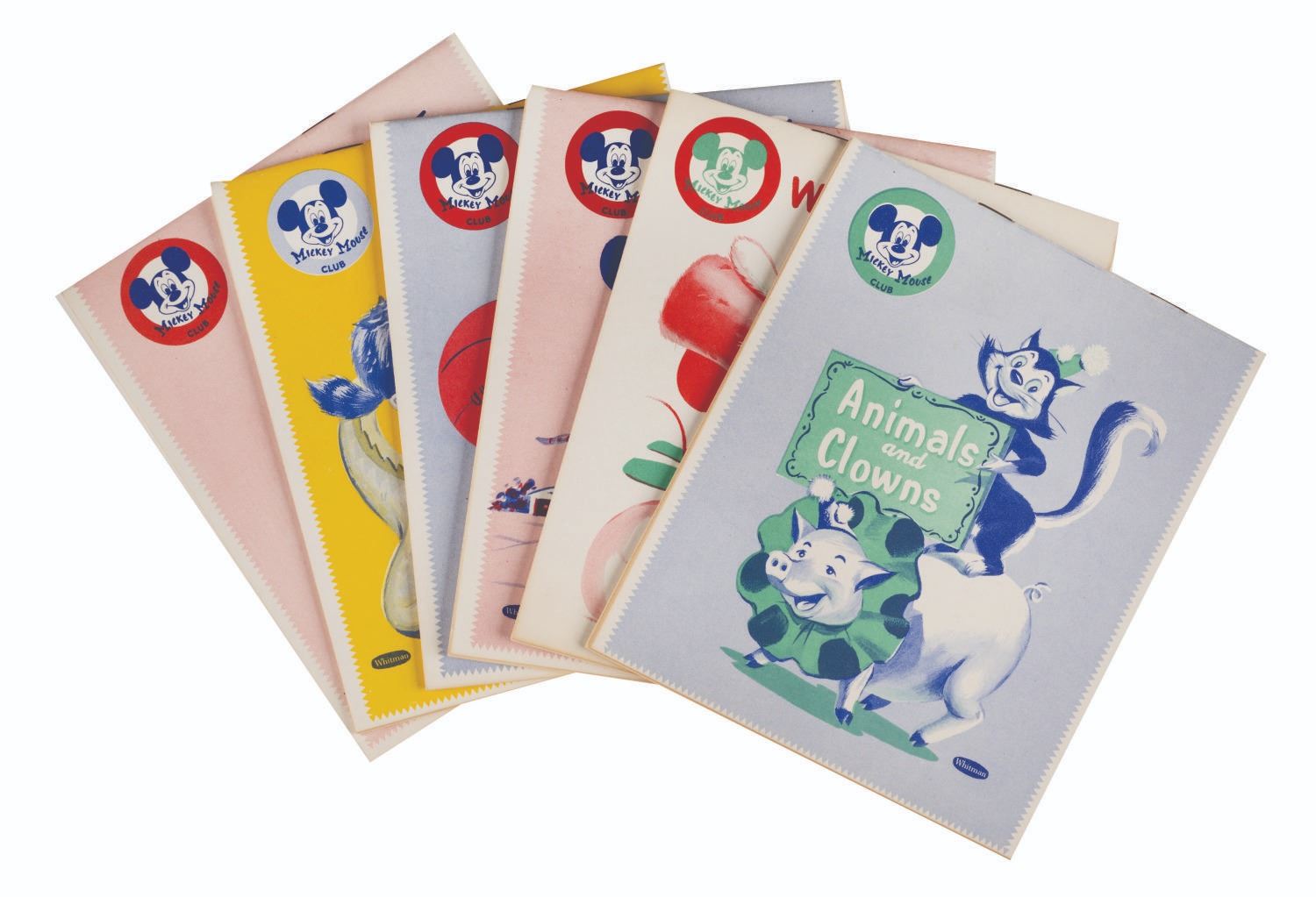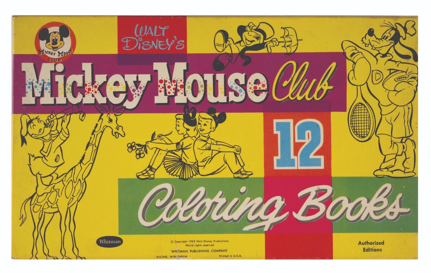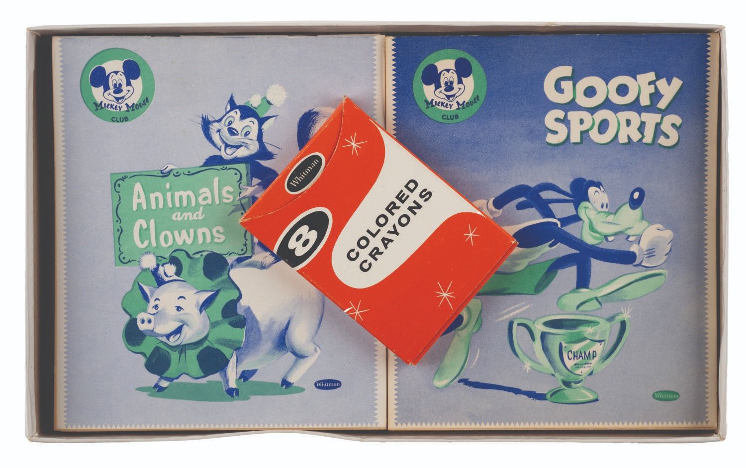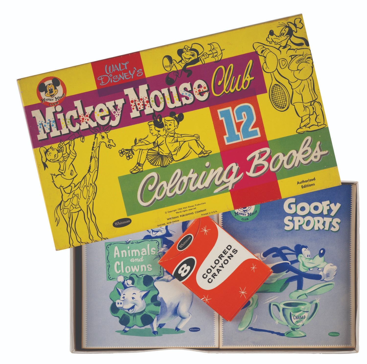 (Whitman, 1955) A coloring book box set featuring Mickey Mouse and all his friends in the original packaging. Included are a box of eight crayons, a pair of loose Blendwei brand crayons, one pencil, and 12 coloring books consisting of 20 pages each. The box measures 12" x 7" and 1" thick, and the contents are in good to very good condition with 5 pages out of the entire set colored in, discoloration from age, and the crayons and pencil are in good condition with handling wear from use. The box is in good condition with wear from use, including some spotting and a 1" tear on one of the edges.