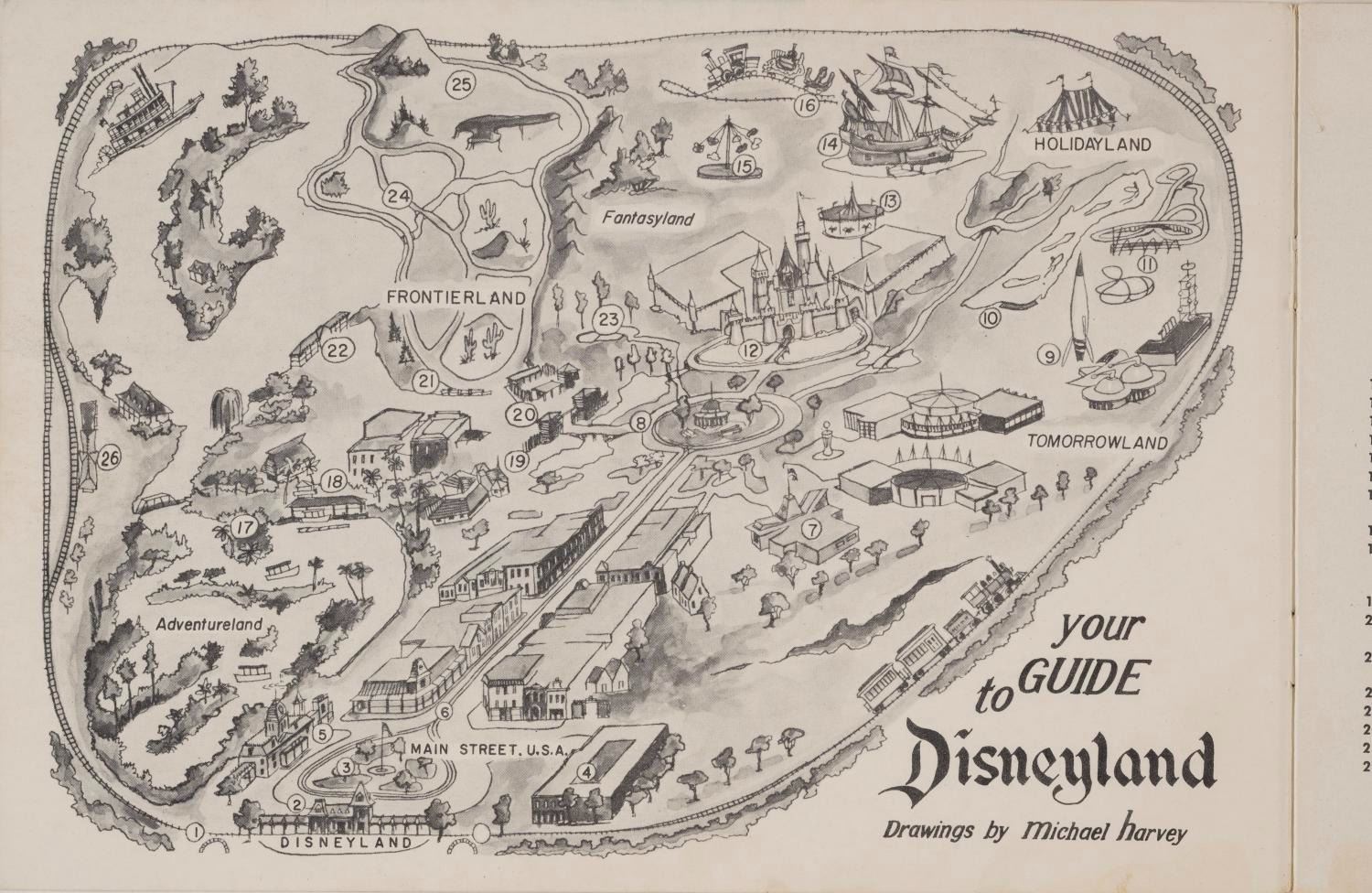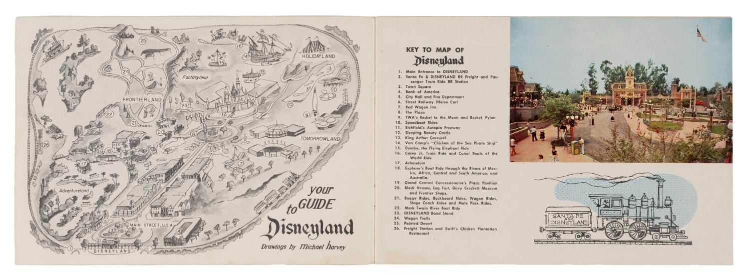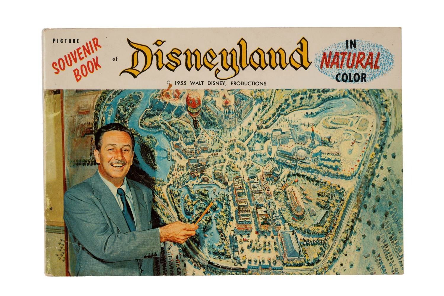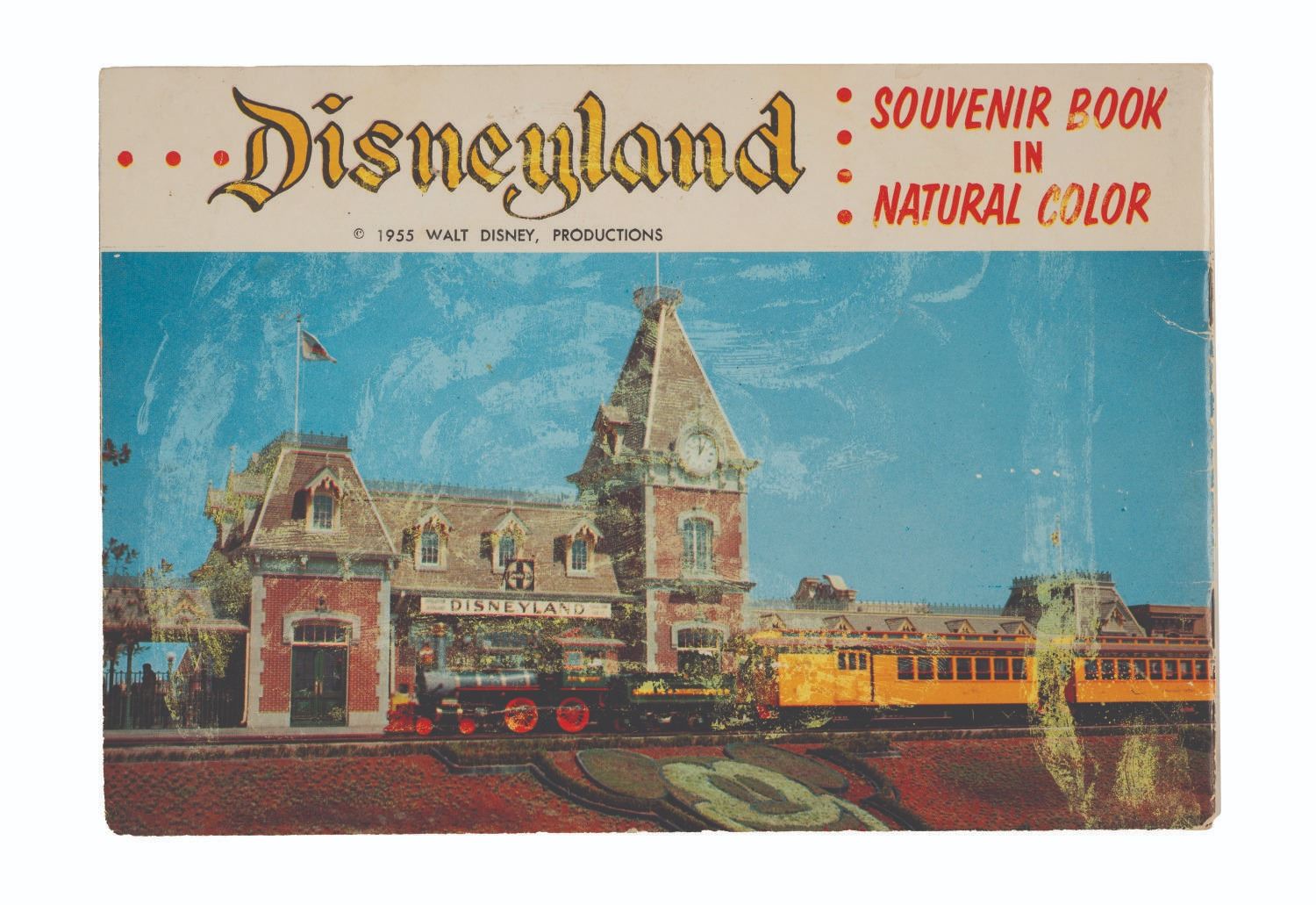(Disneyland, 1955) A rare Picture Souvenir Book of Disneyland in Natural Color, a 24-page land-by-land tour of Disneyland supplemented with early photos and illustrations. Measuring 6” x 8.75”, the book displays in good condition with scratches, spotting, creases, and heavy stains on the reverse.