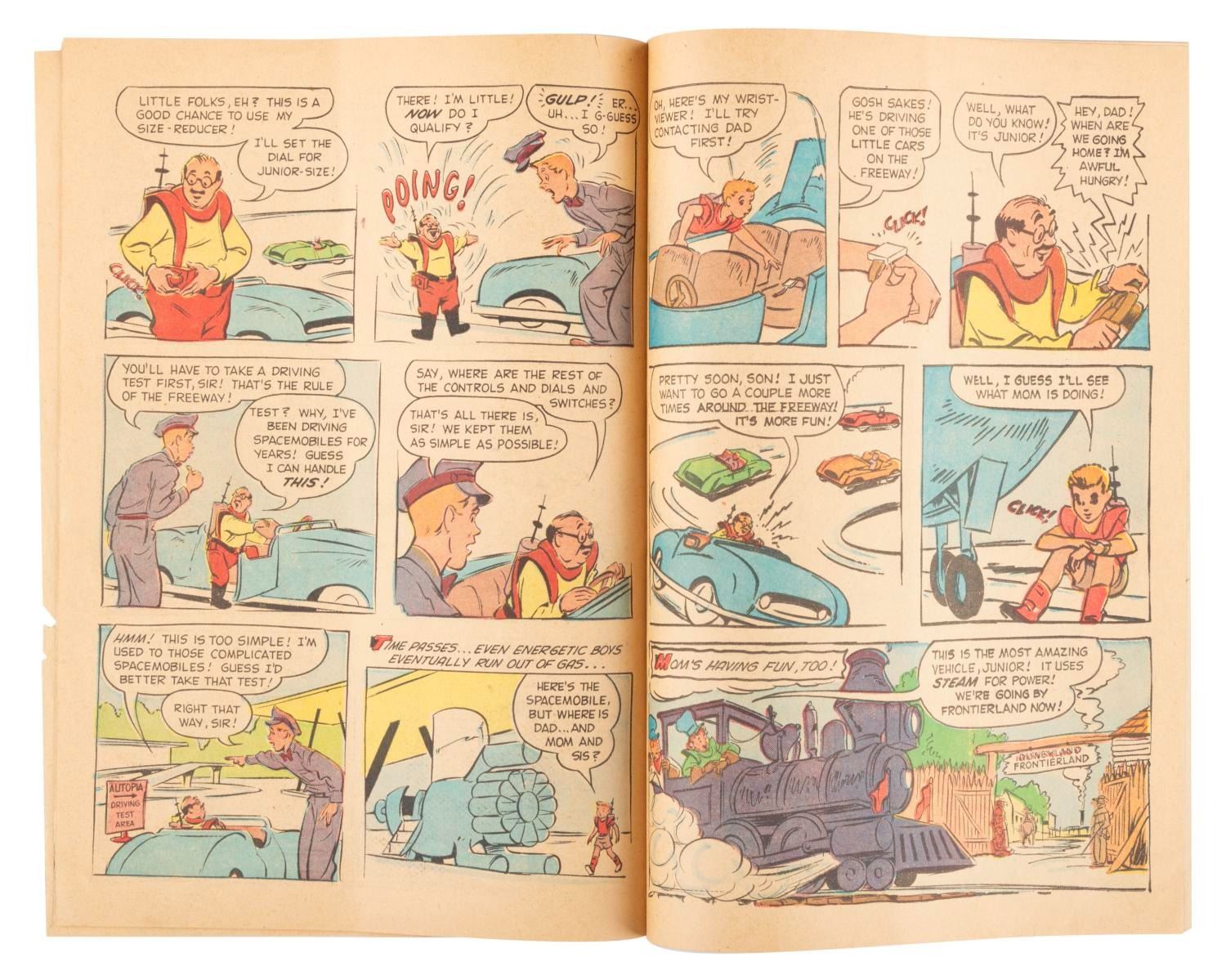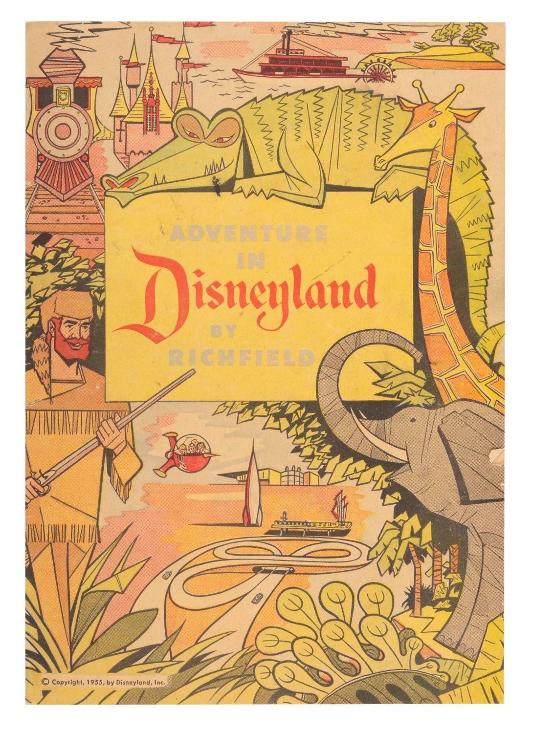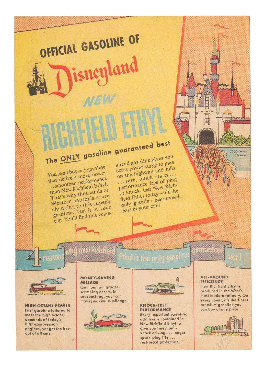 (Disneyland, 1955) An Adventure in Disneyland by Richfield comic book. This 14-page comic book promoted Richfield's latest petroleum products and sponsored attractions at Walt Disney's newly opened Disneyland. Measuring 7.5" x 10.25", the comic book is in good condition with typical discoloration from age, light edge wear, and a small pencil notation on the back.