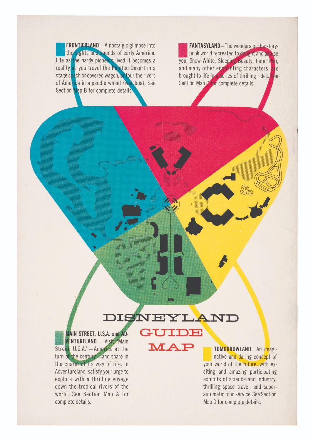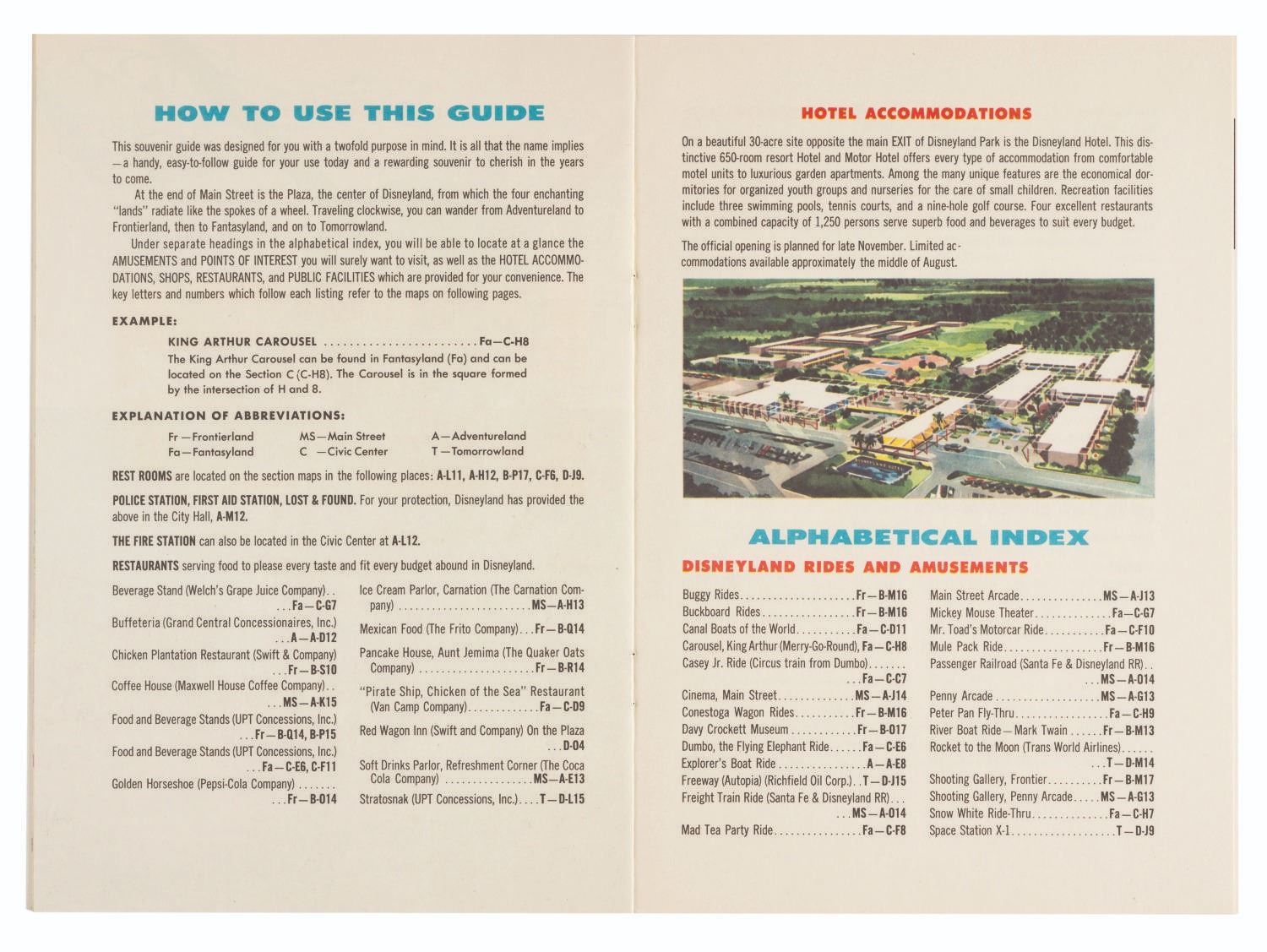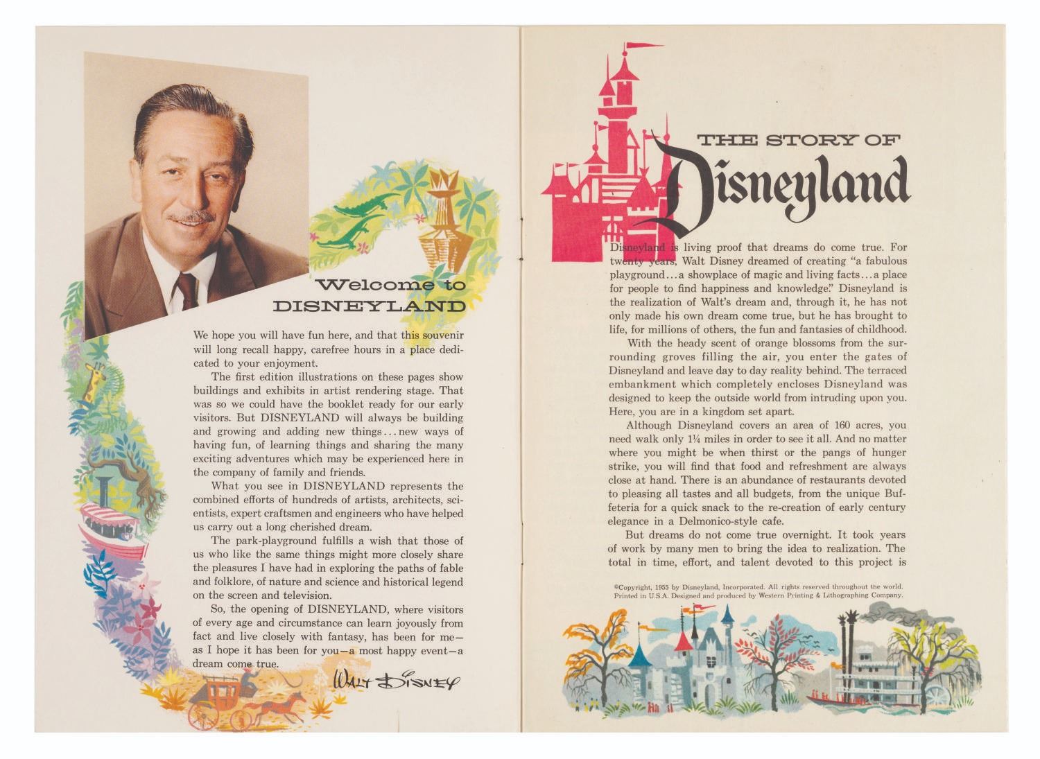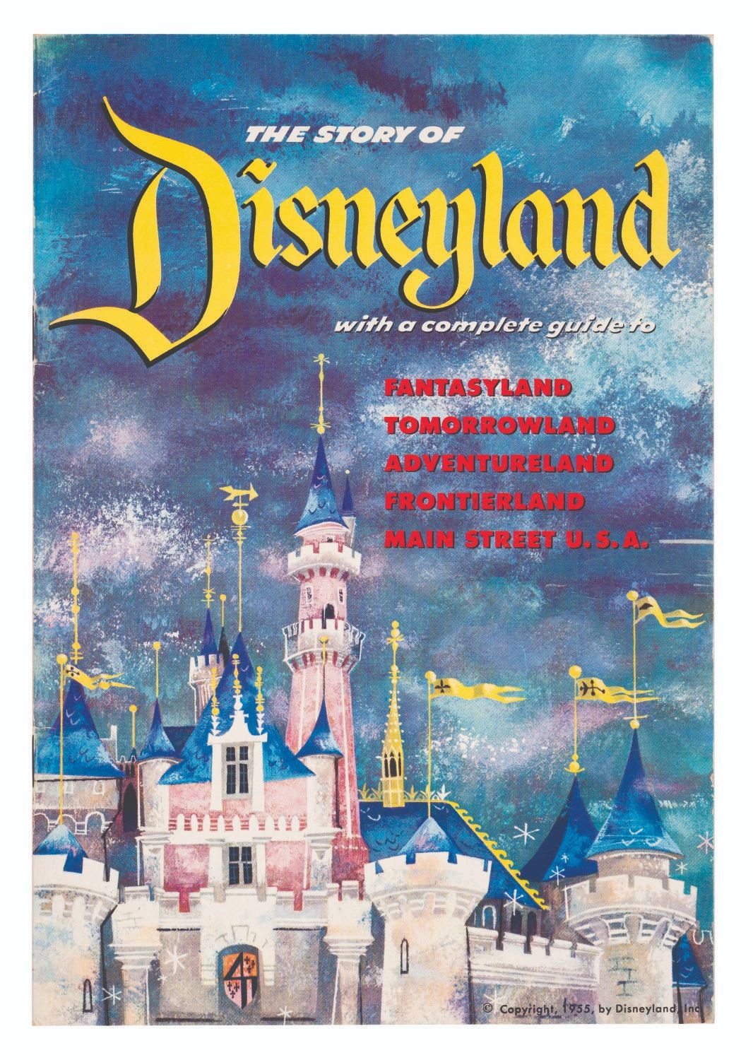 (Disneyland, 1955) An opening year, The Story of Disneyland guidebook. Later guidebooks would use photos from around the Park, but this early version used concept art and illustrations instead. Measuring 6" x 8.75", the 22-page guide is in very good condition with minor wear to the edges and light surface wear along the spine.