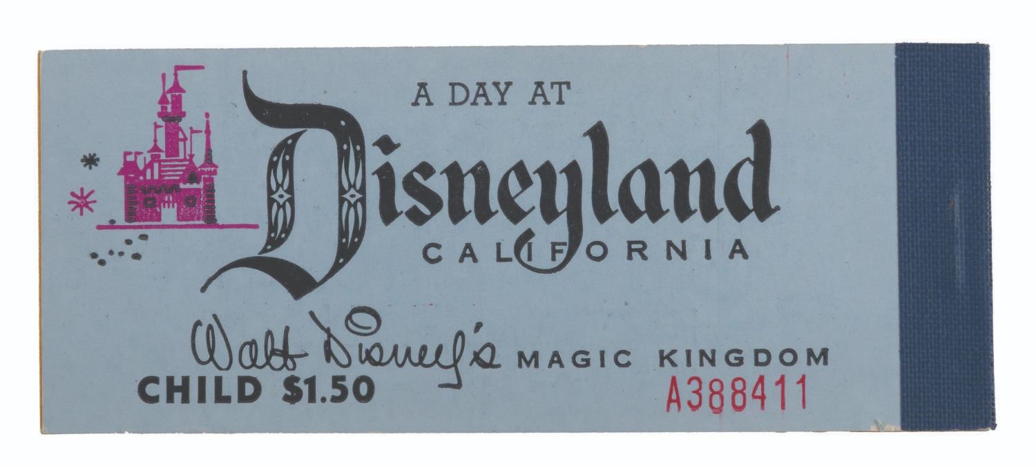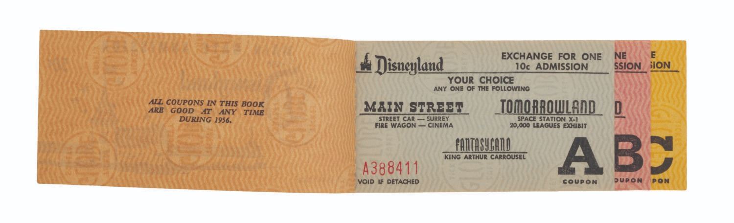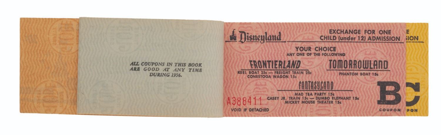 (Disneyland, 1956) A complete"A Day At Disneyland" Child ticket book from 1956. The book includes the front Main Gate admission ticket, 3"A" tickets, 2"B" tickets, and 3"C" tickets. Measuring 2" x 5", the ticket book is numbered A388411 and is in very good condition with scratches, handling wear, and edge wear.