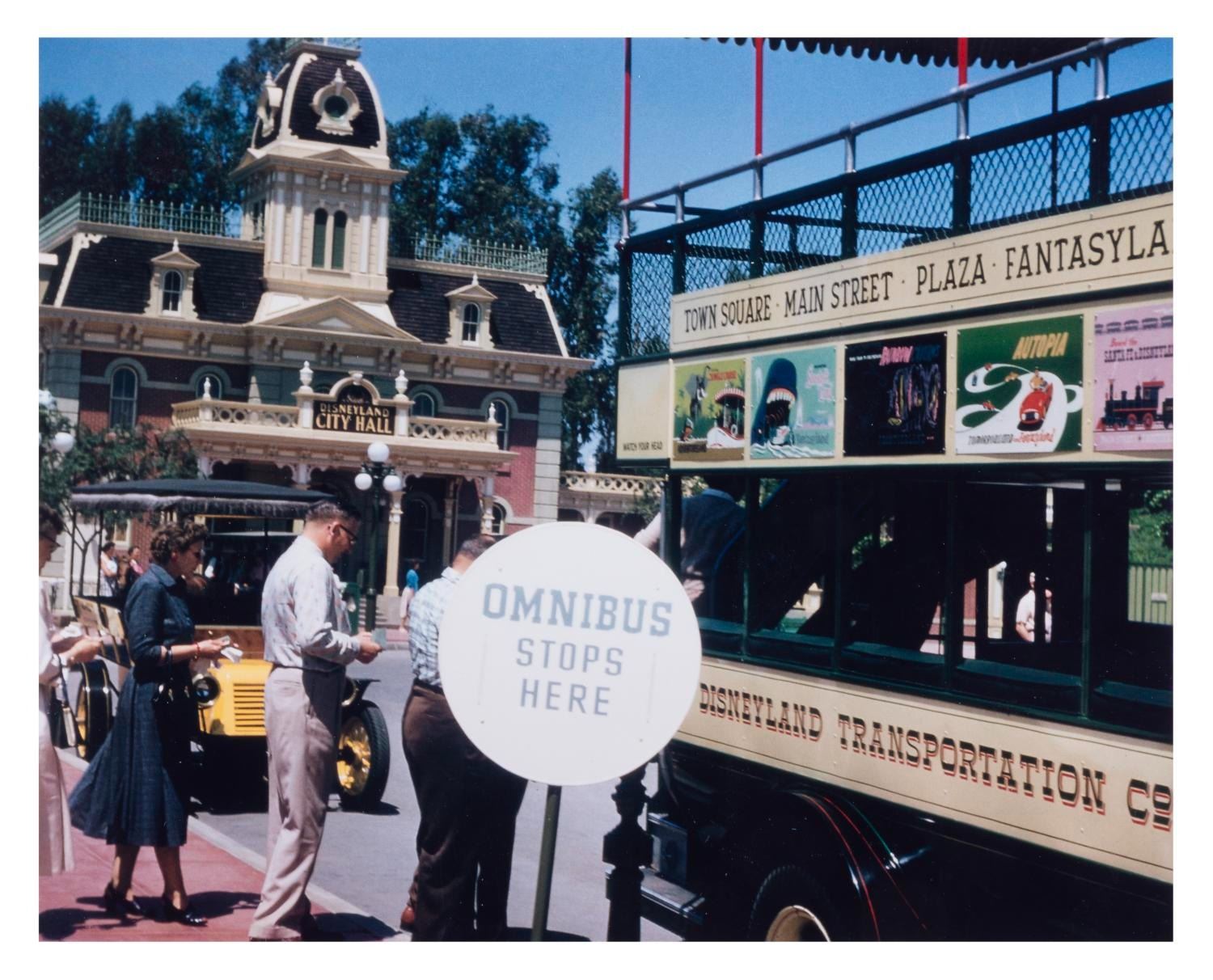 (Disneyland, 1956) A beautiful color print of an early image featuring the Omnibus in front of Disneyland’s City Hall, with an excellent look at the unique Omnibus attraction signs. This print on Fuji paper was likely made in the 1980s or 1990s. Measuring 8" x 10", the print is in fine condition.