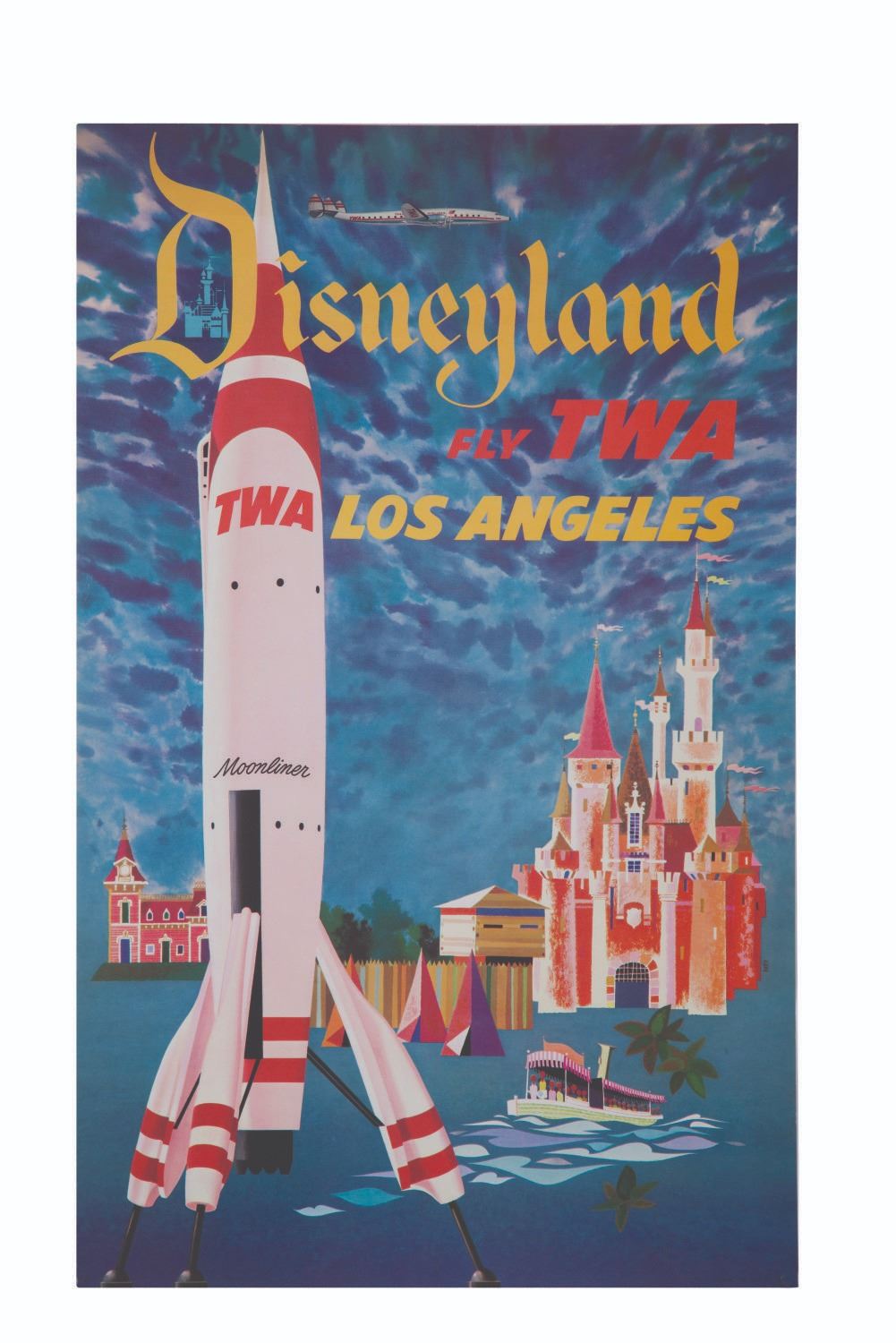 (TWA, 1956) A small travel poster for Los Angeles and Disneyland depicting the TWA Constellation soaring high over Disneyland’s Moonliner Rocket and Sleeping Beauty Castle. Measuring 15.5" x 25", the poster displays in overall very good condition, with very light wear to the edges.