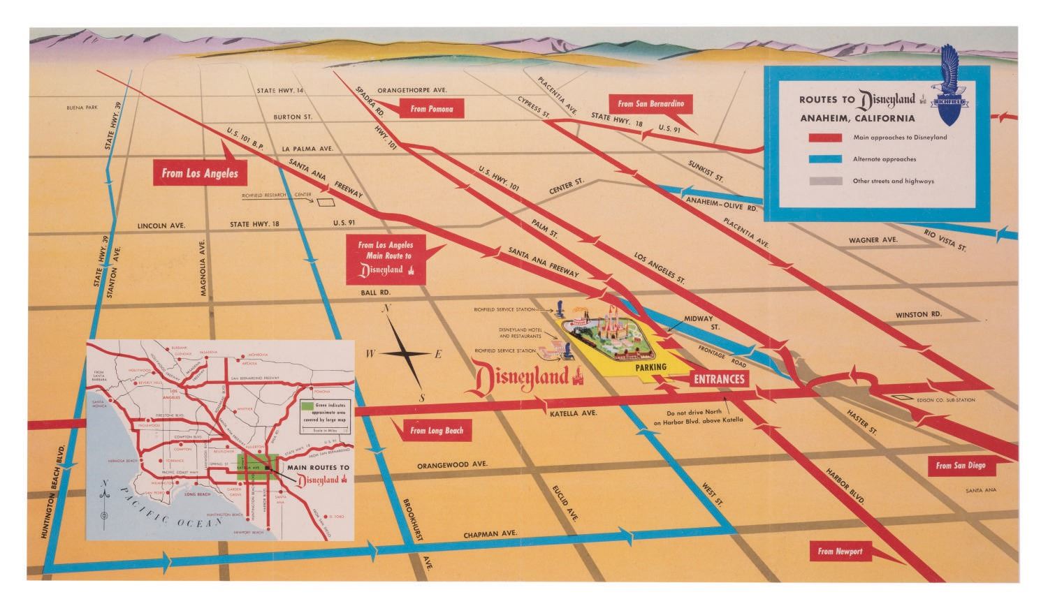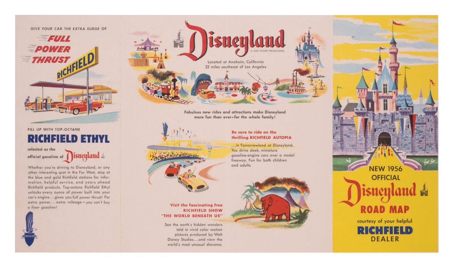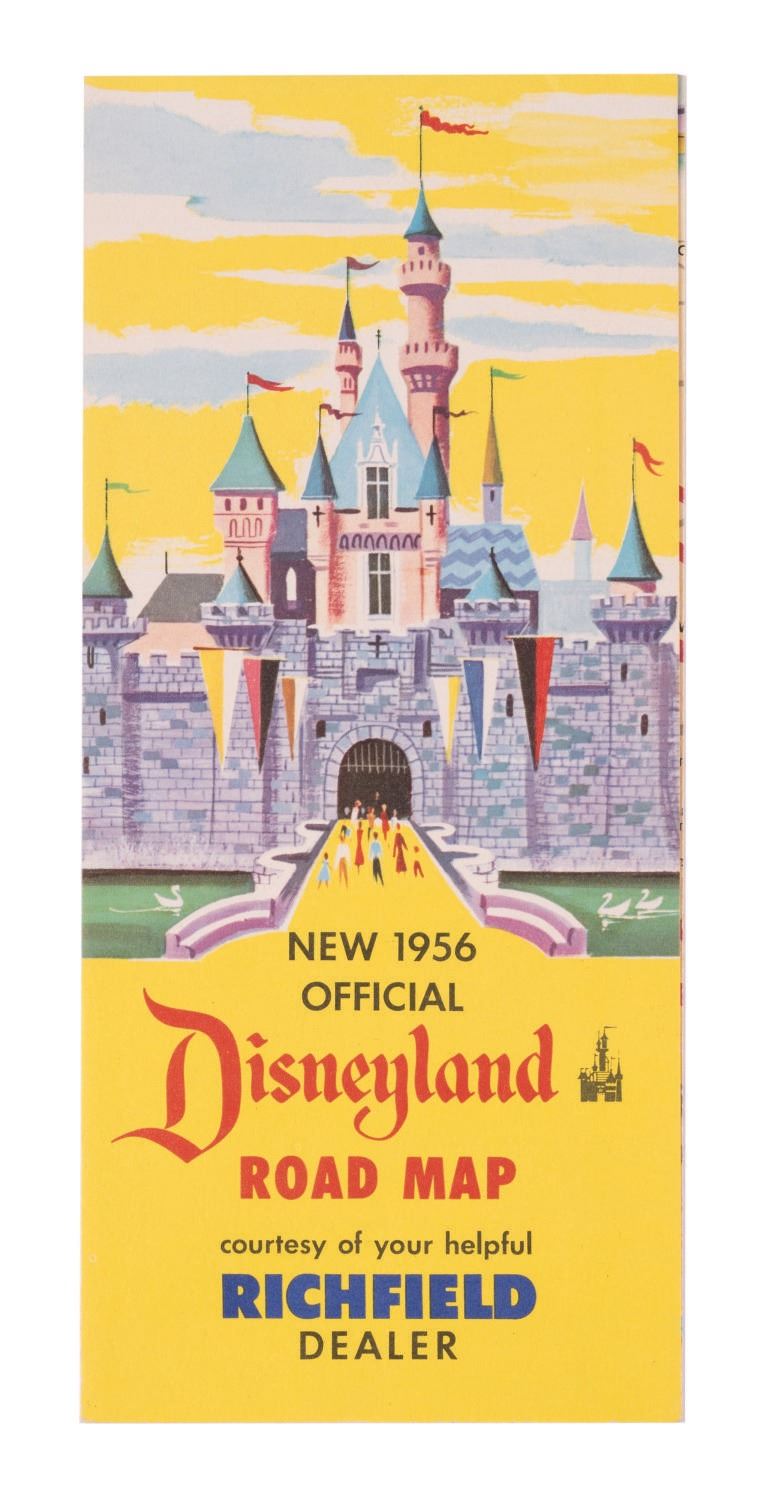 (Disneyland, 1956) A very rare "New 1956 Official Disneyland Road Map" that was provided "courtesy of your helpful Richfield dealer." The map features colorful imagery of Walt Disney's Disneyland and details routes to the Park from various Southern California areas. This 1956 edition of the map notably refers to the 5 Freeway as the "US 101," and depicts only two local Richfield Stations – one at the Disneyland Hotel on West Street and one at Ball Road (a third station was soon added on Euclid Avenue). The unfolded map measures 16"x9" and is in fine condition.