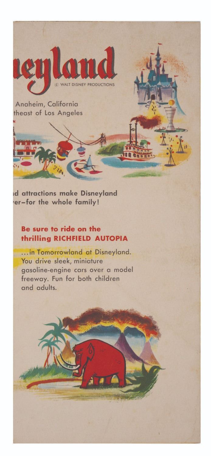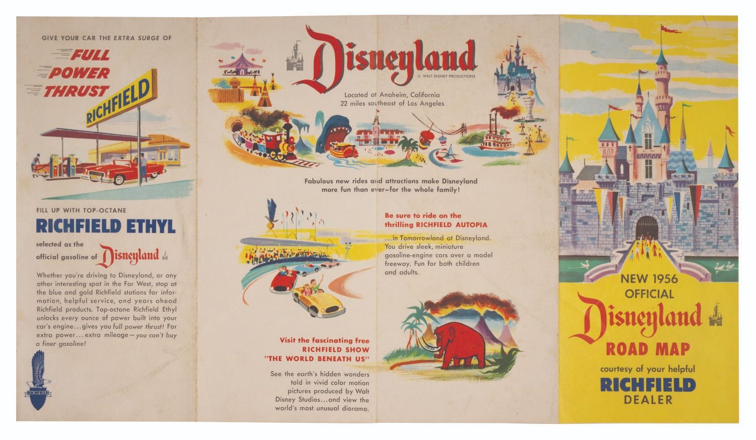 (Disneyland, 1956) A very rare "New 1956 Official Disneyland Road Map" that was provided "courtesy of your helpful Richfield dealer." This map features colorful imagery of Walt Disney's Disneyland and details routes to the Park from various Southern California areas. This 1956 edition of the map notably refers to the 5 Freeway as the "US 101," and depicts only two local Richfield Stations – one at the Disneyland Hotel on West Street and one at Ball Road (a third station was soon added on Euclid Avenue). The unfolded map measures 16"x9" and is in very good condition.