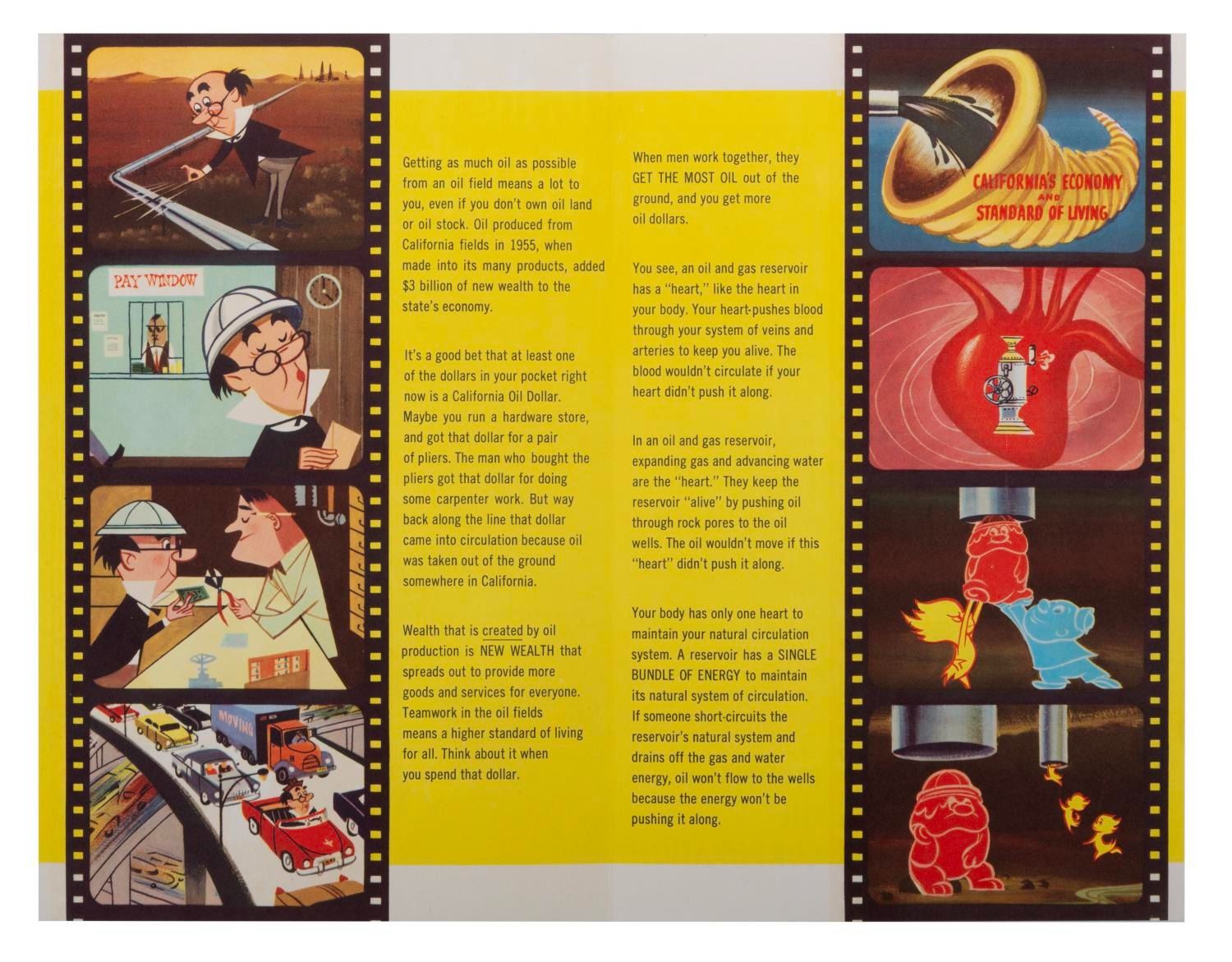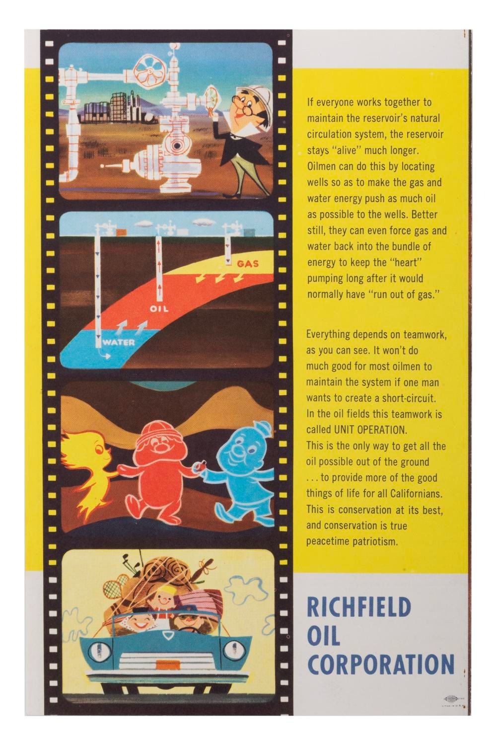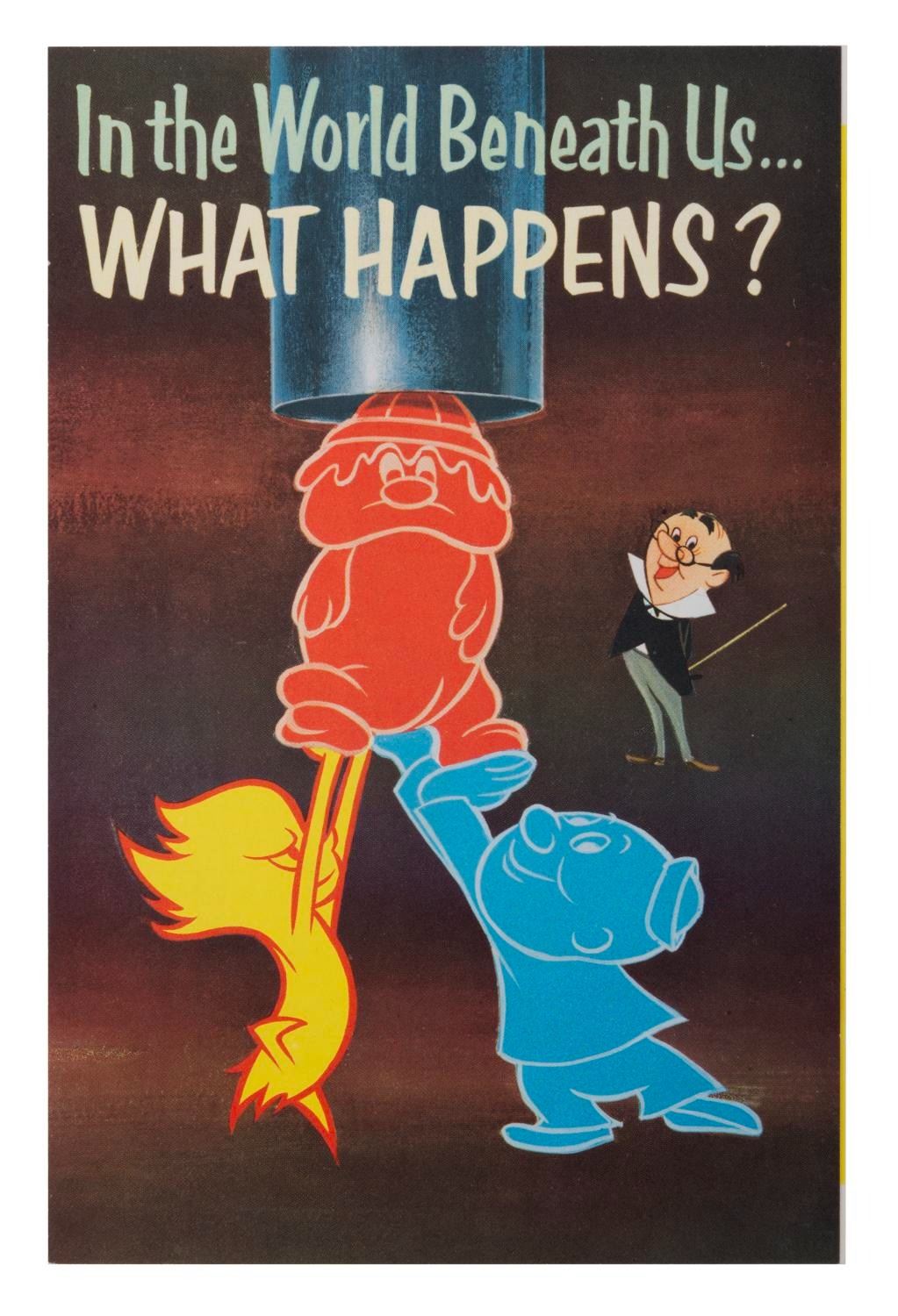 (Disneyland, 1956) A rare souvenir brochure from Richfield's In the World Beneath Us attraction in Tomorrowland. The attraction included several large dioramas and a short motion picture about the history of oil. This colorfully illustrated brochure presents imagery and messages from the film. Measuring 8.5"x5.5", this piece is in fine condition.