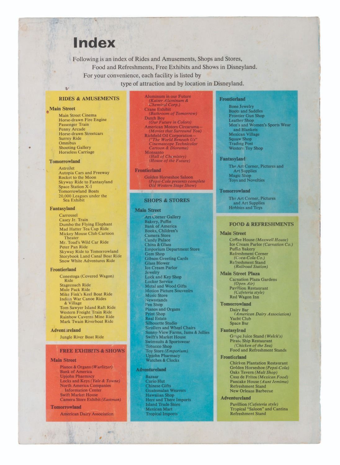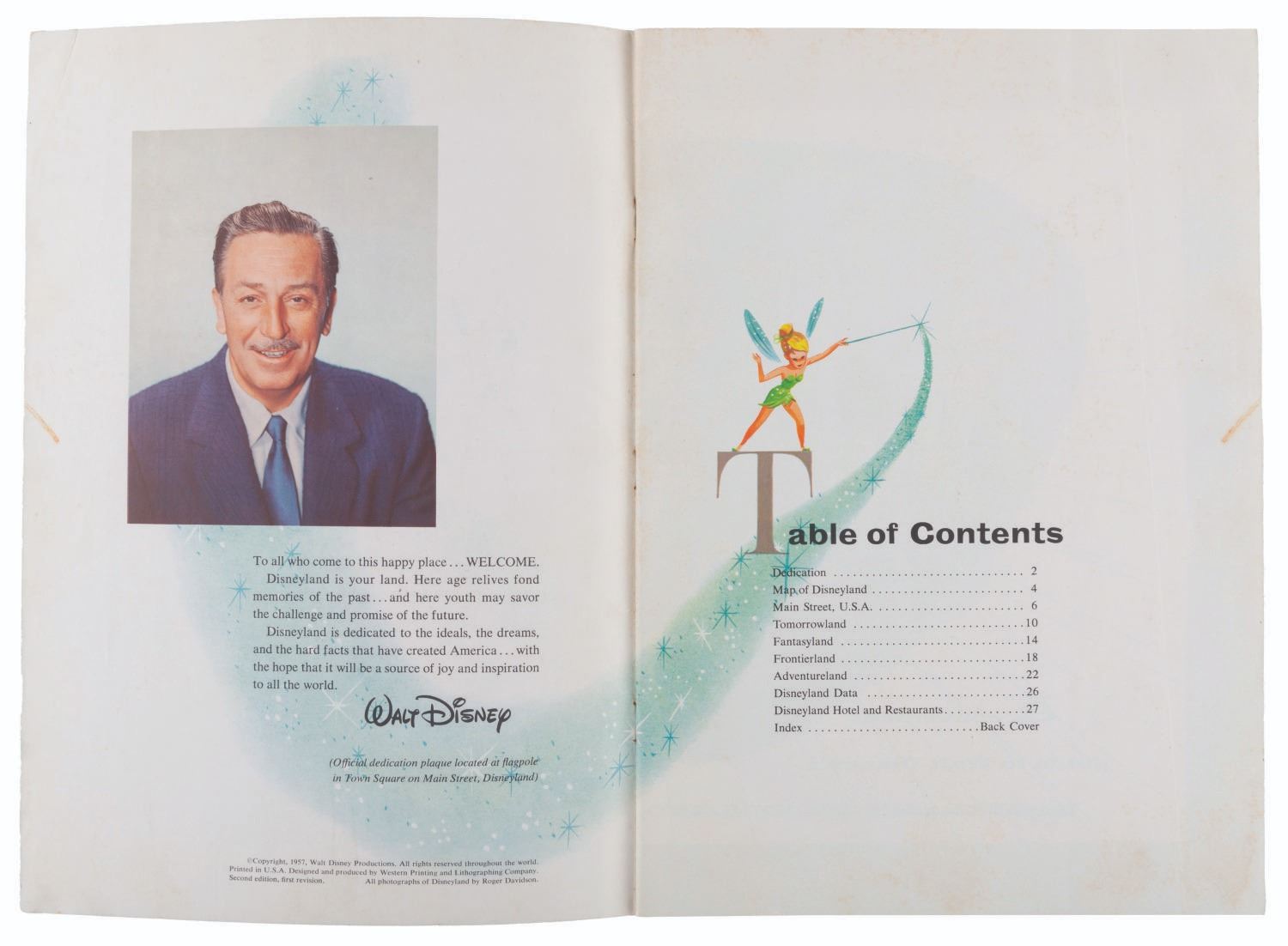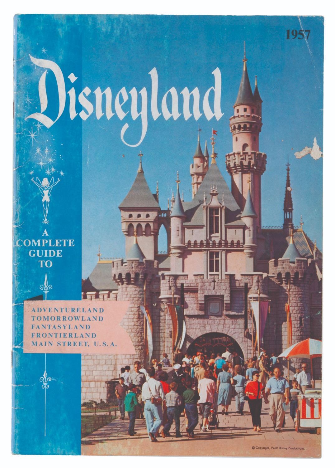 (Disneyland, 1957) An early Complete Guide to Disneyland book. The 27-page souvenir guidebook provides illustrations, full-color photographs, and maps of the Park. Measuring 8” x 11.5”, the guidebook is in good condition, with scuffing and wear to the cover including a .75” spot of paper loss to the front.
