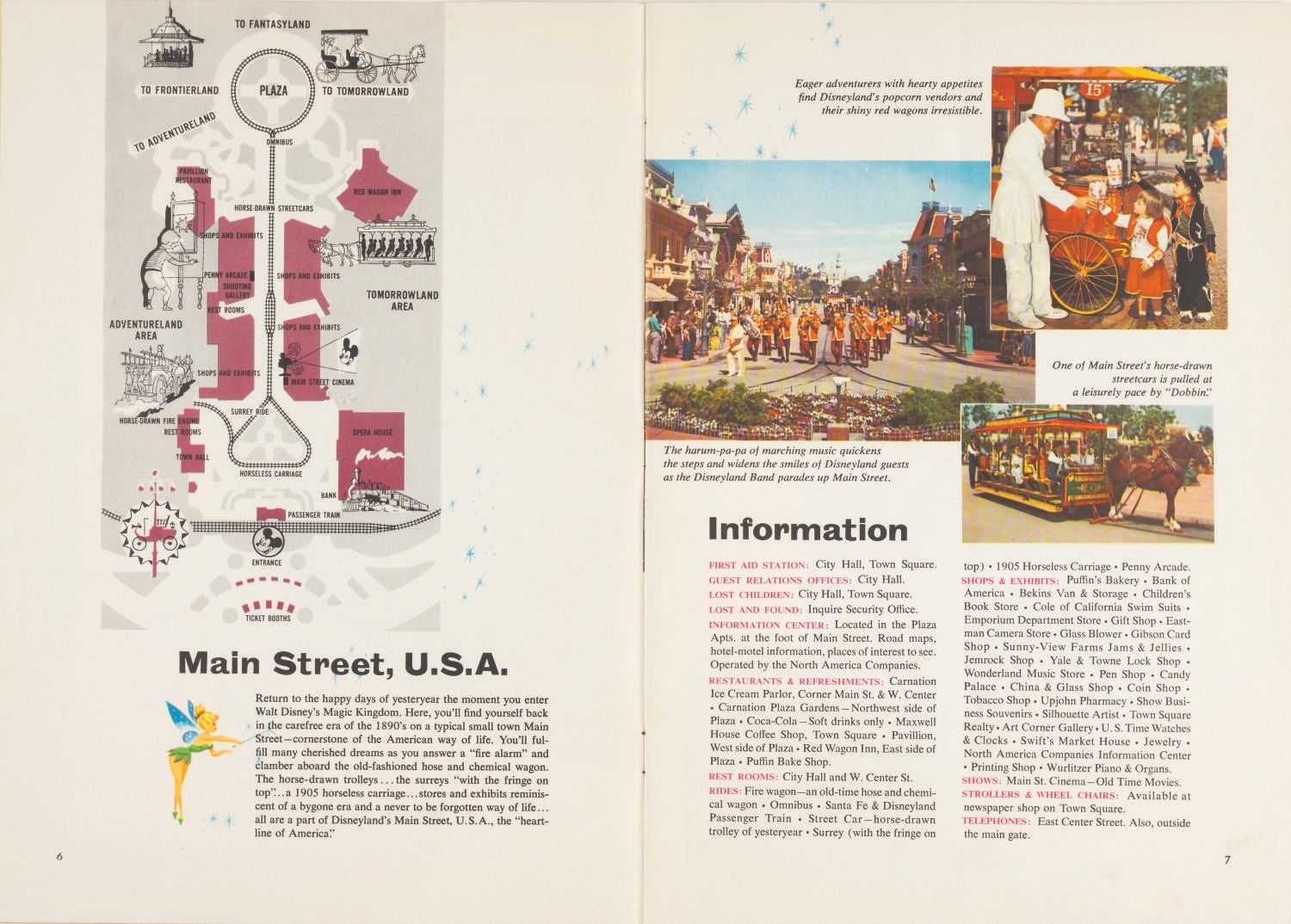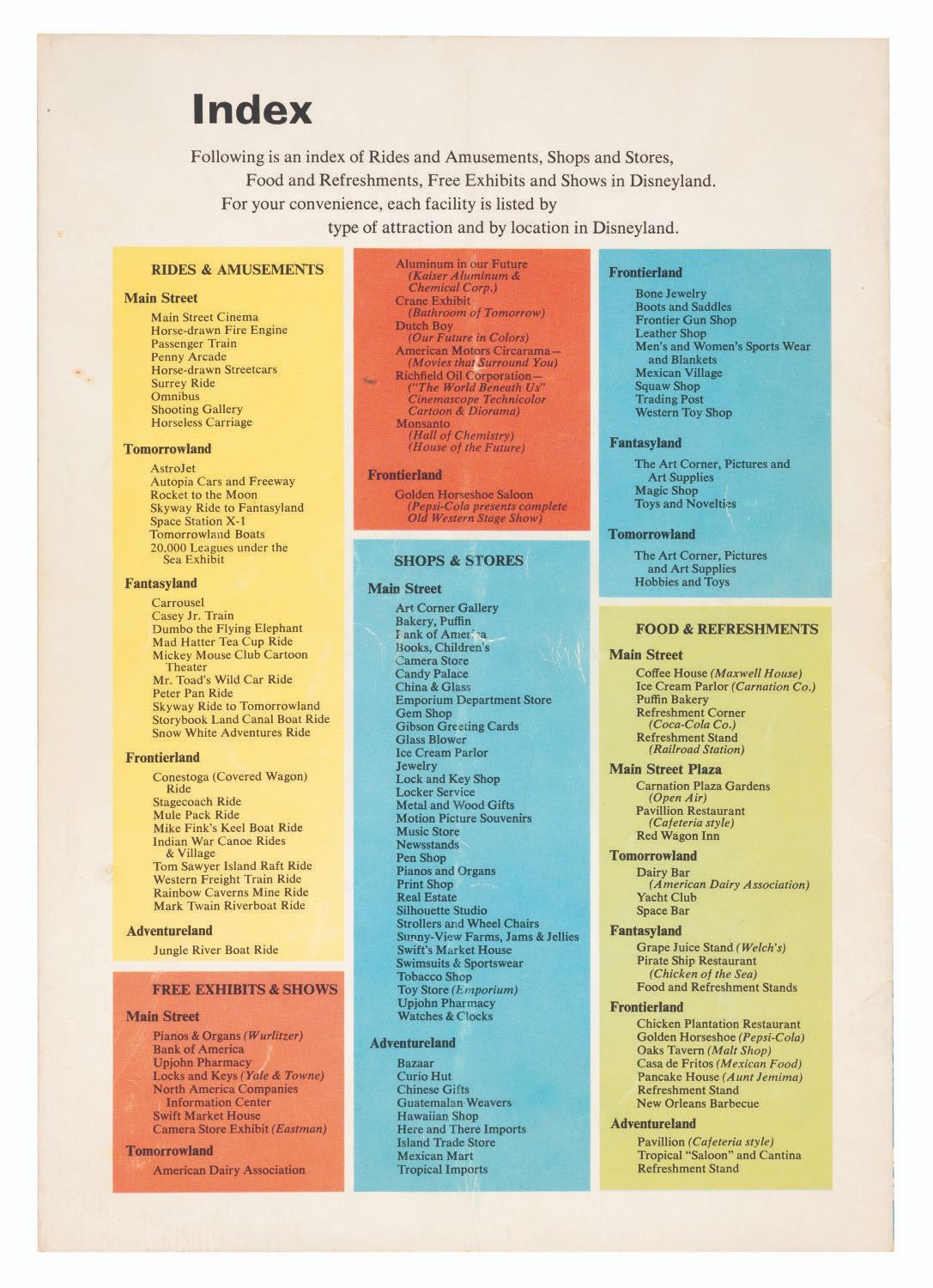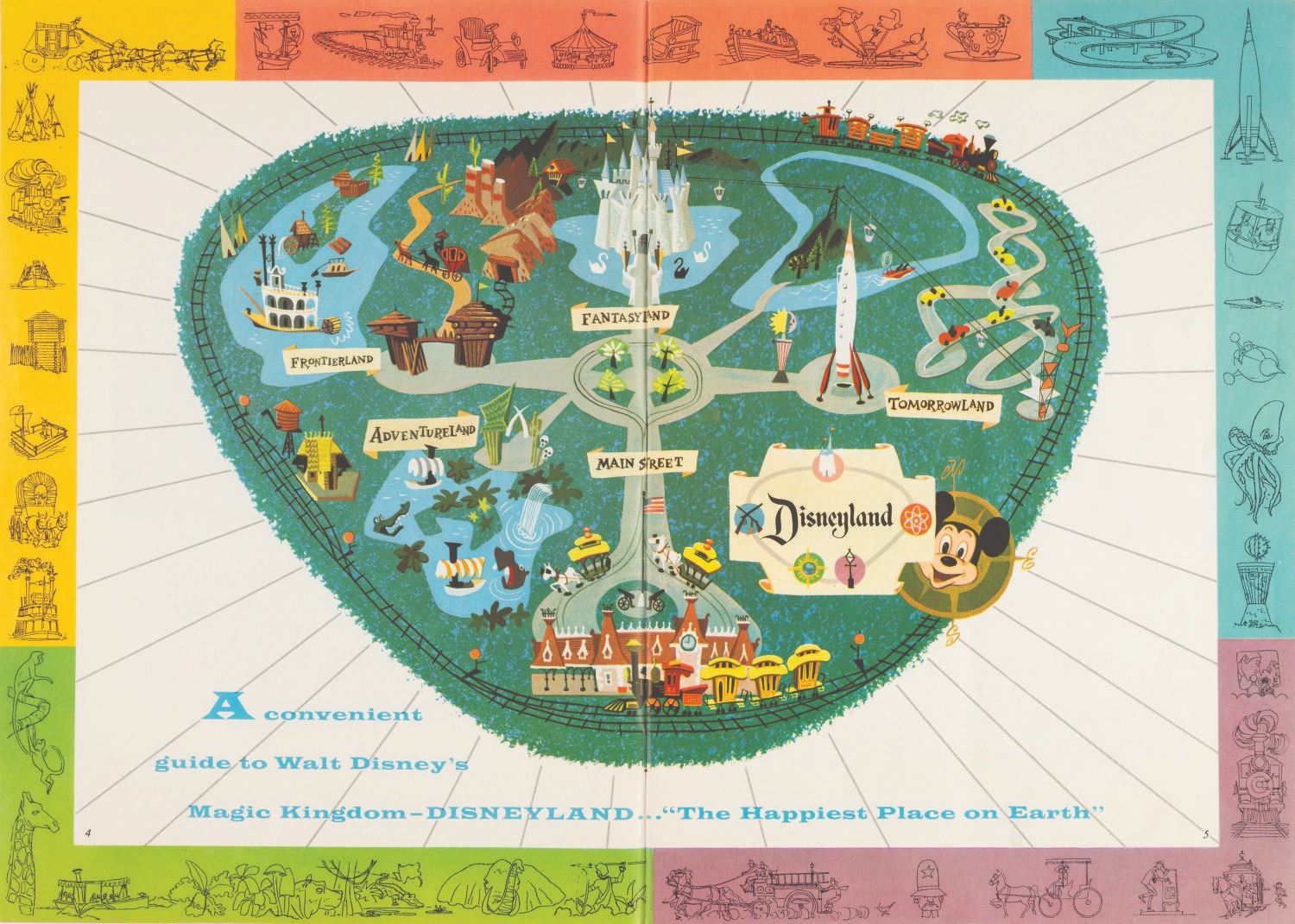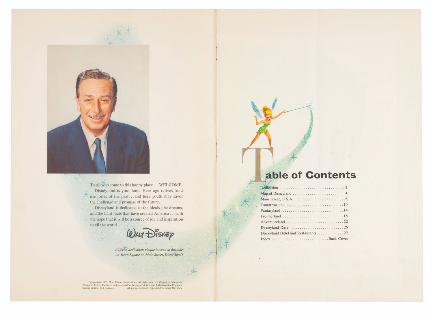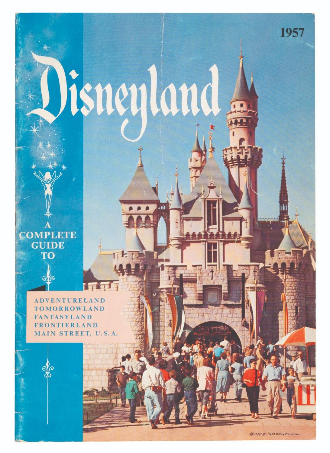 (Disneyland, 1957) An early Complete Guide to Disneyland book. The 26-page souvenir guidebook provides illustrations, full-color photographs, and maps of the Park. Measuring 8.25" x 11.5", the book is in good condition with surface wear, creasing to the spine and cover from use, and a vertical crease from being folded down the middle.