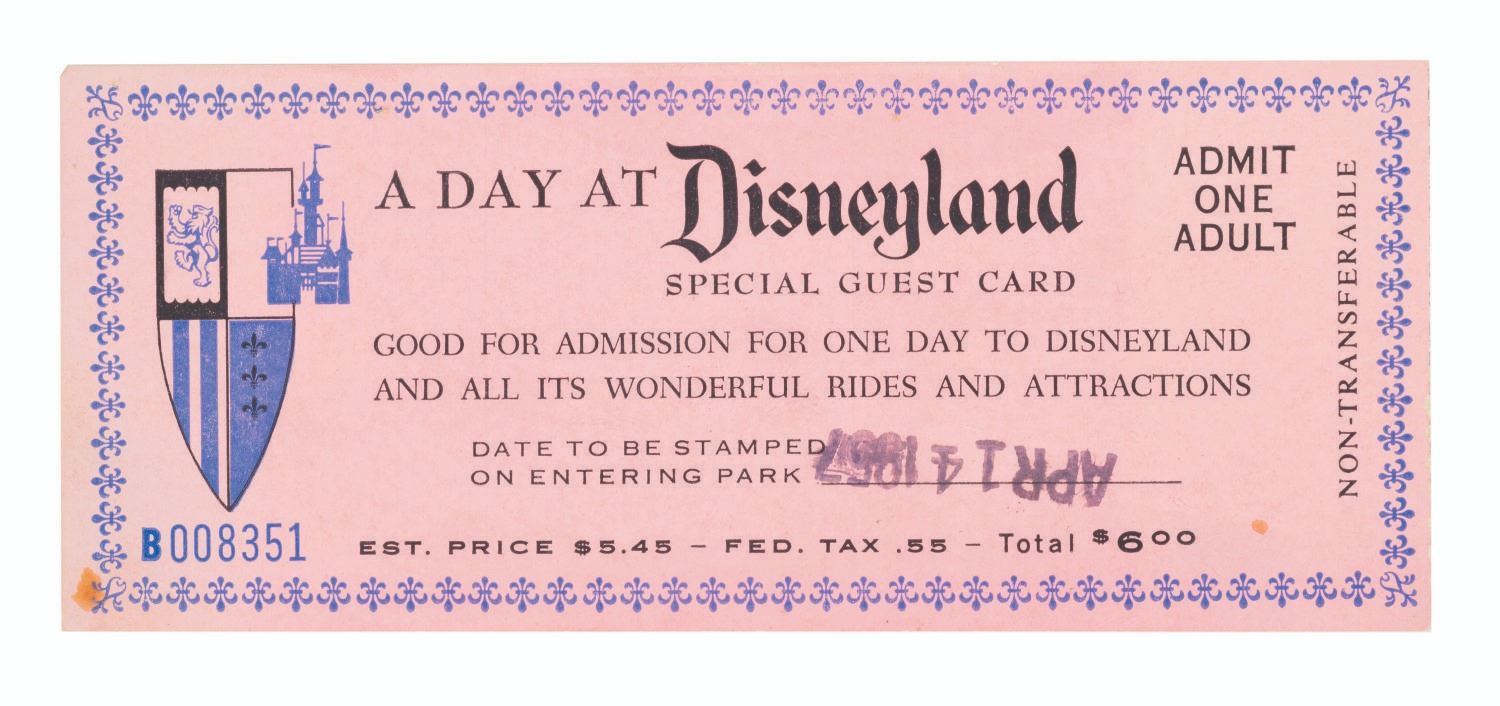 (Disneyland, 1957) A Day at Disneyland Special Guest Card Adult Admission ticket. The used ticket has a face value of $6.00 and has been stamped “April 14, 1957.” Measuring 6” x 2.5”, the ticket is in very good condition with the stub removed, a few spots of discoloration, tape on the reverse, and minor wear.