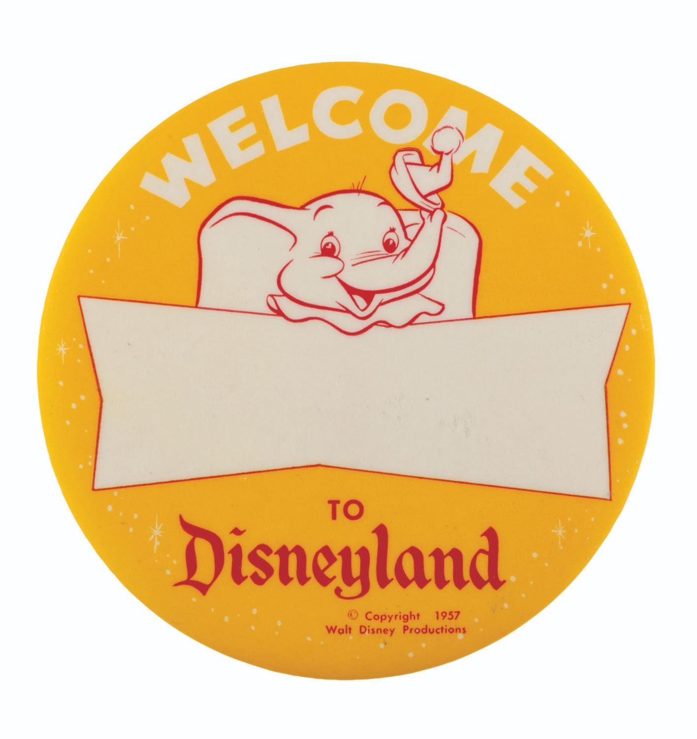 (Disneyland, 1957) An early souvenir pinback button from Disneyland featuring Dumbo with a space to write a name. Measuring 3.5 " in diameter, the button is in very good condition with wear from handling and age.