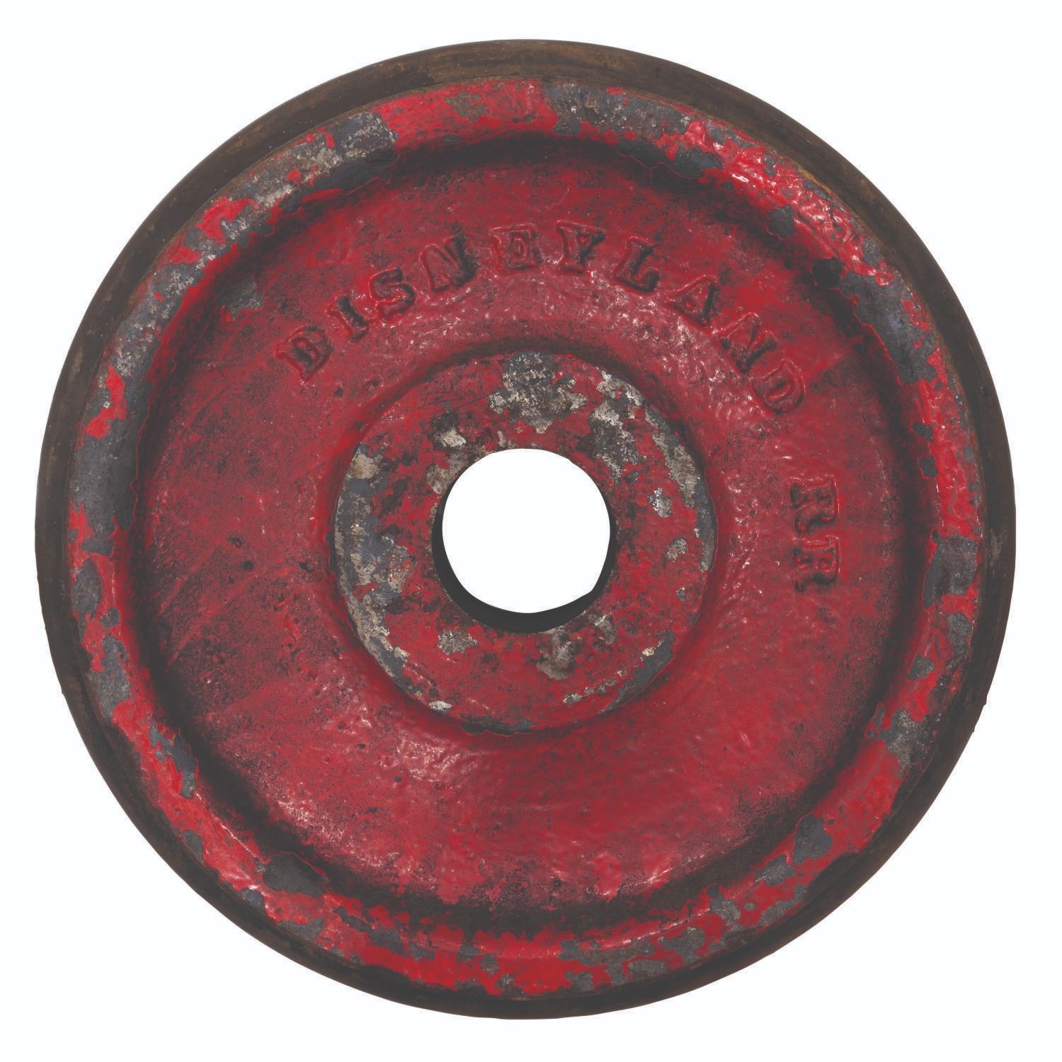 (Disneyland, 1957) An original wheel from the Disneyland Railroad. Walt knew he wanted a railroad at his Park from the earliest beginnings of Disneyland, and the Disneyland Railroad continues to bring enjoyment to generations of Guests since it first opened along with the Park in 1955. Original artifacts used by the Disneyland Railroad are exceptionally rare, and few are as desirable as these stylish and easily identifiable red and black wheels. This sturdy metal wheel is embossed with the text "Disneyland Railroad" on the front, measuring 19" in diameter and 4.5" thick. The metal wheel is in good condition with heavy paint loss, oxidation, and typical wear from Park use. The back side of the wheel has a few embossed identifiers, including the month and year it was cast, "11 57". Due to size and weight, special shipping arrangements are required. Please inquire before bidding.