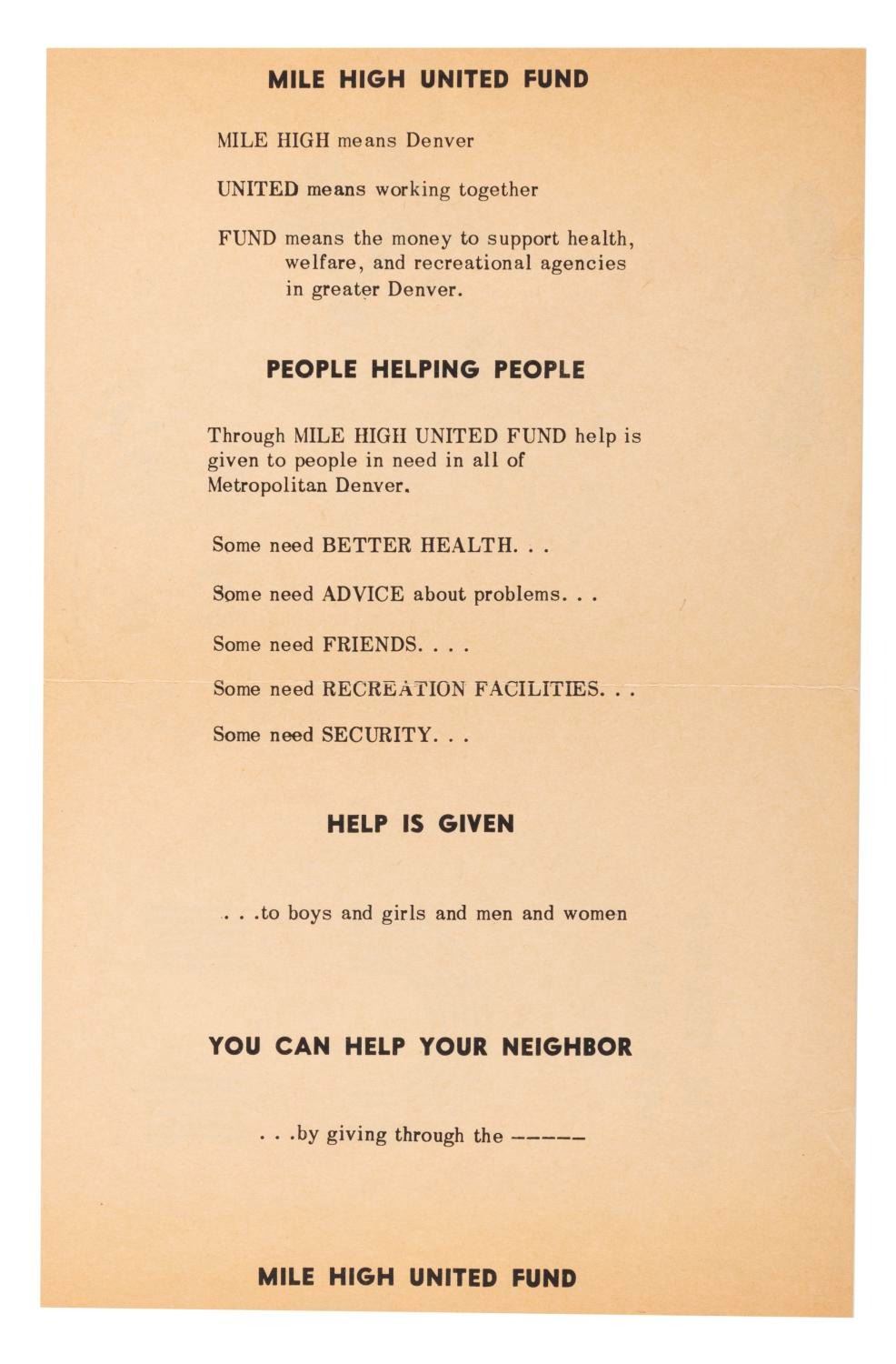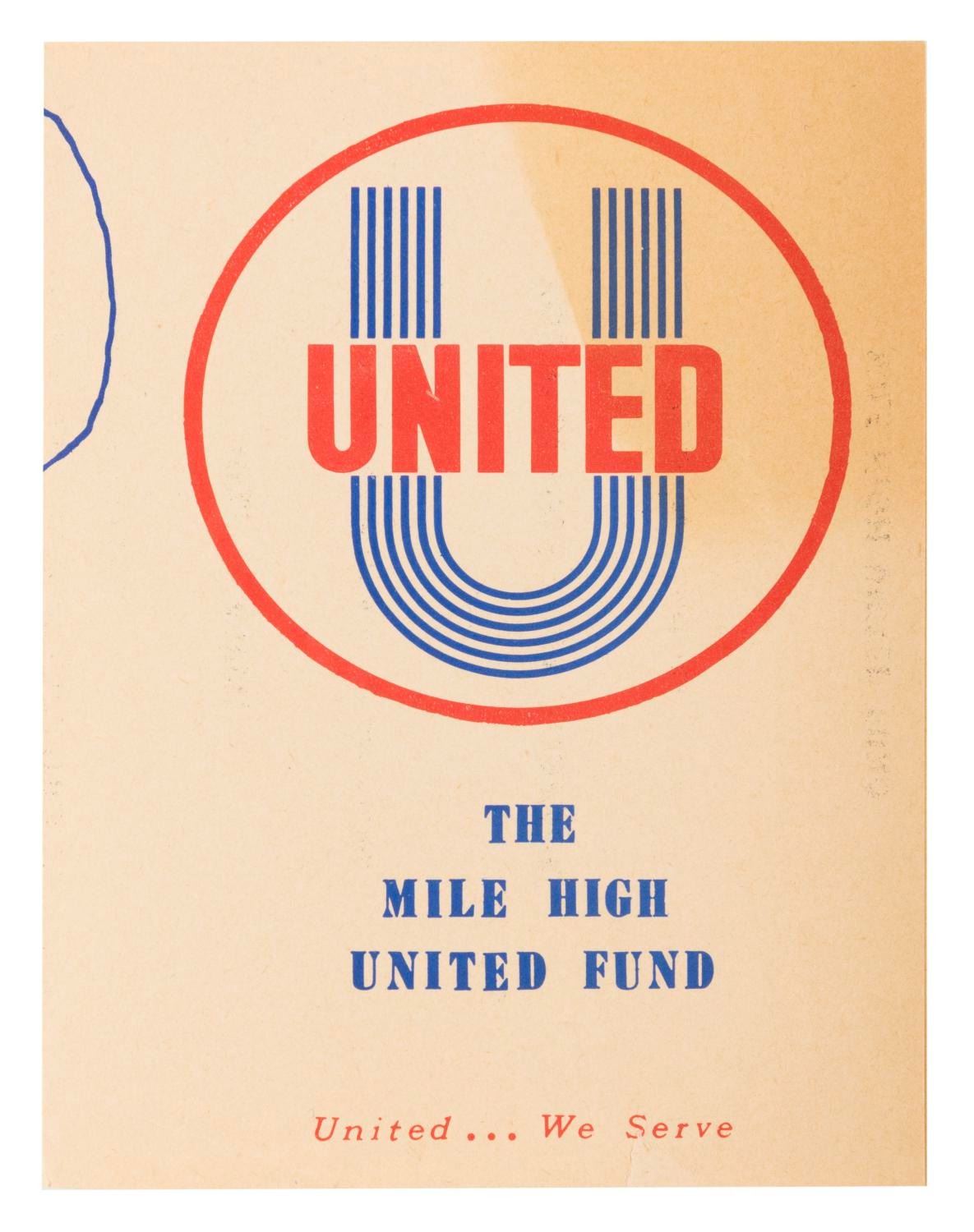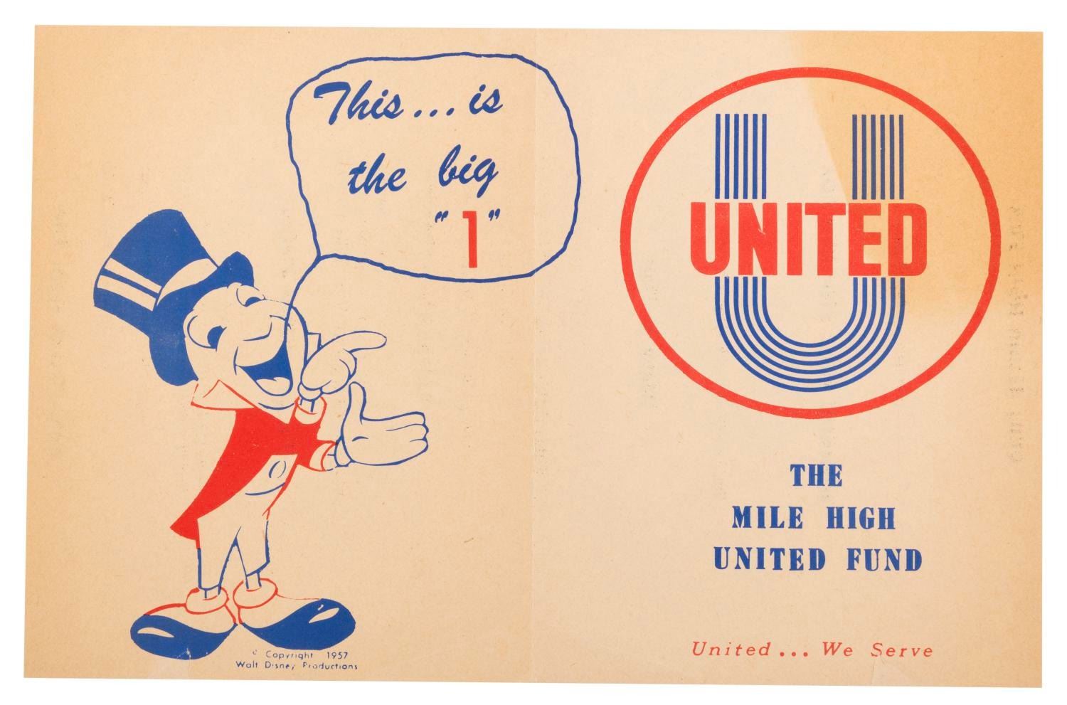 (Mile High United Fund, 1957) A flier for the Mile High United Fund featuring Jiminy Cricket from "Pinocchio." Measuring 5.5" x 8.5", the flier is in good condition with a full vertical fold, handling wear, and heavy discoloration from age on the right.