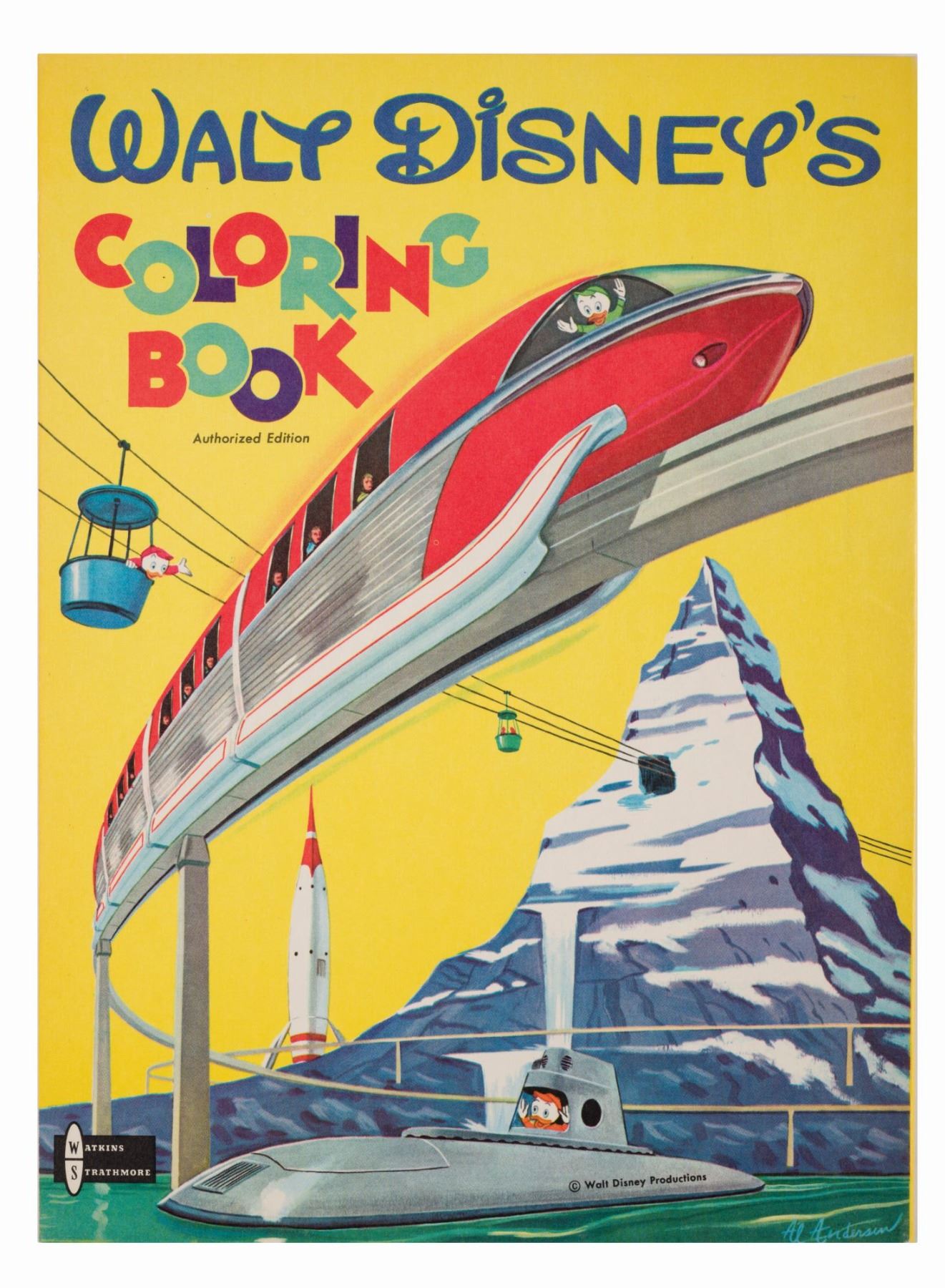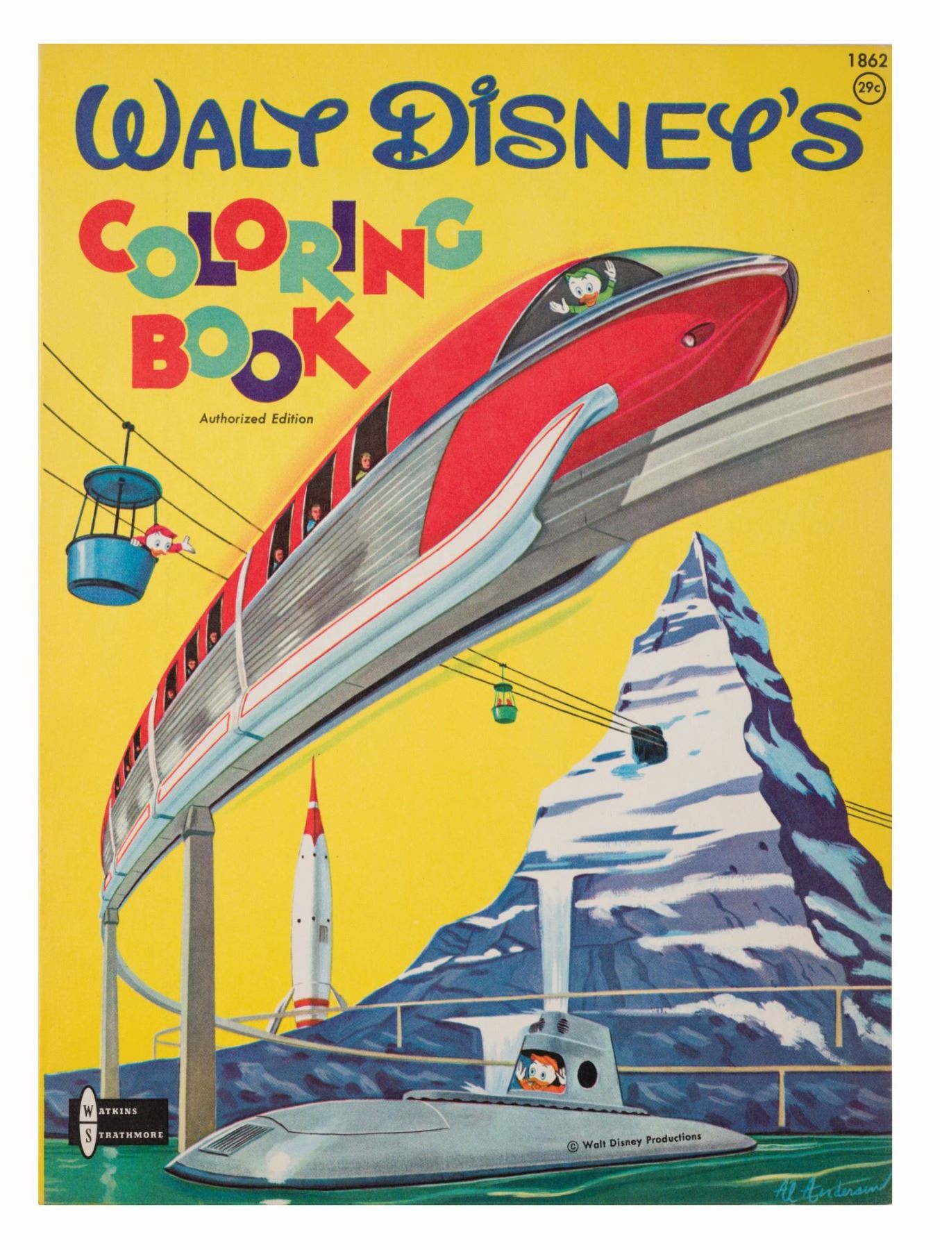(Watkins Strathmore, 1957) A 1957 Disneyland coloring book, with a cover featuring the Monorail, Matterhorn, and Submarine, due to open in 1959. This coloring book is in fine condition, with no coloring or handling wear, just the pages slightly off-white as is typical.