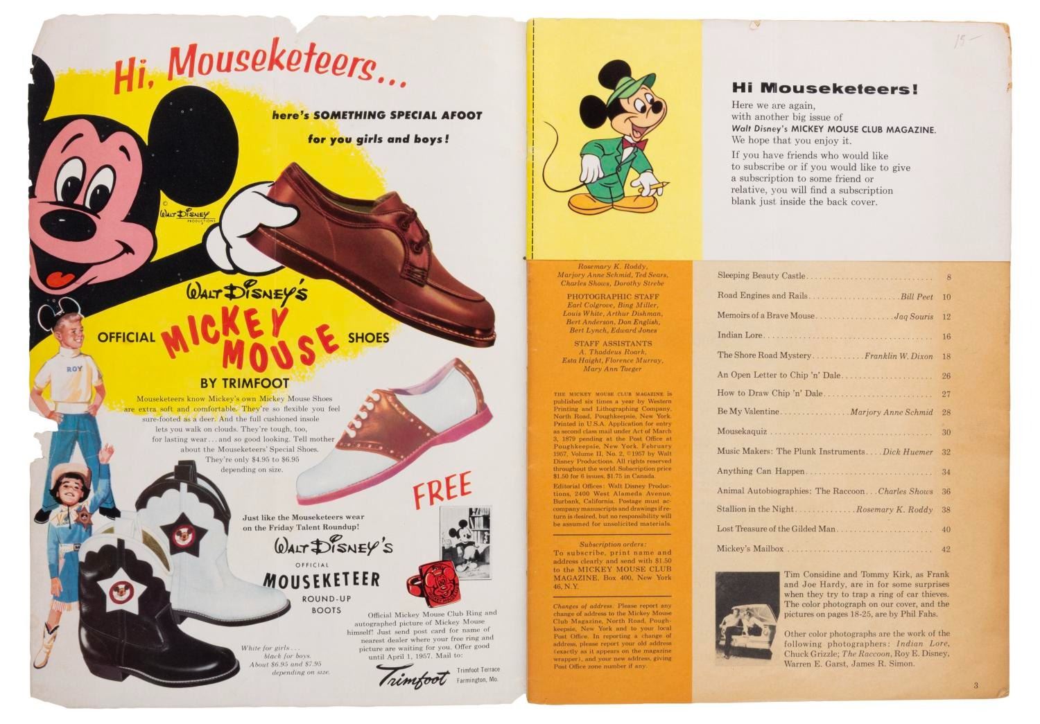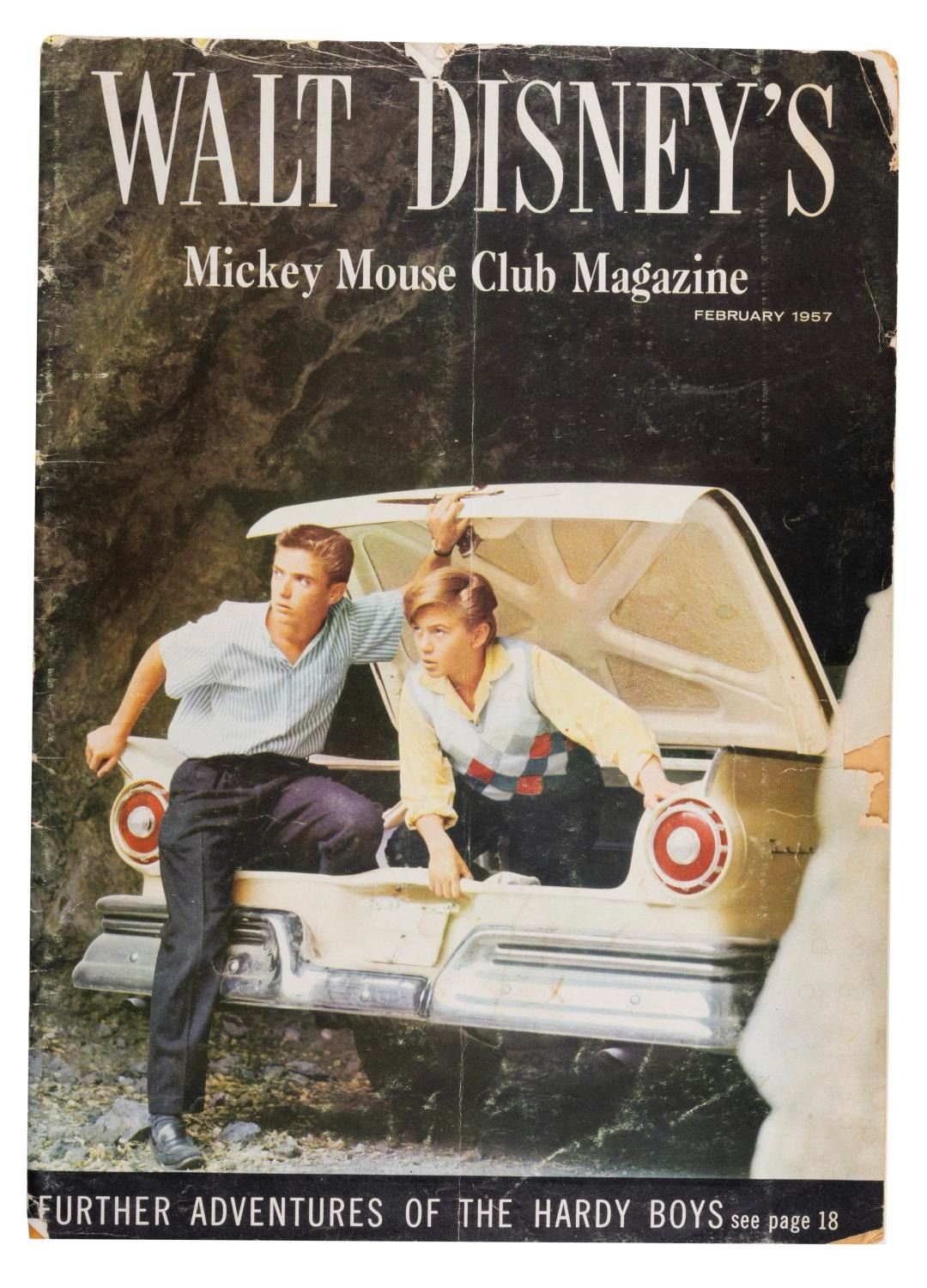 (Disney, 1957) Vol. 2 No. 2 of Walt Disney’s Mickey Mouse Club magazine from February 1957, with a cover story on "The Further Adventures of the Hardy Boys." The magazine is in fair condition with edge wear, including chipping on the right and at corners, a vertical fold to the cover, and typical browning from age.