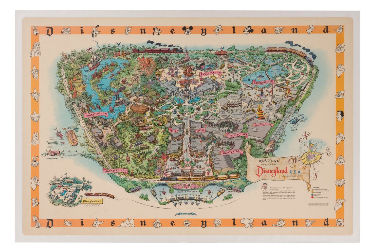 (Disneyland, 1958) A rare "A" version of the souvenir map of Disneyland from 1958. Designed by Walt Disney Imagineer Sam McKim, this is the first large format souvenir map made available for sale at the Park. This rare "A" version of the 1958 map is the only map to depict the Jungle Cruise River in green and the Viewliner over the Tomorrowland Lagoon, and the Junior Autopia. This is also the only version not to include the Matterhorn and Monorail. Measuring 45"x34", the map is in fine condition, paper slightly off-white from age, with very light chipping to edges and corners, (2) slight scuffs, and linen-backed for preservation.