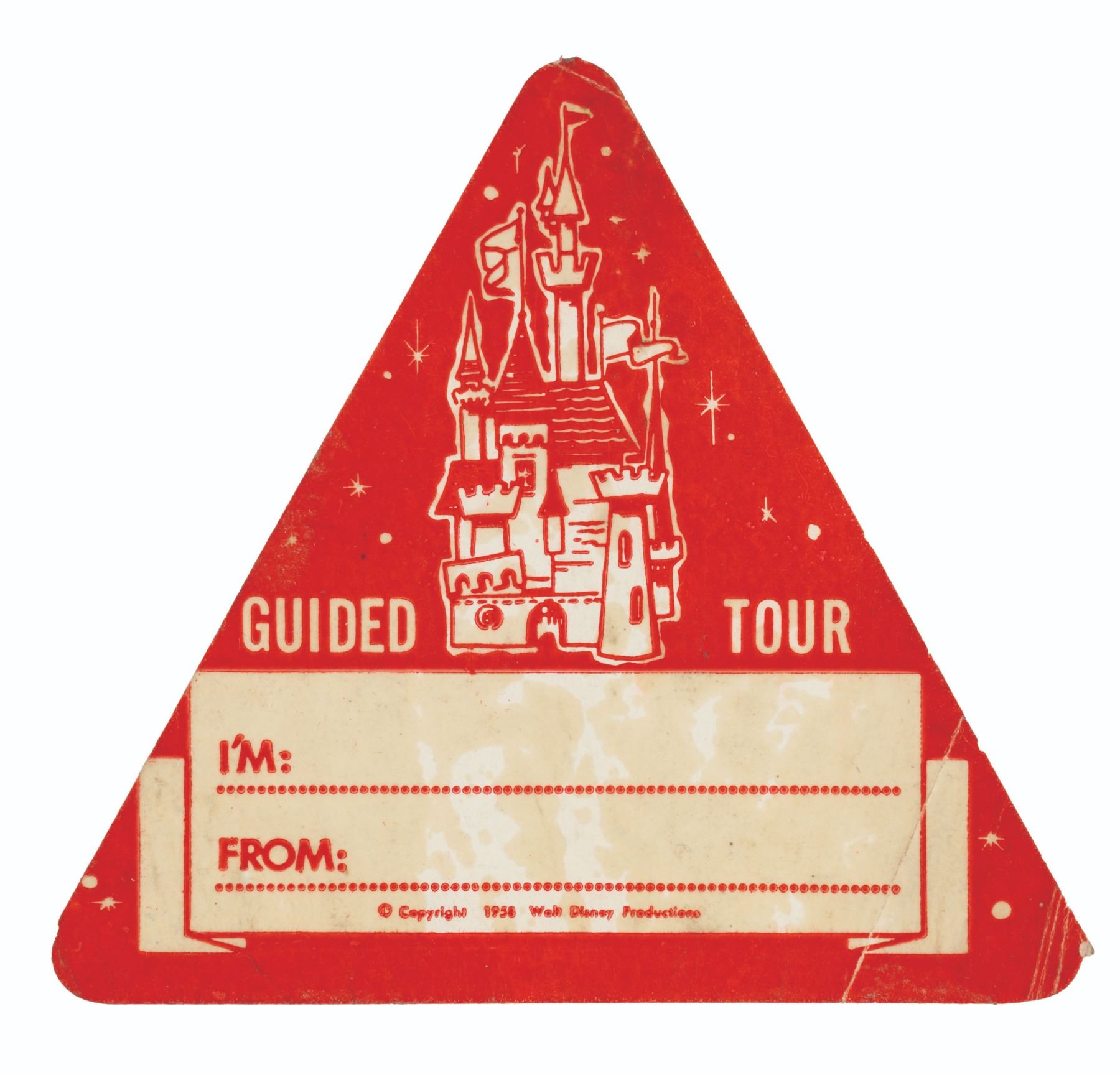 (Disneyland, 1958) A Guided Tour name tag worn by a Guest enjoying the 105-minute tour of the Park offered for only $3.50 in 1958. Normally this sticker would have been used and discarded; this blank one has been applied to a piece of cardboard for preservation. Measuring 3.75" x 3.5", the sticker displays in good condition, with some wear from use including a crease to the right corner, and browning from age.
