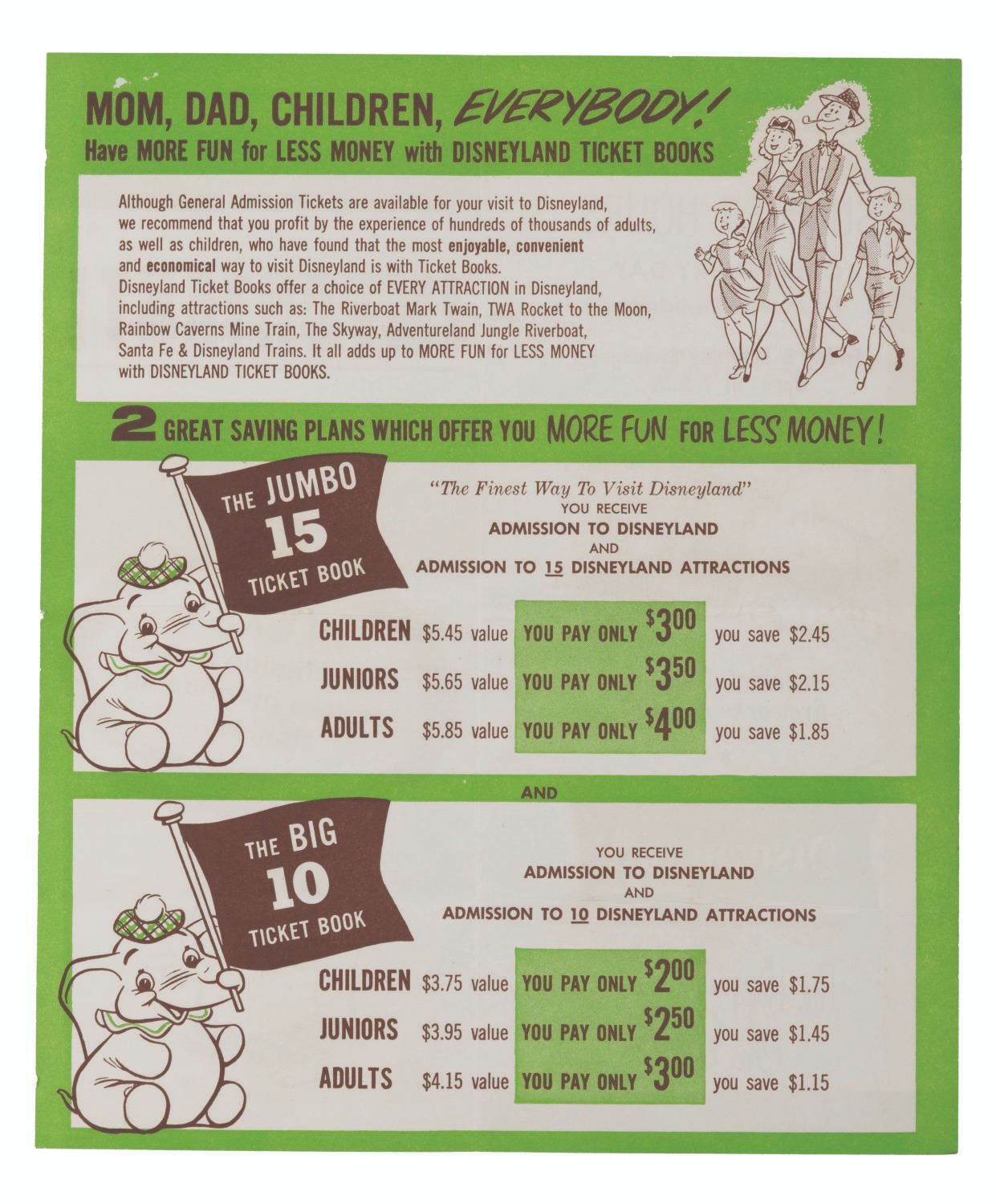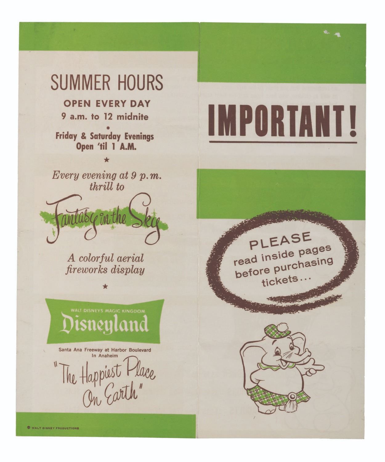 (Disneyland, 1958) A very rare Disneyland Main Gate flyer for Jumbo 15-ticket books and Big 10-ticket books. The flyer advertises the Park’s Fantasy in the Sky fireworks display and lists attractions such as the Rainbow Cavern Mine Trains, the Skyway, and the TWA Rocket to the Moon. Measuring 8.5" x 10.25" unfolded, the flyer is in good condition with creases, folds, staple holes, and light discoloration from age.