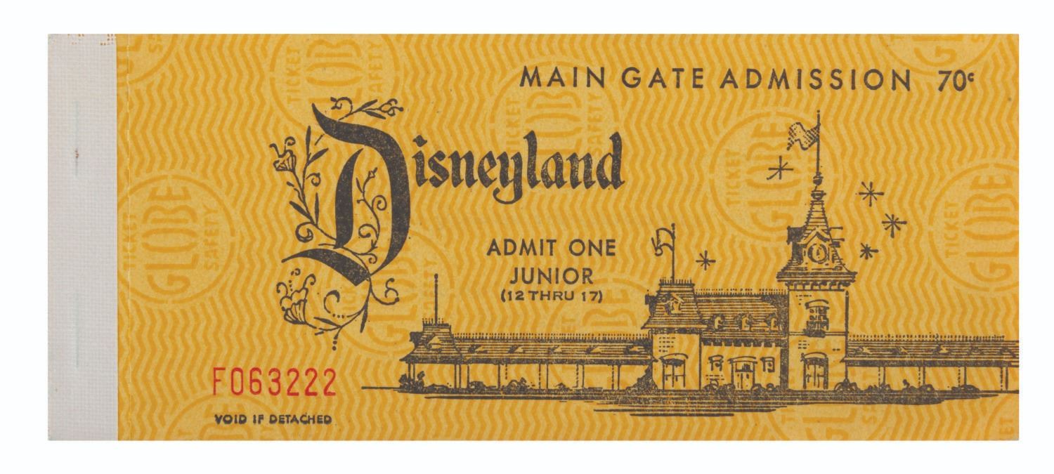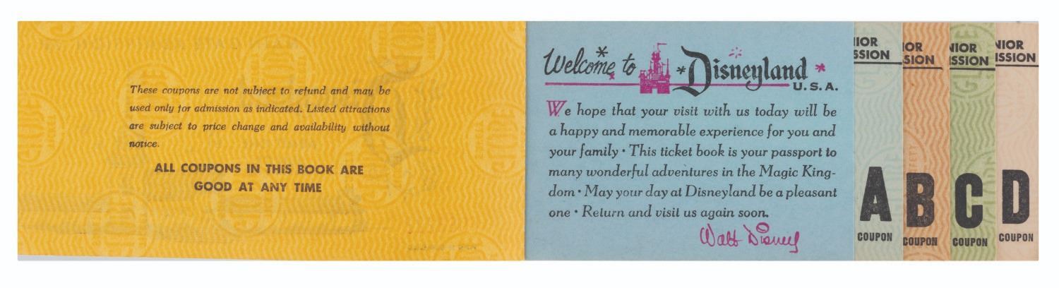 (Disneyland, 1958) A very rare complete Junior Admission and 15-ride Jumbo ticket book from 1958. The book includes the Main Gate Ticket, Welcome to Disneyland tab, 3 “A” tickets, 3 “B” tickets, 4 “C” tickets, and 5 “D” tickets. Numbered “F063222,” the 2.5” x 6” ticket book is in very fine condition.