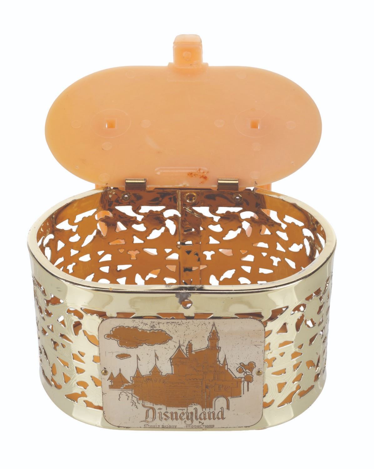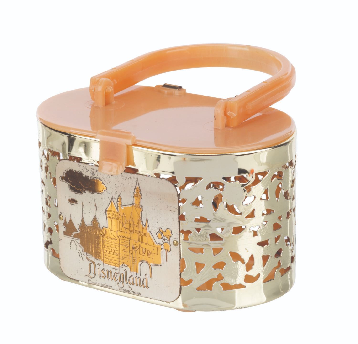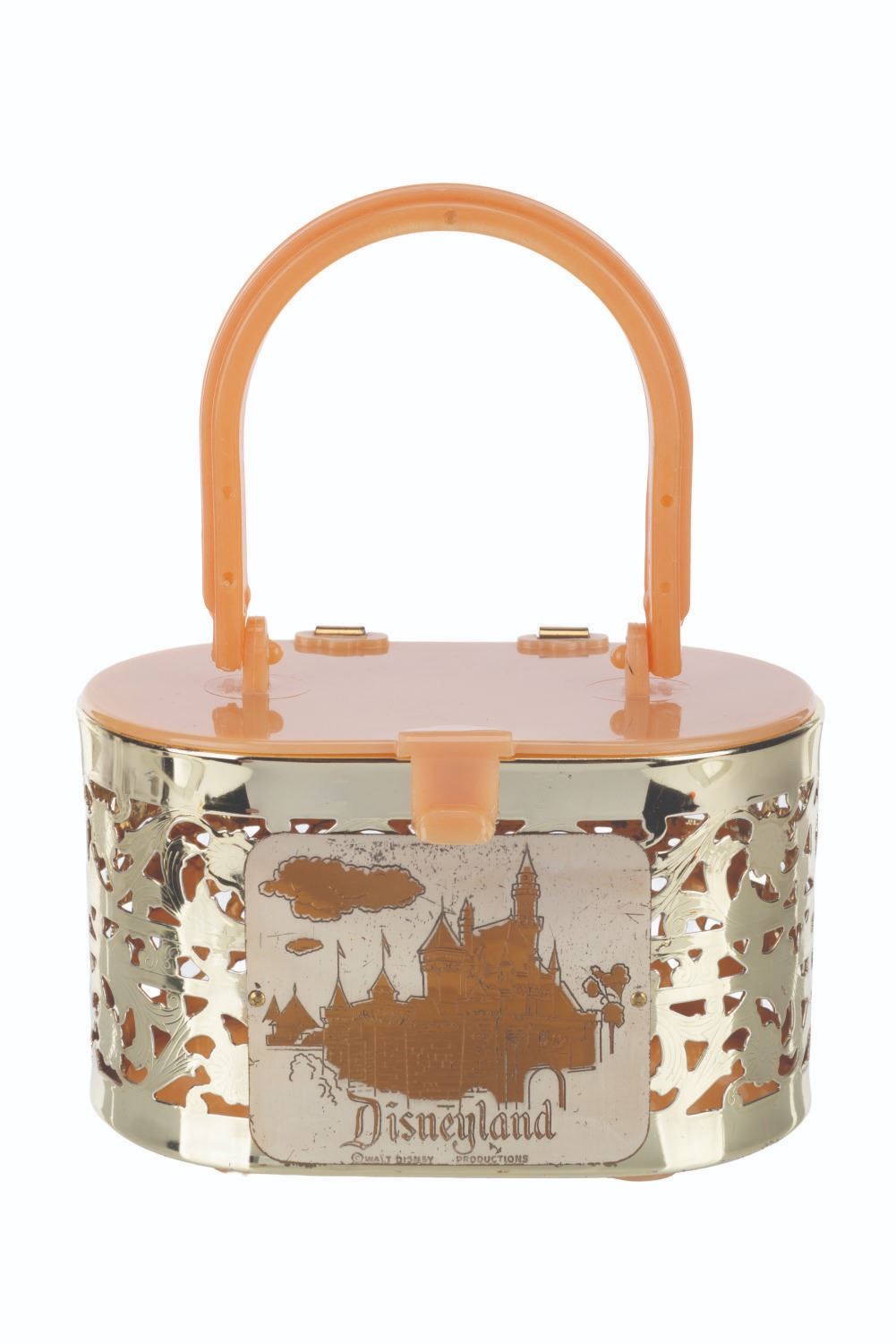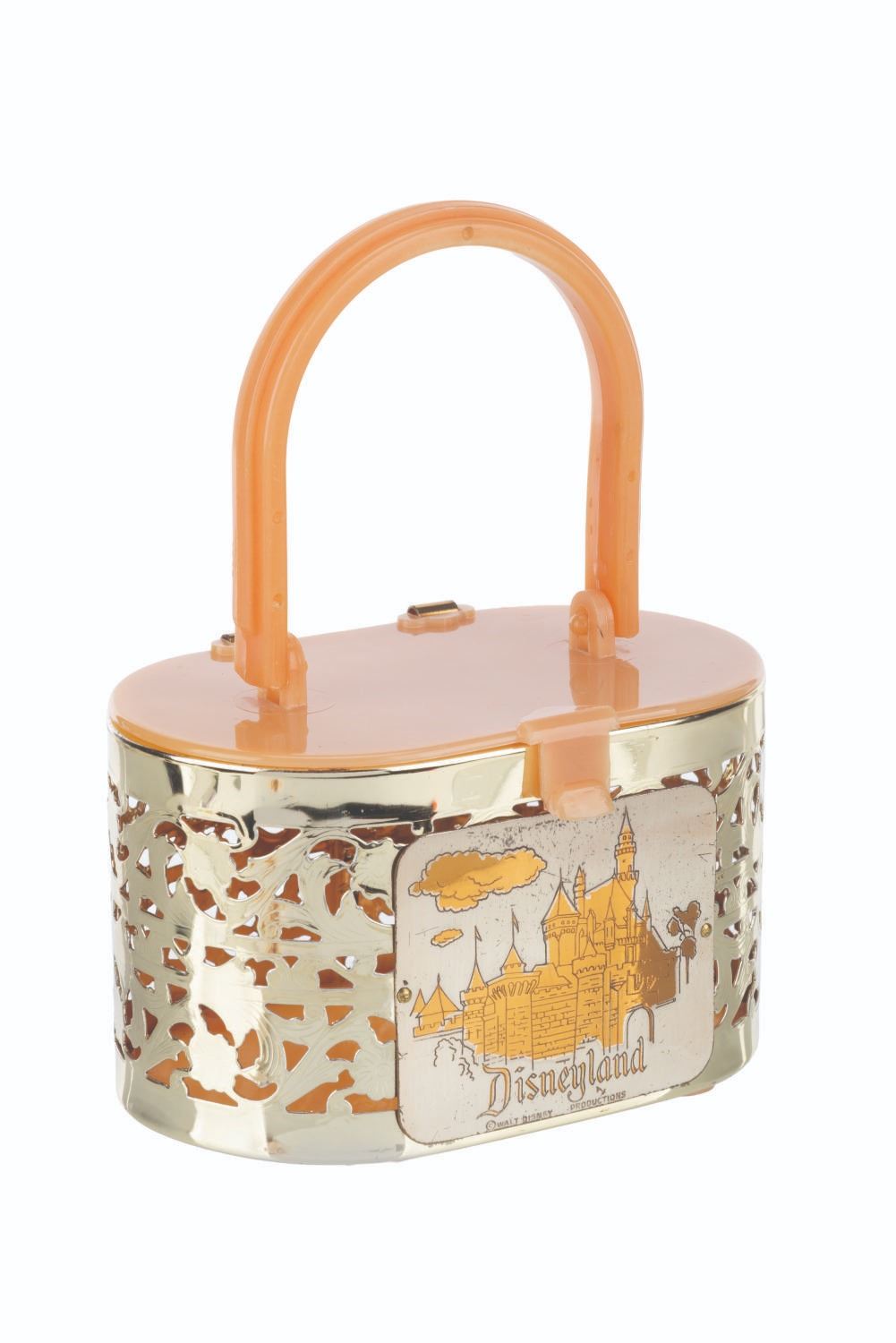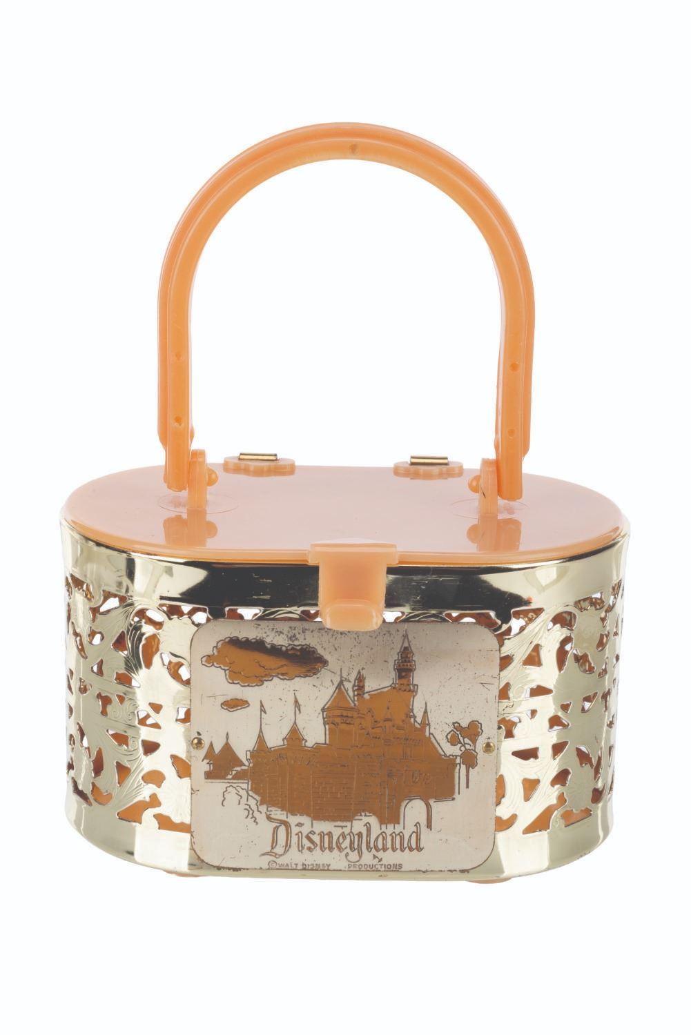 (Disneyland, 1958) A souvenir purse featuring an emblem of the Disneyland Castle and logo. Measuring 3.25” x 5” x 3.25” high with a 3.5” handle, the souvenir is in very good condition with light wear from use, including small scratches to the castle emblem.