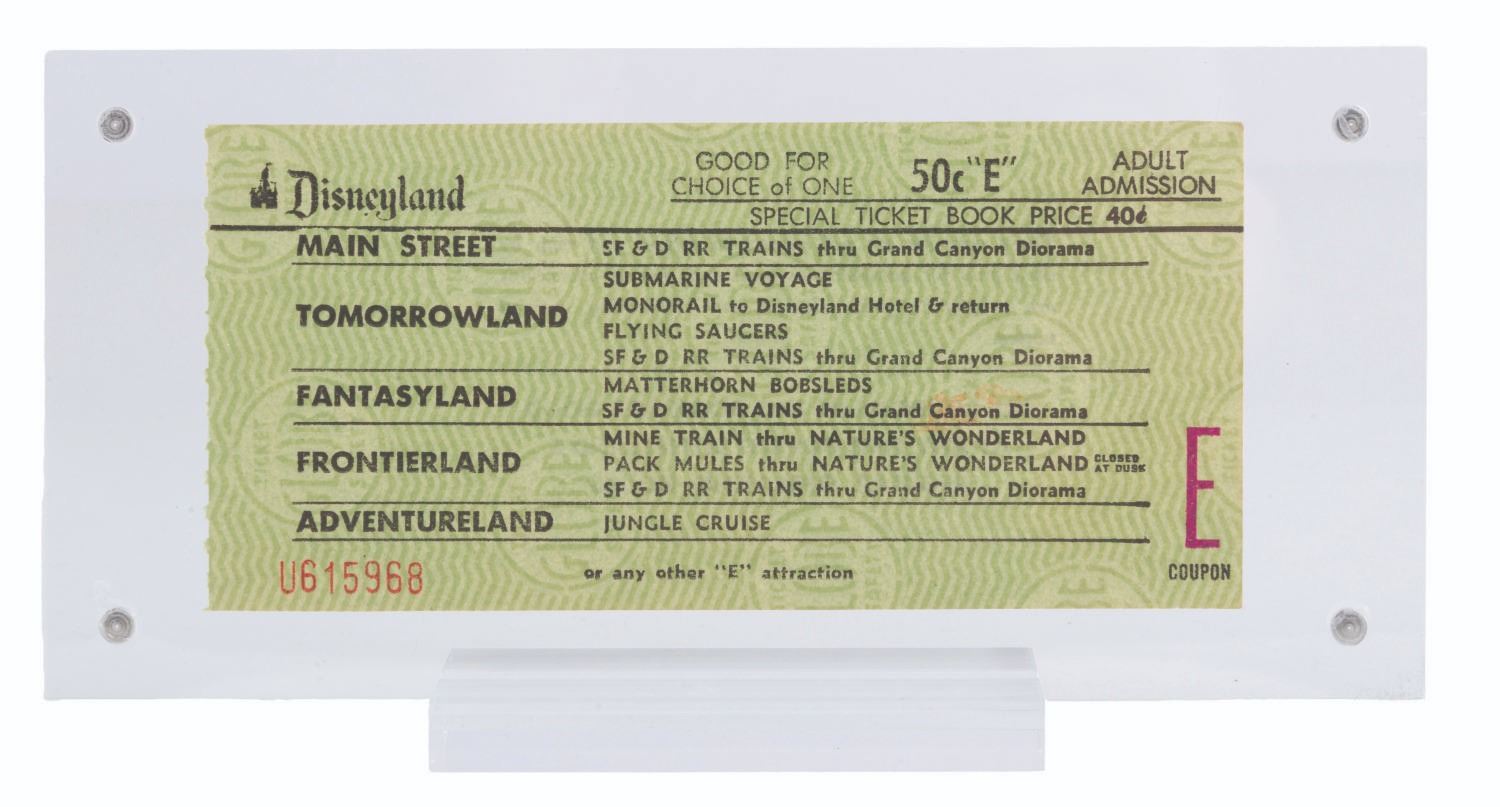 (Disneyland, 1959) An original"E” ticket from the year they were introduced. Disneyland tickets expanded up to"E” with the addition of the Submarine Voyage, Monorail, and Matterhorn Bobsleds. Measuring 2.5” x 5.5” in a 3.75” x 7.25” acrylic display holder, the ticket is in very good condition with slight edge wear from original handling and separation from the ticket book, and faint ink transfer visible on the back.