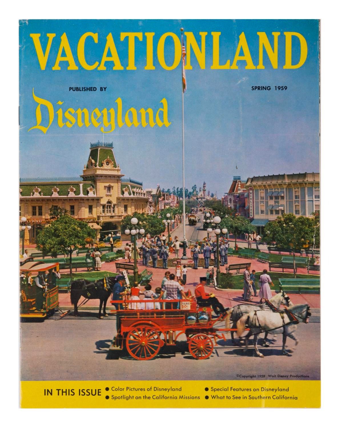 (Disneyland, 1959) The Spring 1959 issue of Disneyland's Vacationland magazine. Articles focus on Adventureland and Disneyland live music, with many advertisements for other California tourist spots including Knott's Berry Farm. Measuring 8.75"x10.75", the magazine is in good condition, with slight creases and wear.